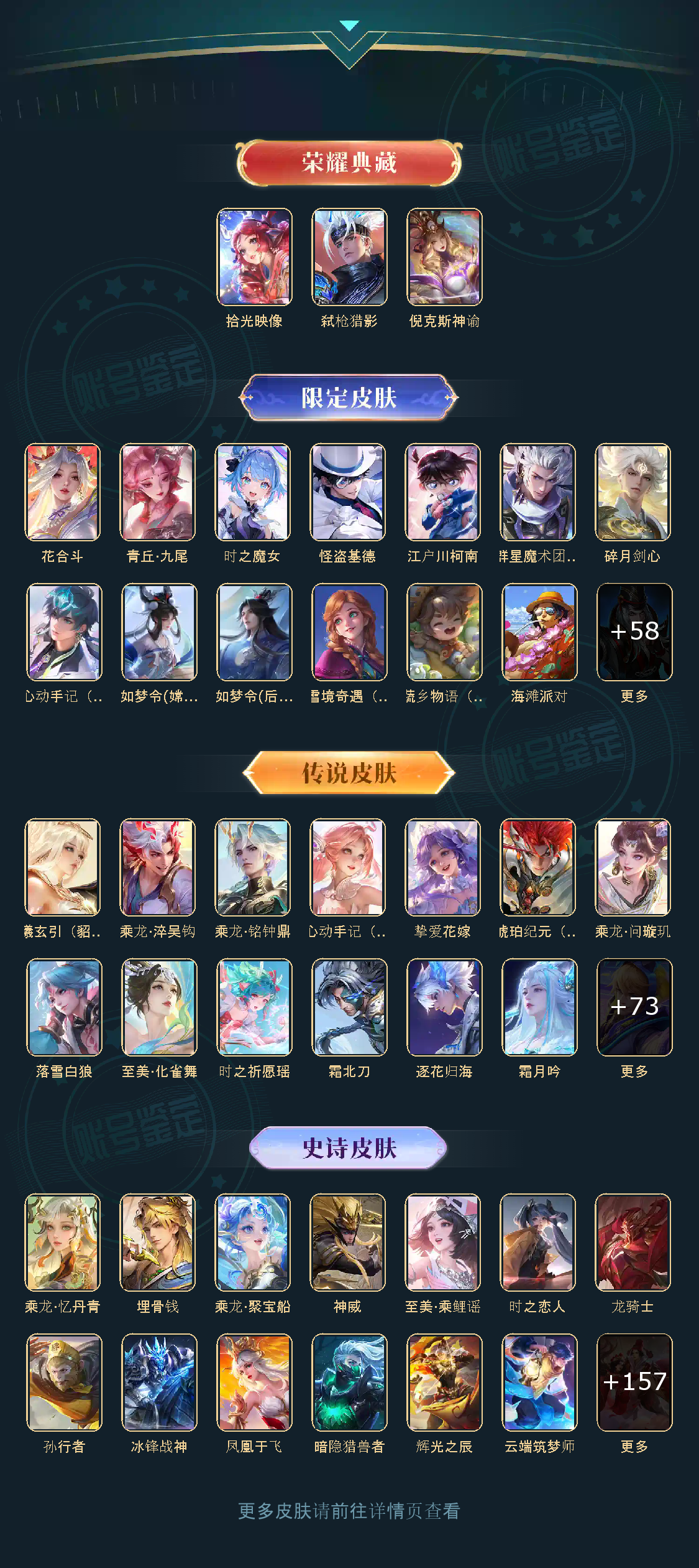 拾光映像,弑枪猎影,群星魔术团(韩信),碎月剑心,青丘·九尾,时之魔女,天魔缭乱,白虎志,李逍遥,默契交锋(花木兰),怪盗基德,炽阳神光,江户川柯南,乘龙·问璇玑,乘龙·淬吴钩,乘龙·铭钟鼎,乘龙·聚宝船,乘龙·忆丹青,神威,冥王哈迪斯,心动手记(朵莉亚),落雪白狼,无双飞将,至美·化雀舞,时之祈愿瑶,挚爱之约,挚爱花嫁,花合斗,霜北刀,逐花归海,琥珀纪元(马超),至美·乘鲤谣,曦玄引(貂蝉),霜月吟,妄想实况,埋骨钱,黄金天蝎座,夜礼服假面,补天,惊梅引,异界灵契,启示之音,心动手记(海诺),神树通天