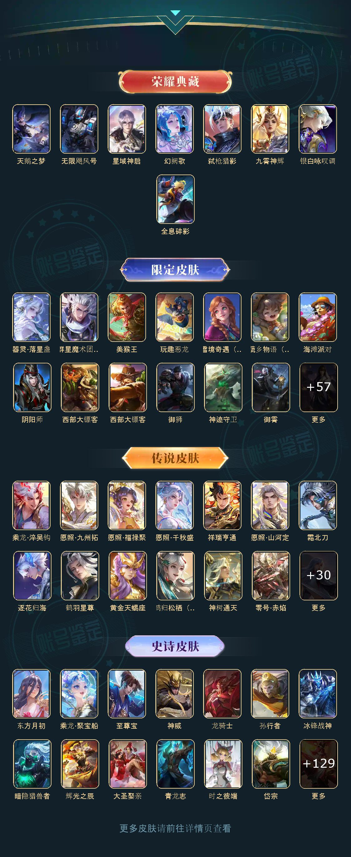 天鹅之梦,无限飓风号,星域神启,幻阙歌,弑枪猎影,九霄神辉,银白咏叹调,群星魔术团(韩信),零号·赤焰,乘龙·淬吴钩,乘龙·聚宝船,至尊宝,神威,愿照·九州拓,愿照·福禄聚,霜北刀,逐花归海,器灵·落星盏,鹤羽星尊,愿照·千秋盛,东方月初,黄金天蝎座,祥瑞亨通,神树通天,鹤归松栖(云缨),愿照·山河定