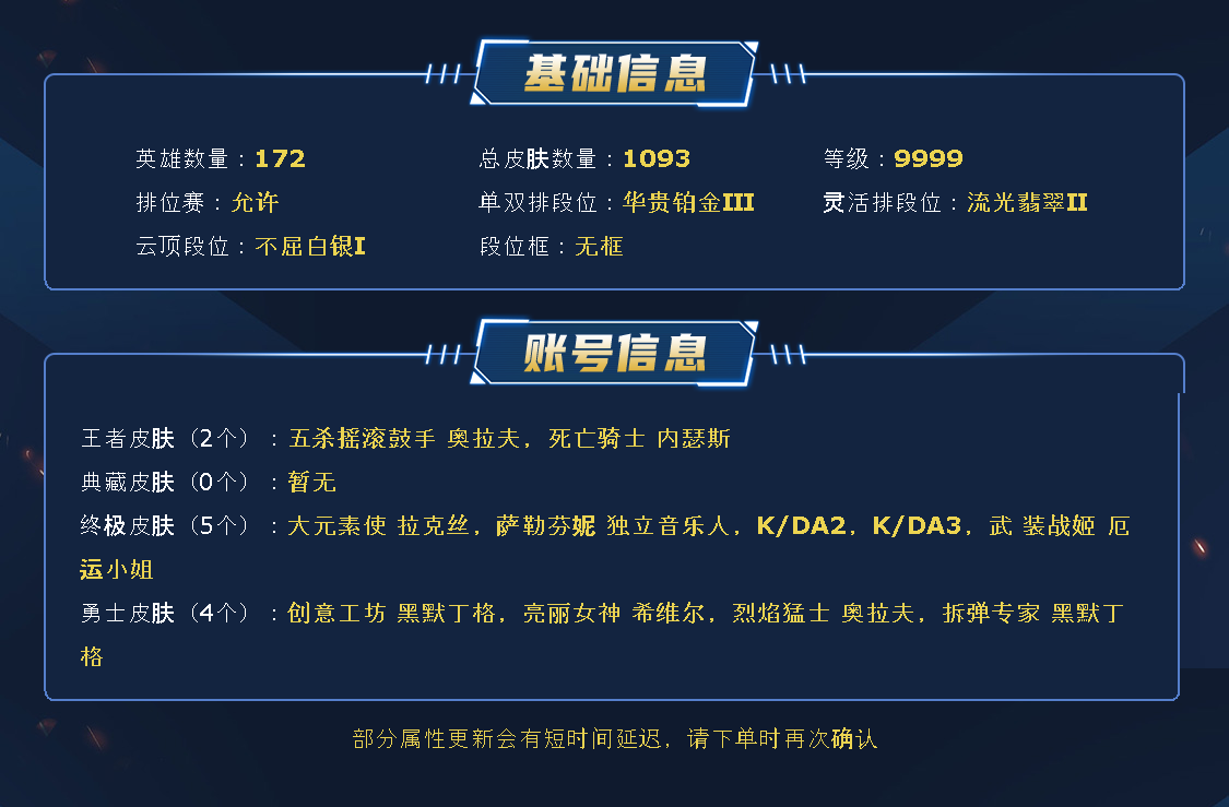 ~~喜欢记得收藏~~可排位~~1100皮全英雄丨50神话/至臻/海克斯丨嫦娥皎月丨御星艾希丨银龙裁决丨北极星皎月丨羊年金克斯丨玉剑无双无极丨神龙尊者李青丨星守卡莎琴女丨KDA卡莎寡妇丨至高天扎克奎桑提丨灵魂莲华锤石狐狸莉莉娅厄斐琉斯~~租之前尽量查一下游戏ID,确保段位是您需要的,避免浪费您的时间~~请勿挂机逃跑故意送人头,谢谢合作,谢谢~~