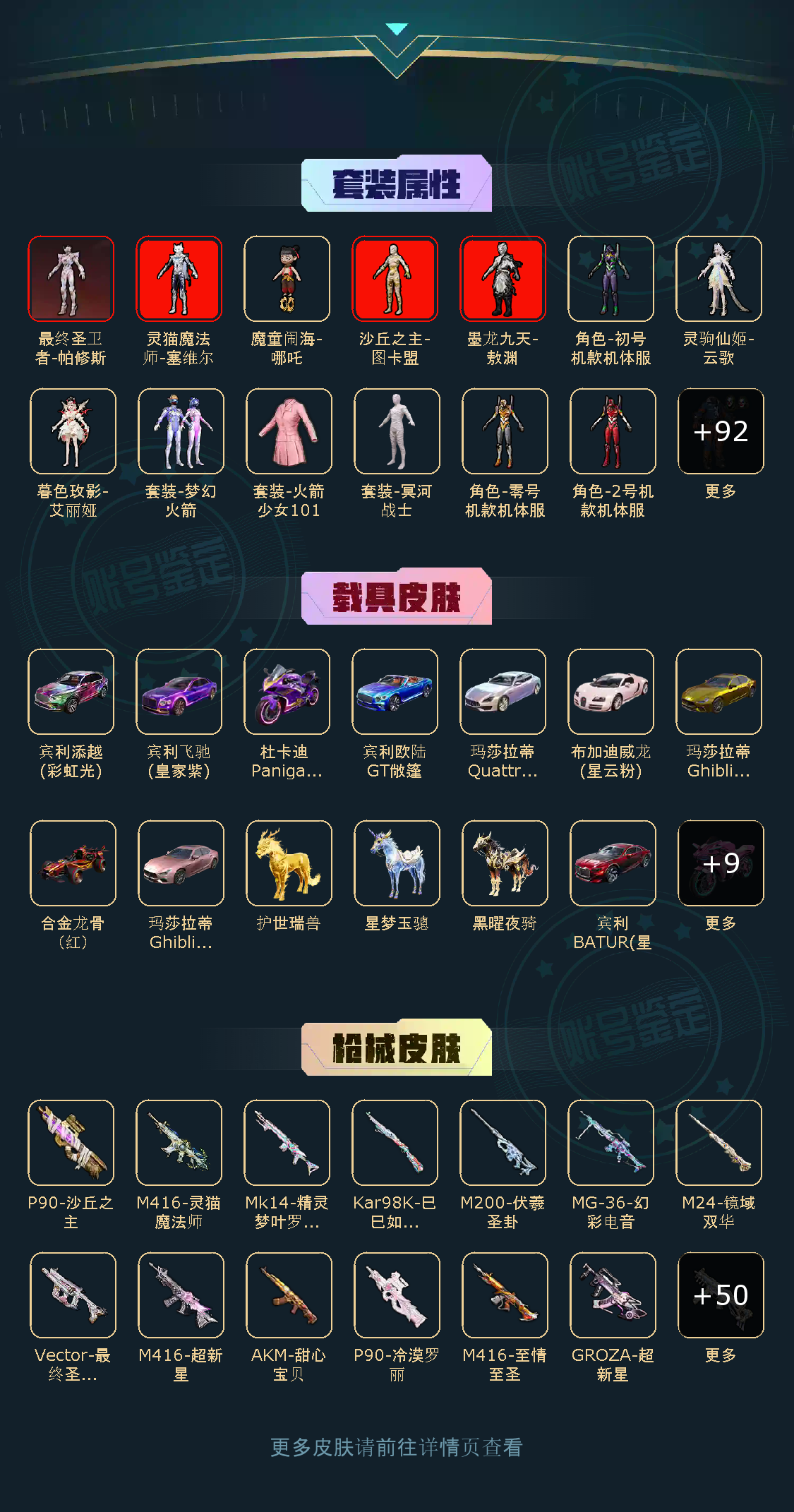 95粉,19载具,54特效枪,502套装,27王牌印记 UZI-绮梦青鸾AKM-甜心宝贝DP-28-扶摇飞仙SCAR-L-梦幻火箭SCAR-L-童趣迷兔Kar98K-伏魔团SKS-碧影闪光M416-风花雪月AUG-星之彼岸AWM-焰龙焚天M762-激战未来GROZA-香水柠檬M416-心之恋语平底锅-林间仙鹿M16A4-葫芦兄弟M416-五爪金龙DP-28-枪炮玫瑰AKM-炫紫旋律MG3-洛神天依S12K-海渊国主M762-甜蜜誓约UMP45-相思残雪M24-星之信仰M249-蓝莓炮弹玛莎拉蒂Ghibli(金)双人摩托-梦幻火箭鬼马风驰合金龙骨(红)玛莎拉蒂Ghibli(粉)快艇-塞莎KL27(鲸之蓝)