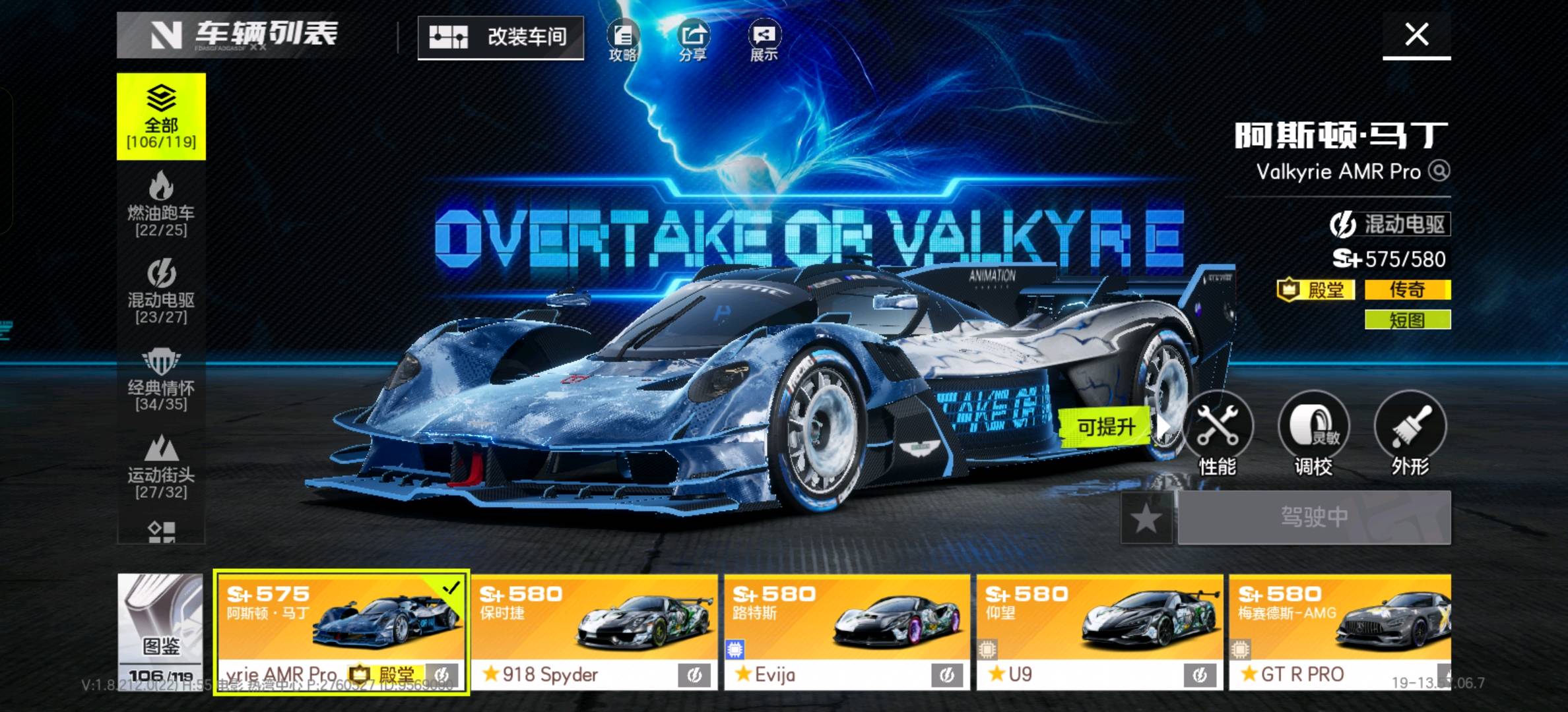竞速号、热力号---5殿堂满改 兰博基尼第六元素、布加迪威龙、奔驰amg one、兰博基尼野牛、玛莎拉蒂MC12 传奇涂装/故障X、星澜、竹林墨影、量子示波