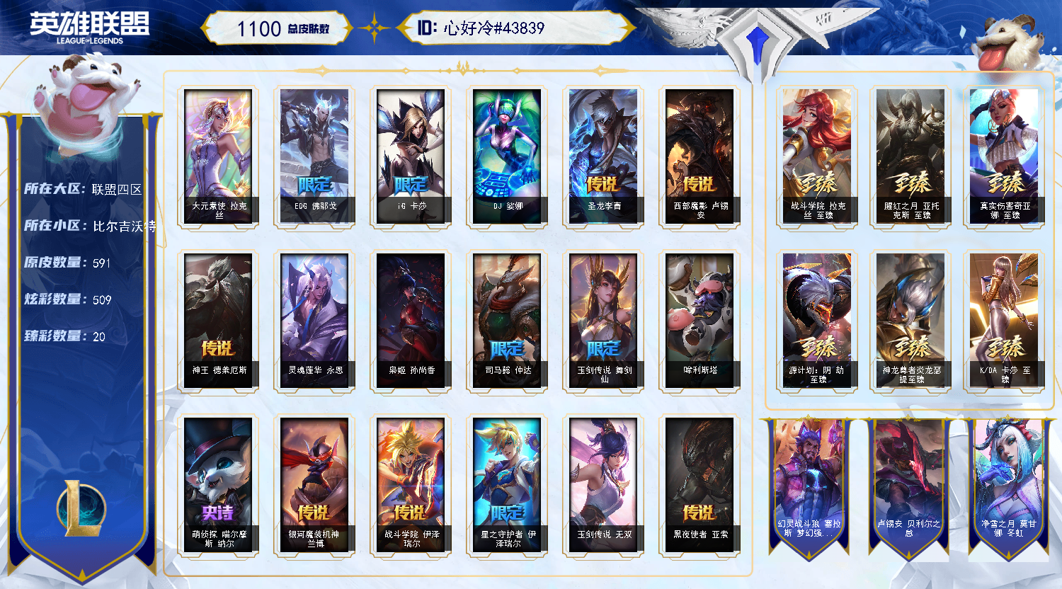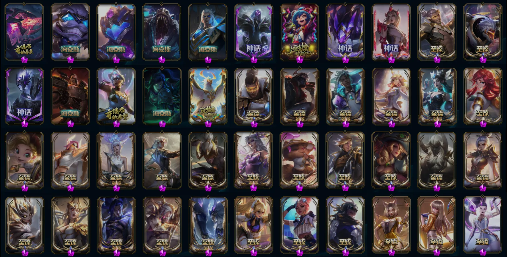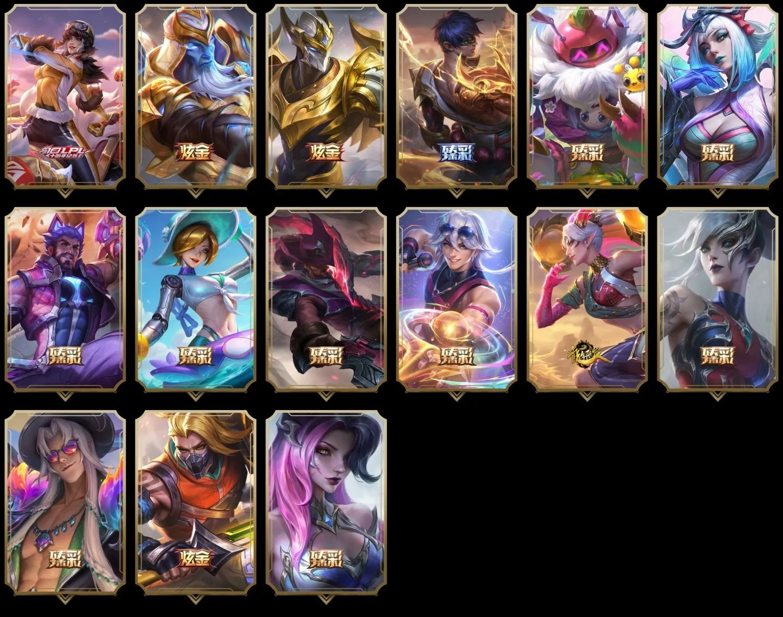 【重要皮肤】青花瓷千珏至臻 墨之影武者亚索至臻 花仙使者卡特琳娜至臻 海珀利安小队X09星环灵风迦娜至臻 星之守护者辛德拉至臻 星之守护者艾克至臻 西部魔影猎天使恶魔泰隆至臻 魅惑女巫莫甘娜至臻 女帝黛安娜至臻 战斗学院蕾欧娜至臻 太空律动璐璐至臻 魔女婕拉至臻 魔女乐芙兰至臻 奥术师佐伊至臻 未来战士卢锡安至臻 真实伤害亚索至臻 真实伤害赛娜至臻 星之守护者索拉卡至臻 灵魂莲华提莫至臻 灵能特工伊泽瑞尔至臻 福牛守护者菲奥娜至臻 源计划逆流塞拉斯至臻 源计划阴劫至臻 王国机神玄武盖伦至臻 神龙尊者炎龙瑟提至臻 黑夜使者凯隐至臻 征服者贾克斯至臻 KDA二代卡莎至臻 KDA一代卡莎至臻 KDA阿狸至臻 KDA阿狸2022至臻 战斗学院拉克丝至臻 战斗学院拉克丝2022至臻 真实伤害奇亚娜至臻 玉剑传说武剑仙至臻 玉剑传说武剑仙2022至臻 腥红之月亚托克斯至臻 未来战士锤石至臻 未来战士锤石2022至臻 黑夜使者李青至臻 黑夜使者李青2022至臻 灰烬骑士派克 灰烬杀手塞拉斯 海克斯科技安妮 海克斯科技瑟庄妮 海克斯科技雷克顿 海克斯科技斯维因 海克斯科技吉格斯 海克斯科技玛尔扎哈 海克斯科技拉莫斯 水晶掠夺者卡兹克 水晶圣骑艾希 暗星科加斯 黎明使者卡尔玛 恐惧新星德莱厄斯 摄魂使者薇恩 胜利剑圣易 胜利女神娑娜 胜利之王泰达米尔 胜利巨口克格莫 星之守护者伊泽瑞尔 玉剑传说舞剑仙 天龙之子斯莫德 龙腾虎跃瑟提 猛虎下山赵信 碧玉之牙卡西奥佩娅 司马懿仲达 纳财大帝塔姆 胜利女神瑟庄妮 胜利枪神卢锡安 胜利之剑亚托克斯 幽梦玫瑰伊莉丝 碎心之拳蔚 觅心猎手薇恩 北极星猎人斯维因 北极星使者萨科 寒冬精灵璐璐 冰雪风暴希维尔 持胡萝卜的雪人易 冰封王子蒙多 魄罗骑士瑟庄妮 平安夜女神娑娜 魅惑女巫妮蔻 魅惑女巫伊莉丝 大魔法锅布里茨 小恶魔菲兹 海之歌萨勒芬妮 海之歌永恩 泳池派对凯特琳 泳池派对奥莉安娜 泳池派对塔莉垭 泳池派对李青 泳池派对雷克顿 EDG厄斐琉斯 EDG佛耶戈 EDG格雷福斯 EDG悠米 EDG佐伊 FPX薇恩 FPX墨菲特 iG卡蜜尔 iG卡莎 iG乐芙兰 SSG洛 SSG嘉文四世 SKTT1阿利斯塔 SKTT1阿兹尔 SKTT1伊莉丝 SKTT1雷克顿 SSW锤石 SSW雷恩加尔 SKTT1李青 暗杀星努努和威朗普 Fnatic卡尔萨斯 防暴士兵格雷福斯 防暴士兵辛吉德 防暴天使凯尔 冠军之刃锐雯2016 冠军之血希瓦娜 鬼影森森茂凯 惊悚派对阿木木 魅惑女巫悠米 密林猎手提莫 南瓜头费德提克 圣诞开心鬼提莫 圣诞狂欢努努和威朗普 圣诞老人古拉加斯 圣诞驯鹿克格莫 无头骑士赫卡里姆 永恒之森乐芙兰 勇者阿狸 暗影沃里克 阿木木主人不要我了 2021全球总决赛嘉文四世 都铎王朝图奇 十五周年纪念希维尔 十周年纪念安妮 源代码乐芙兰 神凰行者瑞羽圣凰艾尼维亚 胜利凤凰艾尼维亚 DJ娑娜 大元素使拉克丝 绝息圣堂洛