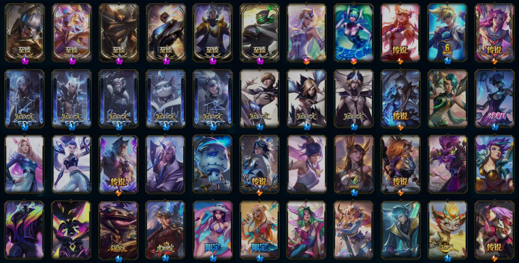 【传说皮肤】女皇艾希 霸天异形卡兹克 魔幻卡牌崔斯特 地狱行者孙悟空 战地机甲厄加特 陆地王者4WD布里茨 律政大亨蒙多 源计划毁灭派克 女校长菲奥娜 大天使长米迦勒凯尔 太空律动律动队长提莫 灌篮高手德莱厄斯 墨之影武者易 星之守护者拉克丝 耀星女神拉克丝 源计划联合艾希 冰霜亚龙希瓦娜 约德尔国队长提莫 神龙尊者圣龙李青 幻灵战斗队长厄运小姐 日蚀骑士希维尔 驯龙学者黑默丁格 符文战熊沃利贝尔 驯龙炮手崔丝塔娜 丧尸布兰德 提莫约德尔人的一大步 宇航员诺提勒斯 真实伤害艾克 战斗学院凯特琳 灵魂莲华瑟提 源计划超体莫德凯撒 黎明使者永恩 战斗学院伊泽瑞尔 星之守护者阿卡丽 星之守护者卡莎 神王德莱厄斯 屠龙勇士潘森 冰川巨兽墨菲特 女警狙击凯特琳 光明哨兵格雷福斯 西部魔影卢锡安 黑夜使者亚索 青花瓷伊泽瑞尔 战场女武神凯尔 腥红之月鬼武姬阿卡丽 女帝卡特琳娜 血石领主弗拉基米尔 未来战士凯特琳 银河魔装机神兰博 暗星锤石 炼狱魔犬内瑟斯 冰霜之刃艾瑞莉娅 地狱之门卫士加里奥 双重冰晶艾尼维亚 太空律动猫猫布里和里茨 至尊魔女莫甘娜 星之守护者金克丝 恶魔之刃泰达米尔 烈焰雄心崔丝塔娜 黯晶凤凰艾尼维亚 绅士科加斯 合金巨兽努努和威朗普 星之守护者阿狸 枯萎之壤泽拉斯