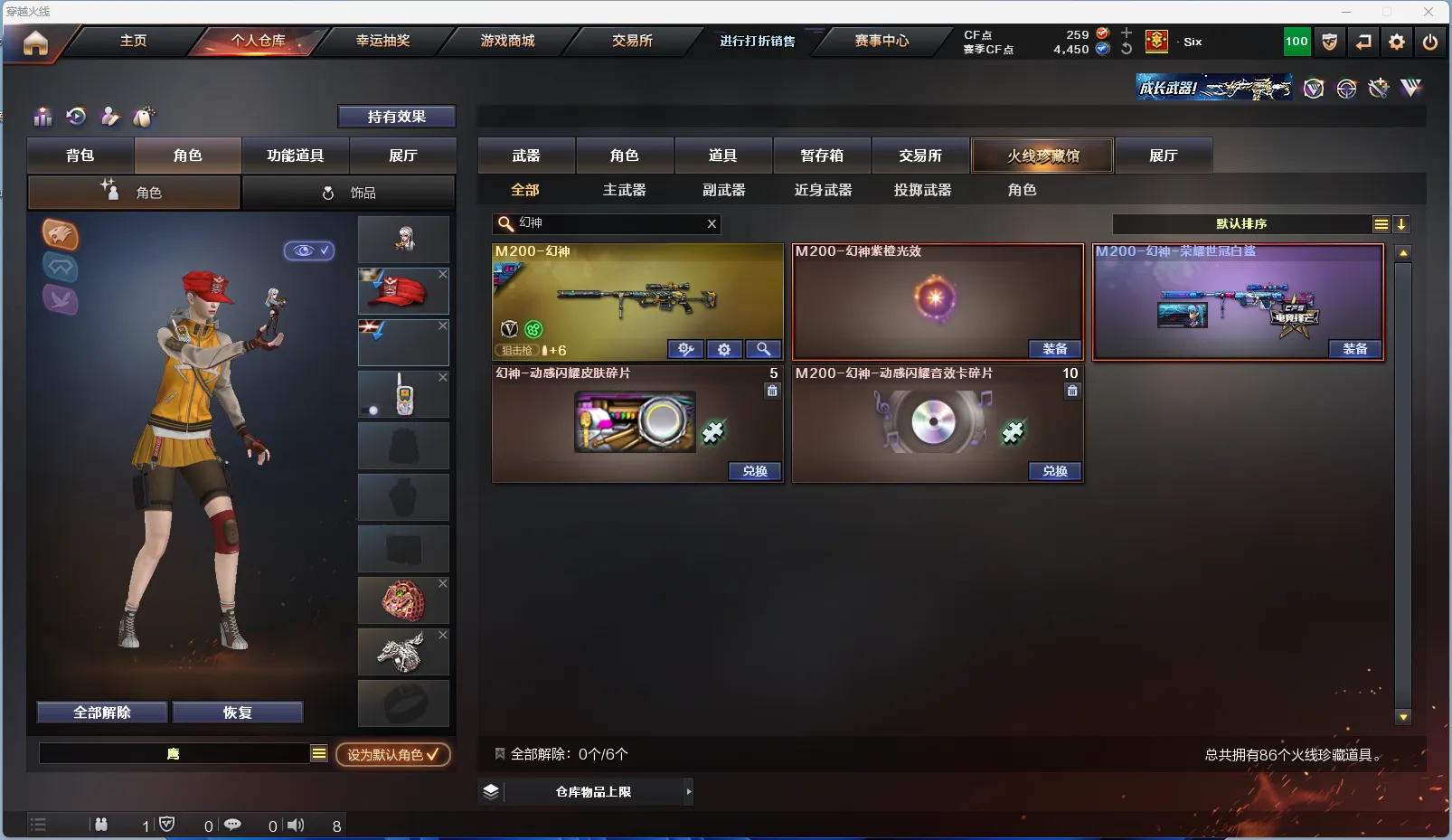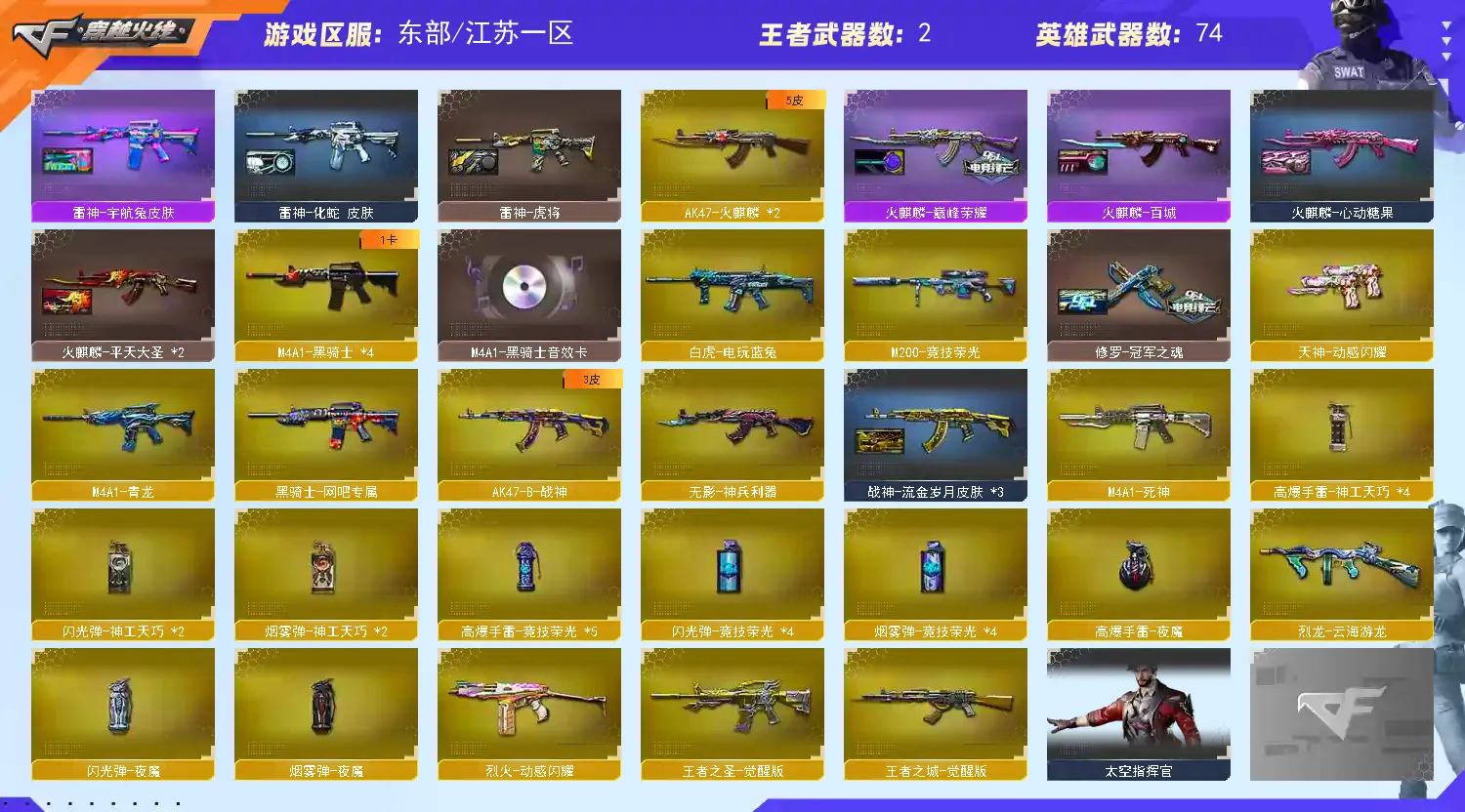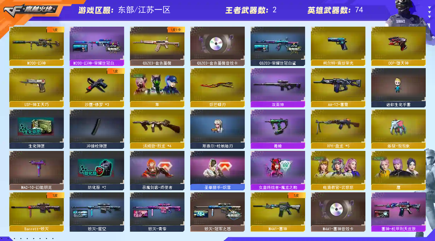 V武器: AK47-火麒麟,M4A1-雷神,M4A1-黑骑士,M4A1-死神,Barrett-毁灭,M200-幻神,AA-12-雷霆,QBZ03-金色蔷薇,RPK-盘龙,汤姆逊-烈龙,沙鹰-修罗,沙鹰-天神,屠龙,M200-竞技荣光,柯尔特-竞技荣光,擎天-竞技荣光,AK47-B-战神,白虎-电玩蓝兔,USP神工天巧,唐刀神工天巧,炽芒蝶刃,龙啸-烈火龙威,烈火-动感闪耀,天神-动感闪耀,屠龙-动感闪耀,擎天-云海游龙,COP-堕天神,烈龙-云海游龙,马来剑-夜魔,无影-神兵利器,金色蔷薇-古蛇迷踪,修罗-古蛇迷踪 王者武器: 王者之城-觉醒版,王者之圣-觉醒版 热门武器: M4A1-雷神-精英刀锋,裁决-雪莉杨,斯泰尔-枪娘暗刃 狙击枪稀有皮肤: 毁灭-星空,毁灭-冠军之怒,M200-幻神-荣耀世冠白鲨 英雄角色: 鹰,电竞教官-云悠悠,隼 音效道具: M4A1-雷神音效卡,Barrett-极光音效卡,M4A1-黑骑士音效卡,天神动感闪耀音效卡,烈火动感闪耀音效卡