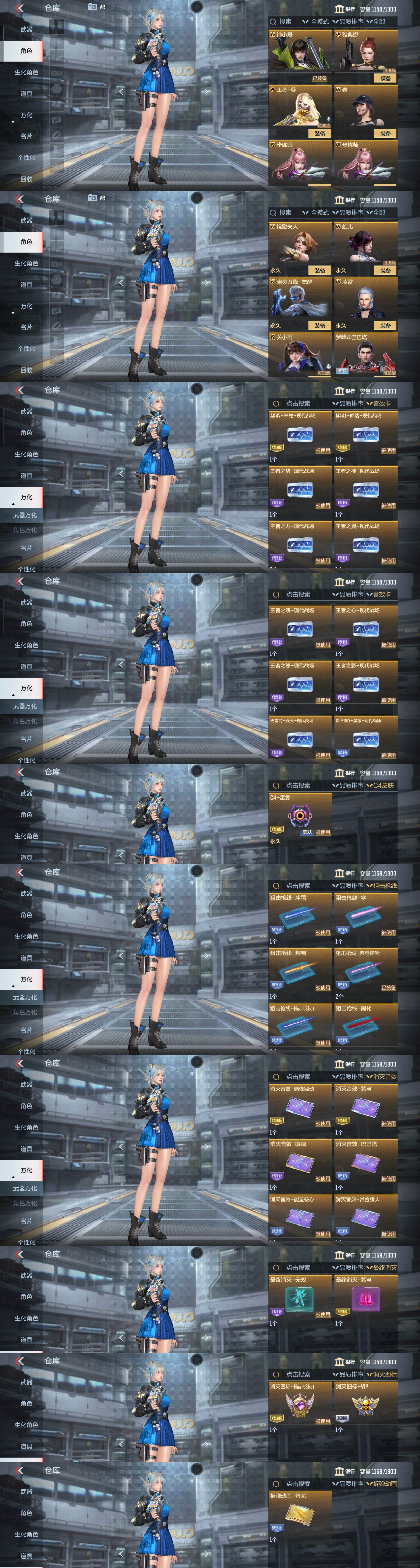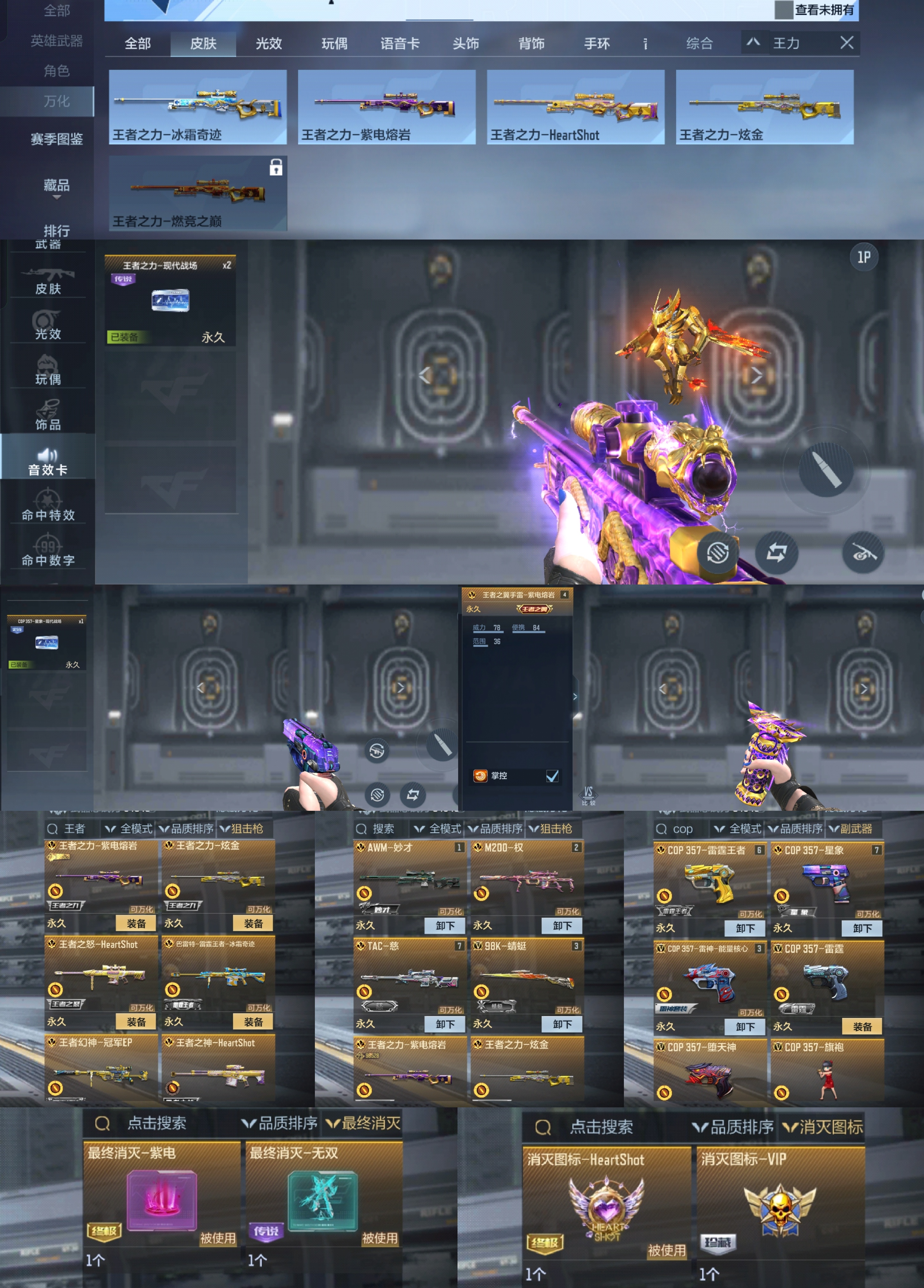 王影紫电熔岩,王者之技王技冰霜奇迹,雷霆王者AK,王翼女团拉丝,王心女团拉丝,王者蔷薇,王魄紫电熔岩,王戮,王势燃竞之巅,王圣,王腾冰霜奇迹,雷霆王者m4冰霜奇迹,王影炫金,王魄女团拉丝,王者幻神王幻ep冠军皮肤,王力紫电熔岩,王力炫金,王力女团拉丝,王力冰霜奇迹,王怒女团拉丝,巴雷特雷霆王者,王神女团拉丝,m200孙权,妙才,蜻蜓,太史慈,孟德过载,奉先无双,孙策套,璀璨星辰星象套,仲达白露,文远过载,仁德羸魔,盖,本初,孟获,仲康,游骑兵寒霜,金角巨兽,机械纪元81,宙斯,黑龙魂,威震天 螳螂,王力音效卡,奉先音效卡,星象c4包,钟小魁,王者葵,步练师,最终消灭紫电,最终消灭无双,拆弹动画蚩尤,消灭音效紫电,消灭图标女团,狙击枪线紫电熔岩,王者之盘