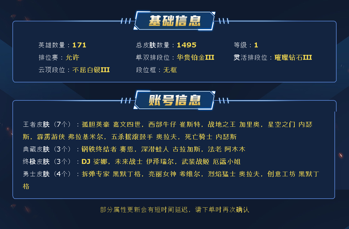 ~~喜欢记得收藏~~可排位~~1500皮全英雄~~租之前尽量查一下游戏ID,确保段位是您需要的,避免浪费您的时间~~请勿挂机逃跑故意送人头,谢谢合作,谢谢~~