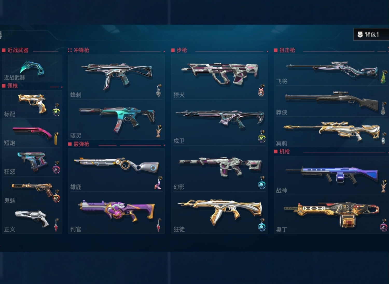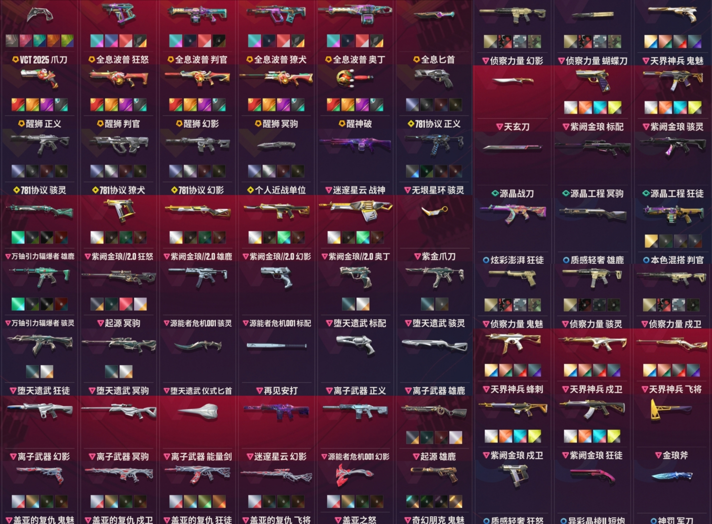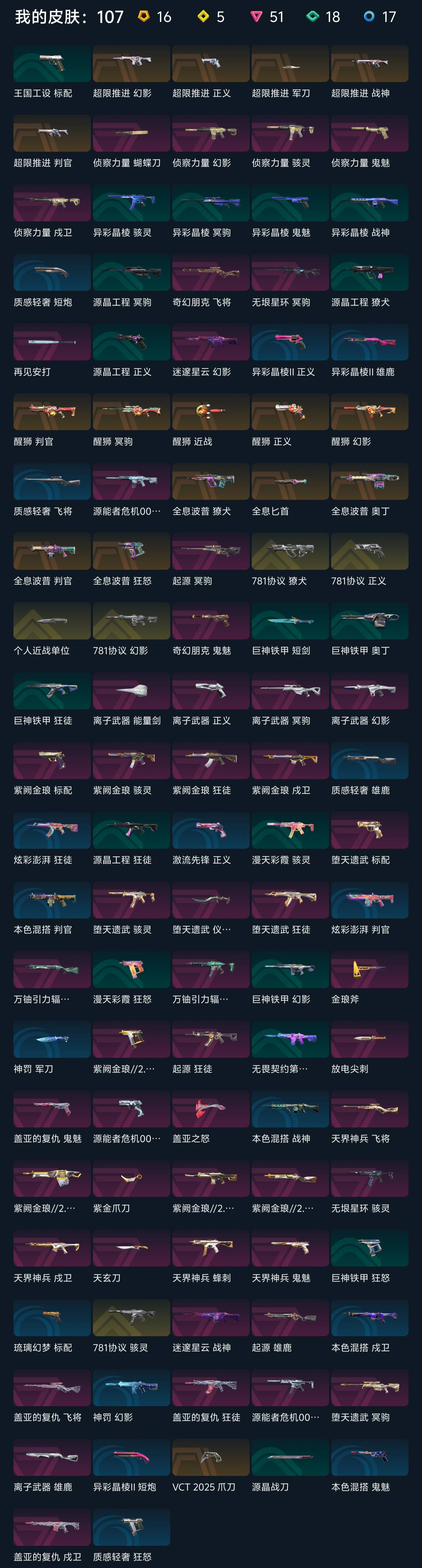 近战武器:vct2025爪刀满级全炫彩(vct爪刀)/沧澜戟2级深蓝/澄湖涟滟2级鱼扇/偃月2级莹白/推进模式前进四2级银蓝/紫金爪刀2级/个人近战单位满级白色/堕天遗武仪式匕首2级/盖亚之怒2级蓝色/醒神破2级全炫彩/天玄刀2级/侦察力量蝴蝶刀2级全炫彩(侦察蝴蝶刀)/金琅斧2级/离子武器能量剑2级/巨神铁甲短剑/神罚军刀(神中神)/放电尖刺2级橙色/再见安打2级