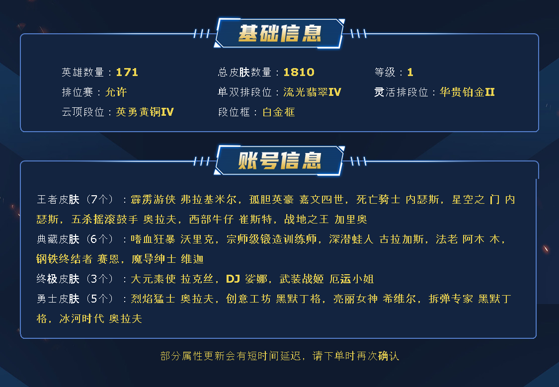 1800p上中下野皮肤居多限时半价虐菜号烧鸡臻彩居多带妹号