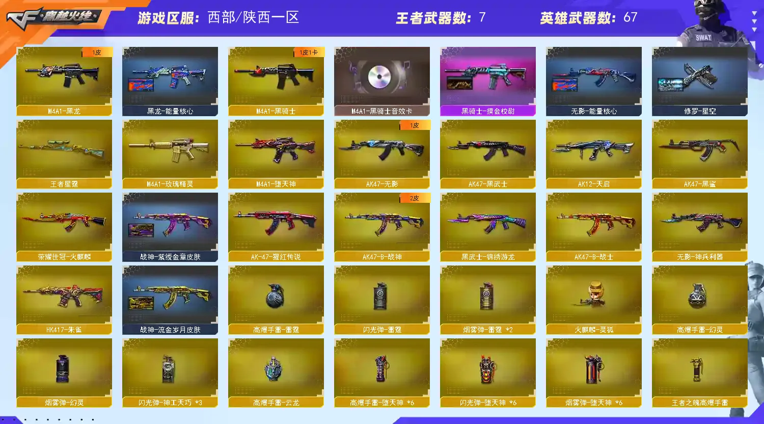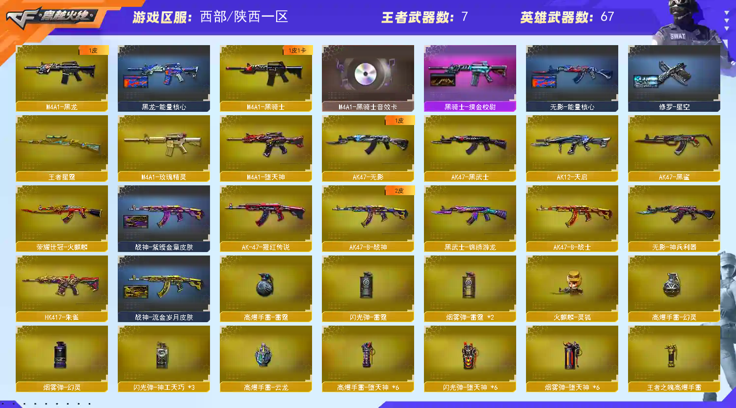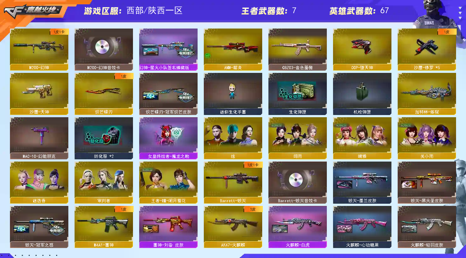 【幻神3件套!!!】【m200幻神+幻神音效卡+星火小队皮肤+炽芒蝶刃(冠军炽芒)】【王者星霆】【毁灭+毁灭音效卡+冠军之怒皮肤】【黑骑士+黑骑士音效卡】【星神漫游皮肤】【qbz03金色蔷薇】【堕天神套装】【荣耀世冠火麒麟】【王者之心 王者之魄 王者之势 王者之力】【火麒麟 黑龙 雷神 黑骑士 无影 黑武士 天启 黑鲨 朱雀 无影神兵利器 黑武士锦绣游龙 超新星热带奇洋 玫瑰精灵 猩红传说 战士 战神 毁灭 裁决】——【热门武器/小人呛】【白虎迷你小艾 雷神精英刀锋 火麒麟灵狐 炼狱呛娘擎电】【cop堕天神 修罗 天神】【炽芒蝶刃 尼泊尔雷霆 麒麟刺堕天神 龙啸堕天神 擎天云海游龙 龙啸热带奇洋】——【堕天神投掷套装*6】【雷霆投掷套装】——【角色】【4防关小雨 晴雅 王者瞳闭月羞花】【迷迭香 审判者 司雨 炫】【奇洋探员 乔伊教练 云海玲珑】