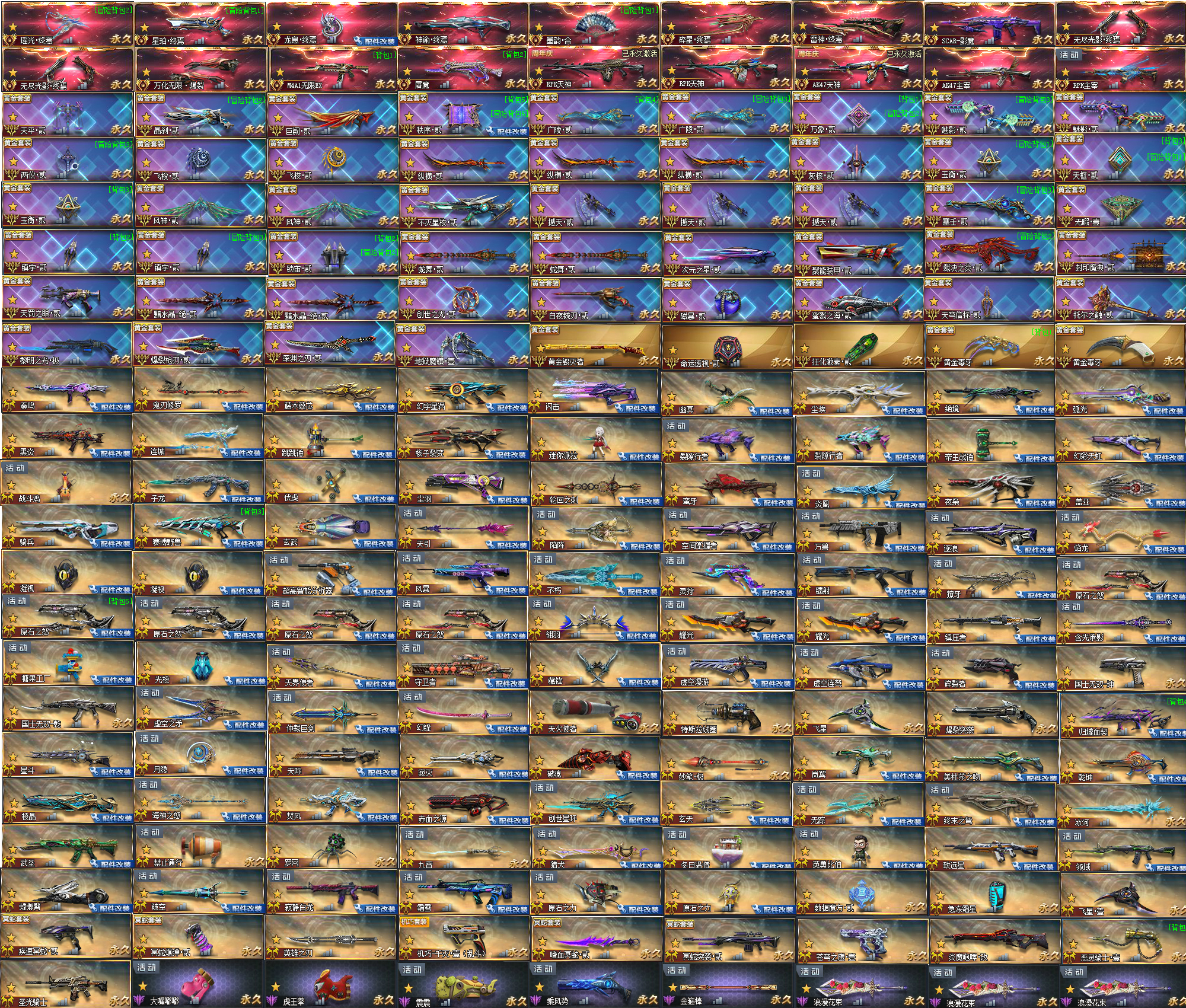 拥有全部传说级武器:瑶光终焉⭐星珀终焉⭐龙息终焉⭐神谕终焉⭐墨韵合⭐碎星终焉⭐雷神终焉⭐SCAR影魔⭐M4A1无限EX⭐屠魔⭐无尽光影x2⭐RPK天神x2⭐AK47天神x2⭐AK47主宰⭐RPK主宰⭐万化无限爆裂