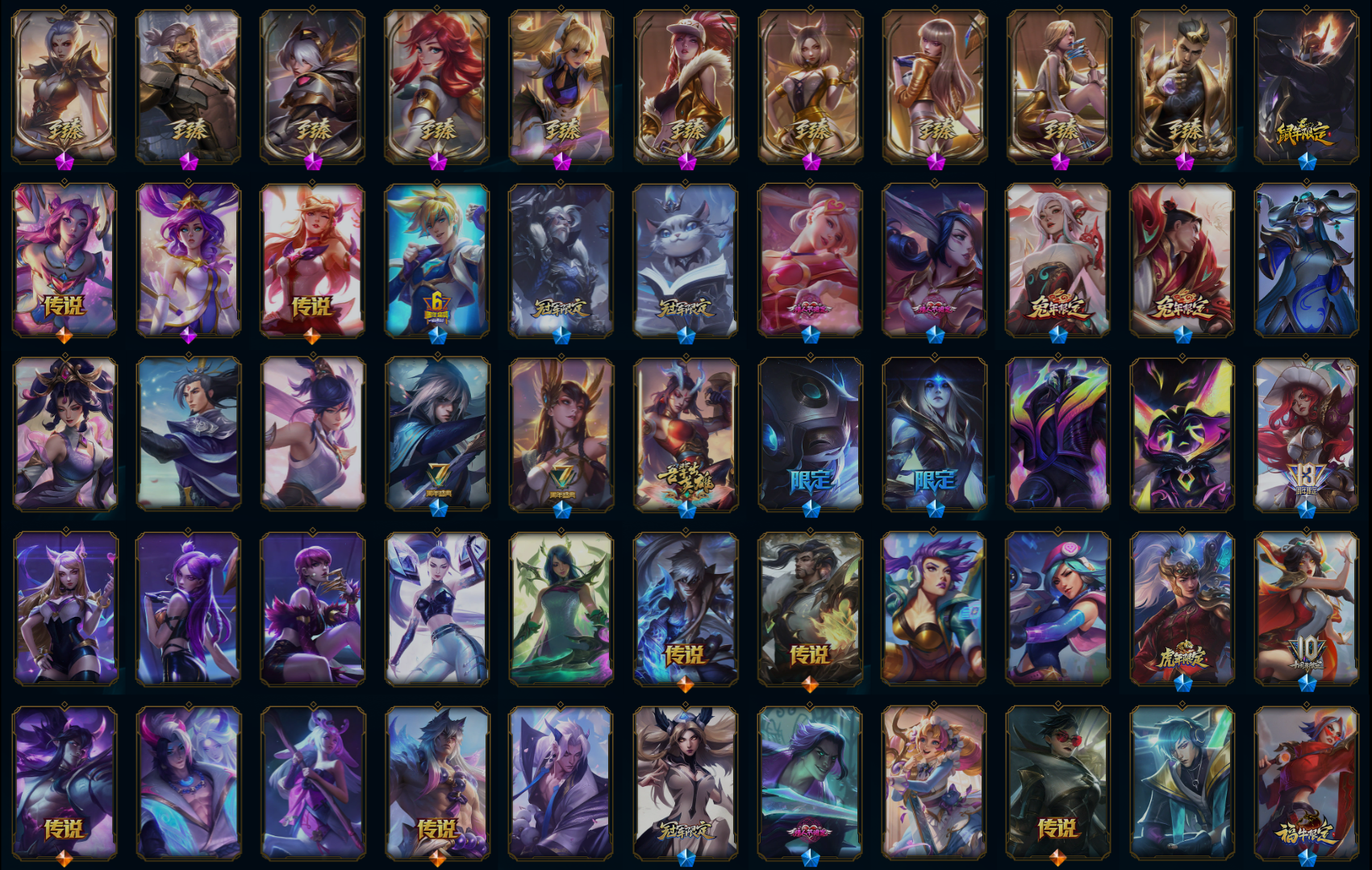 【传说皮肤】电玩女神娑娜 至高天韦鲁斯 神龙尊者昼日真龙亚索 源计划泯灭雷克顿 西部天使赛娜 战地巨兽科加斯 地狱行者孙悟空 暗星尊烬 星之守护者卡莎 影执事劫 钢铁军团盖伦 星之守护者阿卡丽 灵魂莲华瑟提 神王德莱厄斯 灵魂莲华锤石 上古战魂魔腾 源计划超体莫德凯撒 蔷薇绅士杰斯 暗星女王拉克丝 魔女伊芙琳 霸天异形卡兹克 花仙女王卡尔玛 欧米伽小队幽灵特工 银河魔装机神兰博 血石领主弗拉基米尔 黑夜使者索拉卡 神王盖伦 炼狱魔犬内瑟斯 战斗学院伊泽瑞尔 神拳李青 真实伤害艾克 日蚀骑士希维尔 源计划联合艾希 光明哨兵薇恩 至尊魔女莫甘娜 合金巨兽努努和威朗普 女皇艾希 焰尾妖狐阿狸 鬼魂新娘莫甘娜 太空律动猫猫布里和里茨 女校长菲奥娜 约德尔国队长提莫 源计划林易 钢铁之翼凯尔 暗星锤石 腥红之月鬼武姬阿卡丽 恶魔男爵瑞兹 枯萎之壤泽拉斯 驯龙学者黑默丁格 冰霜亚龙希瓦娜 战斗学院凯特琳 陆地王者4WD布里茨 苍穹之光韦鲁斯 神龙尊者圣龙李青 驯龙炮手崔丝塔娜 奥德赛凯隐 星之守护者拉克丝 地狱之门卫士加里奥 宇航员诺提勒斯 烈焰雄心崔丝塔娜 提莫约德尔人的一大步 死亡骑士盖伦 黑夜使者亚索 冰霜之刃艾瑞莉娅 女警狙击凯特琳 灌篮高手德莱厄斯 天煞劫 黎明使者永恩 大天使长米迦勒凯尔 屠龙勇士潘森 符文战熊沃利贝尔 铁哥们儿奥拉夫 西部天使艾希 西部魔影卢锡安 星之守护者阿狸 星之守护者金克丝 魔幻卡牌崔斯特 霸天零式赛恩 星之守护者霞 最终BOSS维迦 苹果机器人布里茨 金牌主播德莱文 源计划净化薇恩 黯晶凤凰艾尼维亚 绅士科加斯 律政大亨蒙多 黎明使者锐雯 黯黑魔龙希瓦娜