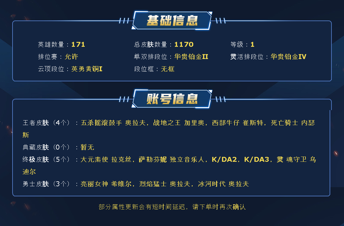 ~~喜欢记得收藏~~可排位~~1164皮全英雄~~租之前尽量查一下游戏ID,确保段位是您需要的,避免浪费您的时间~~请勿挂机逃跑故意送人头,谢谢合作,谢谢~~