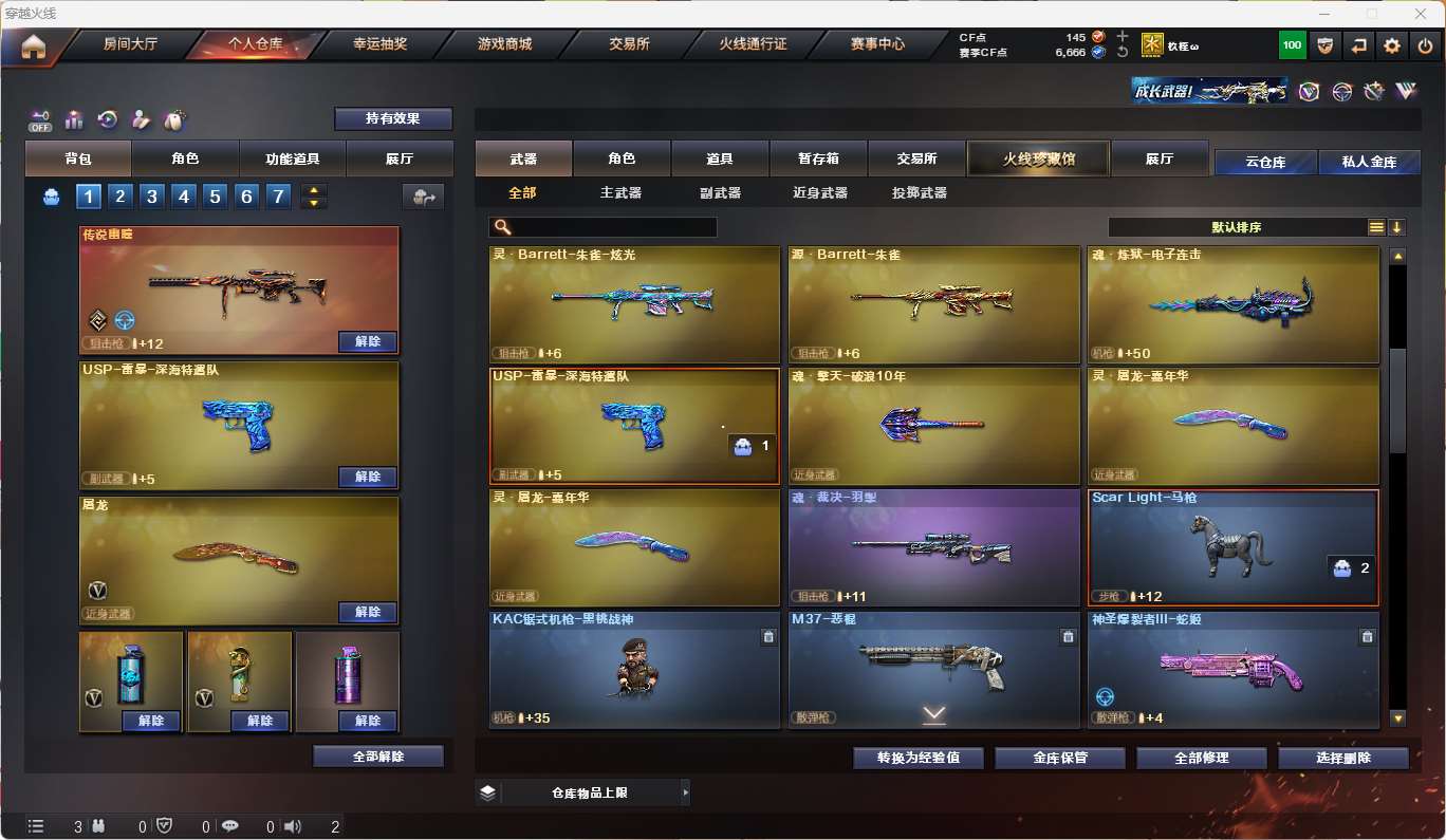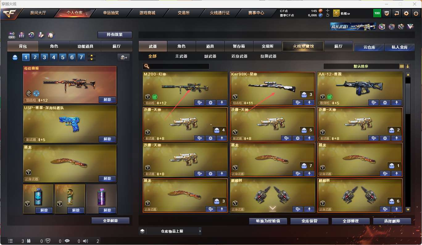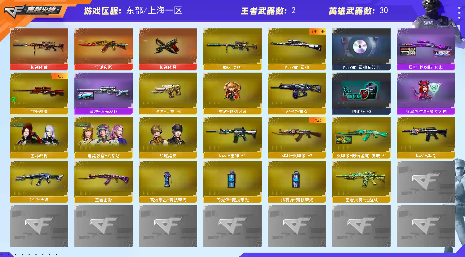 【传说幽瞳+传说幽冥】 【m200-幻神】 【98k星神+音效卡+呛娘默】 【传说夜影】 【火麒麟+火麒麟-呛娘】 【黑龙】 【雷神】 【裁决】 【王者风势 王者雷影】 【天启】 【5手呛 天神*4】 【10近战 屠龙*3 麒麟刺*6】 【手雷 竞技荣光】 【四防 云悠悠】 【98k星神音效卡】