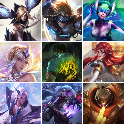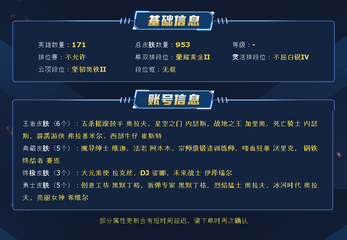 950皮✨38神话✨20+至臻✨全英雄可排位✨大元素使✨dj琴女✨未来战士ez✨黑夜使者吸血鬼,龙✨