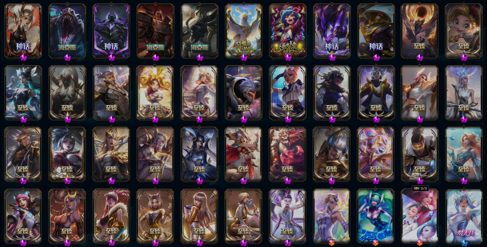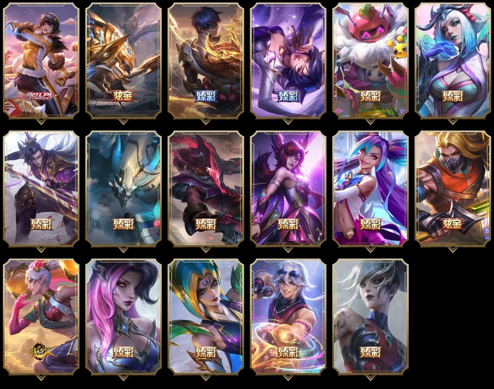 【传说皮肤】绝息圣堂锐雯 魔女伊芙琳 神龙尊者夜月幻龙亚索 血石领主弗拉基米尔 炼狱魔犬内瑟斯 墨之影武者易 日蚀骑士希维尔 太空律动猫猫布里和里茨 黎明使者永恩 星之守护者洛 星之守护者卡莎 星之守护者拉克丝 黑夜使者索拉卡 西部魔影大小姐蕾欧娜 源计划泯灭雷克顿 西部魔影卢锡安 星之守护者阿卡丽 冰霜之刃艾瑞莉娅 光明哨兵格雷福斯 灵魂莲华锤石 黯晶凤凰艾尼维亚 天煞劫 鬼魂新娘莫甘娜 灵魂莲华阿狸 烈焰雄心崔丝塔娜 神王德莱厄斯 光明哨兵薇恩 恶魔之刃泰达米尔 灌篮高手德莱厄斯 源计划林易 影执事劫 地狱之门卫士加里奥 女主播迦娜 灵能特工娑娜 金牌主播德莱文 枯萎之壤泽拉斯 源计划超体莫德凯撒 钢铁之翼凯尔 源计划毁灭派克 未来战士凯特琳 神王盖伦 绅士科加斯 青花瓷伊泽瑞尔 苹果机器人布里茨 偶像歌手阿狸 泳池派对吉格斯 屠龙勇士潘森 宇航员诺提勒斯 电玩女神娑娜 提莫约德尔人的一大步 霸天异形卡兹克 银河魔装机神兰博 星之守护者阿狸 最终BOSS维迦 红色男爵库奇 焰尾妖狐阿狸 西部天使艾希 幻灵战斗队长厄运小姐 第三类接触黑默丁格 双重冰晶艾尼维亚 女警狙击凯特琳 约德尔国队长提莫 神拳李青 源计划联合艾希 战地巨兽科加斯 蔷薇绅士杰斯 丧尸布兰德 星之守护者金克丝 神龙尊者圣龙李青 魔幻卡牌崔斯特 霸天零式赛恩 暗星锤石 至尊魔女莫甘娜 战场女武神凯尔 星之守护者霞 钢铁军团盖伦 暗星尊烬 合金巨兽努努和威朗普 地狱行者孙悟空 耀星女神拉克丝 源计划净化薇恩 暗星女王拉克丝 女校长菲奥娜 战地机甲厄加特 女帝卡特琳娜 恶魔男爵瑞兹 奥德赛凯隐 黑夜使者亚索 神龙尊者昼日真龙亚索 律政大亨蒙多 腥红之月鬼武姬阿卡丽 战斗学院凯特琳 邪鸦魅影乐芙兰 驯龙炮手崔丝塔娜 陆地王者4WD布里茨 欧米伽小队幽灵特工 女皇艾希 苍穹之光韦鲁斯 驯龙学者黑默丁格 符文战熊沃利贝尔 死亡骑士盖伦 大天使长米迦勒凯尔 黎明使者锐雯 冰霜亚龙希瓦娜 铁哥们儿奥拉夫 上古战魂魔腾 黯黑魔龙希瓦娜 冰川巨兽墨菲特 黎明使者索拉卡 西部天使赛娜 真实伤害艾克 战斗学院伊泽瑞尔