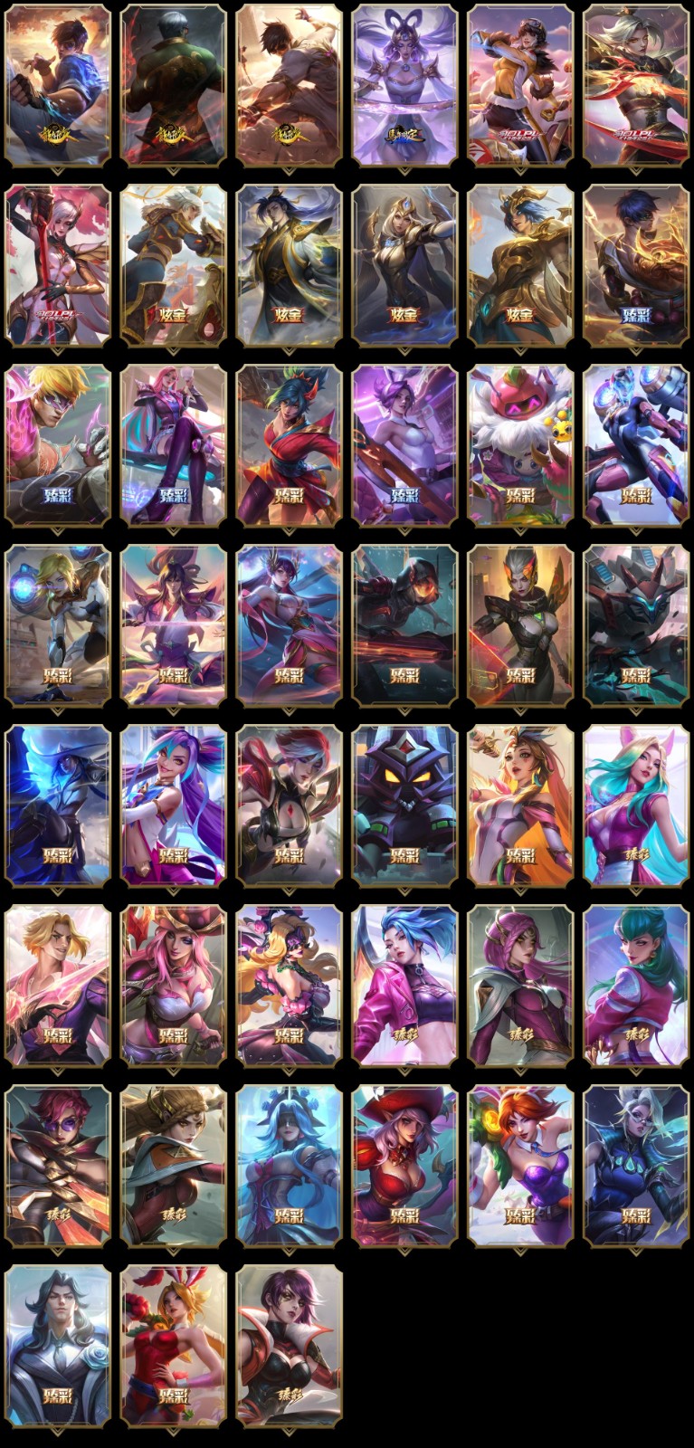 【传说皮肤】星之守护者阿卡丽 太空律动律动队长提莫 至高天派克 神龙尊者夜月幻龙亚索 日蚀骑士希维尔 影执事劫 西部魔影大小姐蕾欧娜 绝息圣堂锐雯 幻灵战斗队长厄运小姐 星之守护者卡莎 黎明使者永恩 灵魂莲华瑟提 神龙尊者昼日真龙亚索 青花瓷伊泽瑞尔 魔女伊芙琳 光明哨兵格雷福斯 光明哨兵薇恩 源计划超体莫德凯撒 源计划泯灭雷克顿 太空律动猫猫布里和里茨 战斗学院凯特琳 西部天使赛娜 灵魂莲华锤石 灵魂莲华阿狸 至尊魔女莫甘娜 暗星女王拉克丝 血石领主弗拉基米尔 神王盖伦 日蚀骑士蕾欧娜 奥德赛凯隐 源计划毁灭派克 月蚀骑士蕾欧娜 黑夜使者索拉卡 暗星尊烬 暗星锤石 女帝卡特琳娜 驯龙学者黑默丁格 邪鸦魅影乐芙兰 驯龙炮手崔丝塔娜 耀星女神拉克丝 黎明使者索拉卡 天煞劫 神拳李青 星之守护者洛 星之守护者霞 神王德莱厄斯 西部魔影卢锡安 真实伤害艾克 鬼魂新娘莫甘娜 星之守护者金克丝 地狱之门卫士加里奥 未来战士凯特琳 神龙尊者圣龙李青 冰霜亚龙希瓦娜 星之守护者拉克丝 焰尾妖狐阿狸 黯黑魔龙希瓦娜 钢铁之翼凯尔 死亡骑士盖伦 苹果机器人布里茨 恶魔男爵瑞兹 铁哥们儿奥拉夫 灵能特工娑娜 蔷薇绅士杰斯 星之守护者阿狸 律政大亨蒙多 偶像歌手阿狸 符文战熊沃利贝尔 枯萎之壤泽拉斯 丧尸布兰德 黯晶凤凰艾尼维亚 战地巨兽科加斯 电玩女神娑娜 战地机甲厄加特 欧米伽小队幽灵特工 黑夜使者亚索 最终BOSS维迦 战斗学院伊泽瑞尔 炼狱魔犬内瑟斯 西部天使艾希 苍穹之光韦鲁斯 霸天零式赛恩 绅士科加斯 大天使长米迦勒凯尔 女主播迦娜 泳池派对吉格斯 银河魔装机神兰博 冰川巨兽墨菲特 霸天异形卡兹克 宇航员诺提勒斯 黎明使者锐雯 战场女武神凯尔 女皇艾希 提莫约德尔人的一大步 烈焰雄心崔丝塔娜 屠龙勇士潘森 灌篮高手德莱厄斯 源计划净化薇恩 合金巨兽努努和威朗普 约德尔国队长提莫 女校长菲奥娜 上古战魂魔腾 恶魔之刃泰达米尔 双重冰晶艾尼维亚 女警狙击凯特琳 钢铁军团盖伦 源计划联合艾希 源计划林易 腥红之月鬼武姬阿卡丽 魔幻卡牌崔斯特 第三类接触黑默丁格 陆地王者4WD布里茨 冰霜之刃艾瑞莉娅 金牌主播德莱文 地狱行者孙悟空 红色男爵库奇