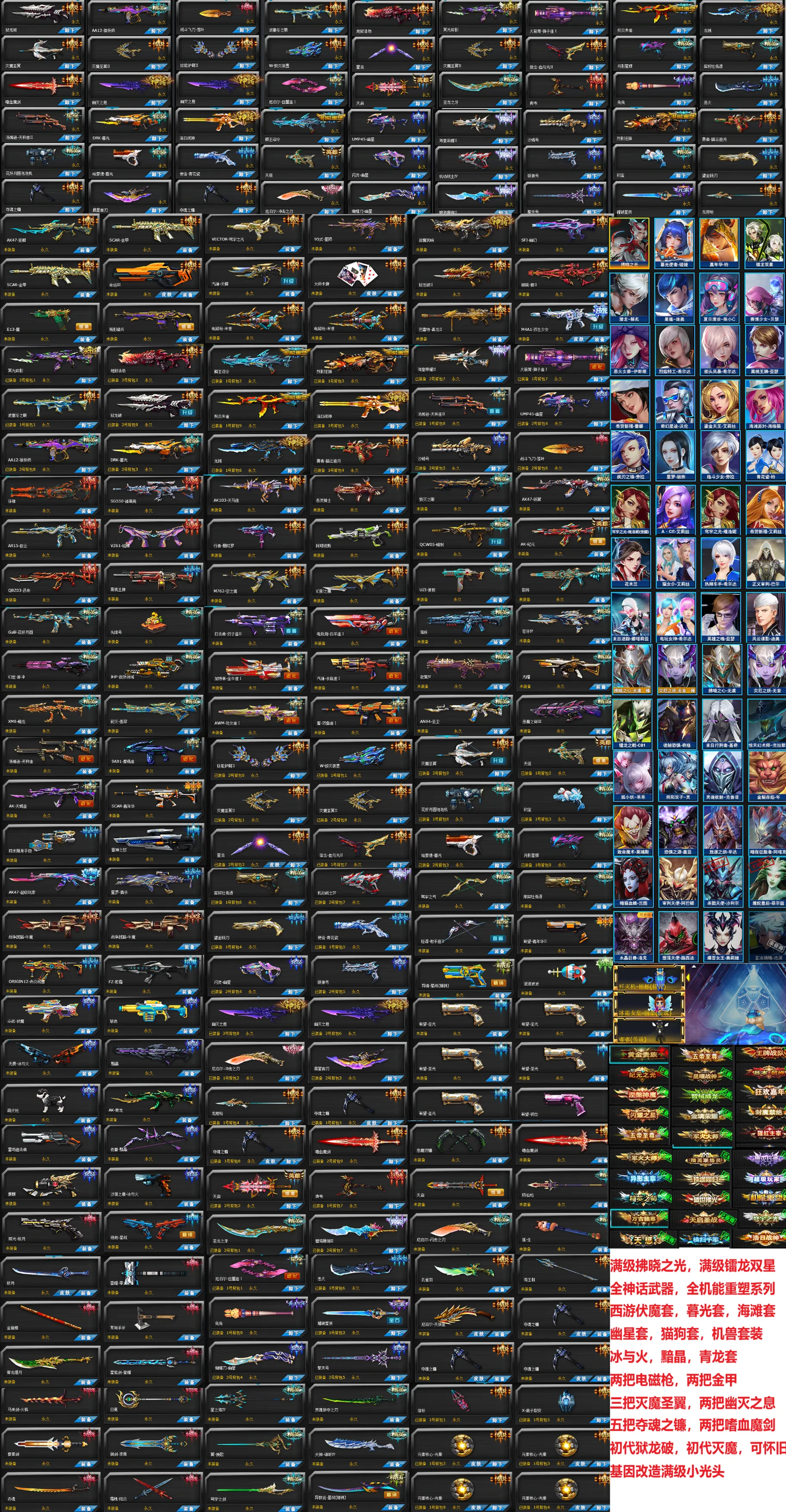 魔王魂潜影断魄火雷镰刀卡牌皮肤,两个飞行雷皮肤,两个满级机动战士,未来之歌,御风使,刀锋,满级女王,USAS12镭龙五阶满级痛苦女王逆转未来雷劫飞星像素世界,双兔兔,飞羽飞行雷源皮肤,弧光套跃动星辰赤血征程狂想骑士赛格内,锄禾,幽冥狂蛇,羊枪,金牛II。鳞王诏令烈影狂狮炽炎朱雀浩日战神龙域勇者踏云追月,冥光碎影地狱浩劫波塞冬之眼狱龙破猎妖师暮光海皇狮子座天秤座狮子座幽星套,神话机兽套落叶封魔回响幽幻破晓君真龙,凤舞双生少女天马座恶灵骑士曼陀罗阿喀琉斯空之镜幻影之鹰,穹宇之光觉醒星陨天鳞大师卡牌电磁枪金甲命运纪元满配,血清许褚诸葛亮赵云套貂蝉吕布,钢翼蜂刺原核裂阵海妖夜莺光耀恶魔之脊苍牙先锋号幻世螭龙寂灭翡翠双子座白羊座金牛座水瓶座处女座双鱼座魔羯座天蝎座嘉年华院长手炮,黑桃王牌奇幻星图号两把牛魔星罗猎杀西游伏魔套海滩套荒骨套猫狗套冰与火黯晶套青龙套飞行套欺霜雷神之怒,护臂毁灭装置灭魔圣翼星流血与光天惩花好月圆泡泡机豹宝月影星辉,羊枪机动战士鎏金铳刃青花瓷涅槃神魔凌驾恐惧射手座绝地星战,星战精铸,幽灭之息冲击之刃晨星宿刃龙胆枪夺魂之镰嗜血魔剑天启满配典韦圣龙之牙,碧海珊瑚巨蟹座兔兔,恶火海王戟孔雀羽天狼星恶魔双镰星之海闪击之刃,灵魂掠夺之刃犬神像素剑金箍棒信标离子裂变光晕碎星灭五帝至尊。镭龙双星贝瑟男女亚瑟花木兰基奇幻术师狐妖阴阳双子年兽痛苦女王蜘蛛兰图。万古独尊。