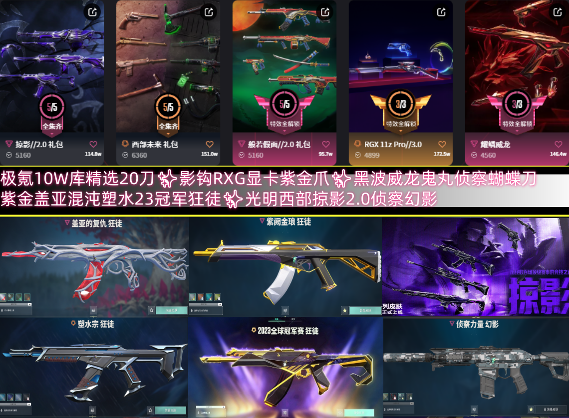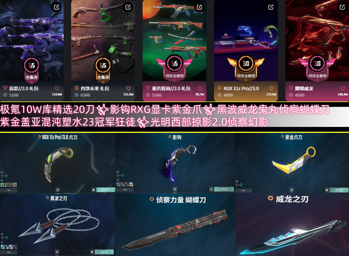 极氪10W库精选20刀✨影钩RXG显卡紫金爪✨黑波威龙鬼丸侦察蝴蝶刀✨紫金盖亚混沌塑水23冠军狂徒✨光明西部掠影2.0侦察幻影