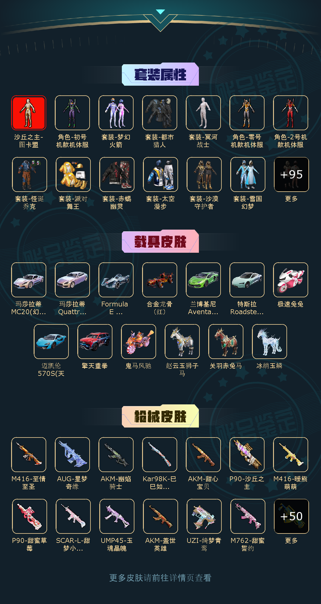 102粉,13载具,604套装,32王牌印记,无敌战神历史最高段,336411热力值 平底锅-仲夏莫吉托/平底锅-林间仙鹿/AKM-盖世英雄/AKM-甜心宝贝/SCAR-L-梦幻火箭/AUG-星梦奇缘/AKM-绿萝繁花/M416-风花雪月/M416-电玩时刻/AUG-星之彼岸/SCAR-L-甜梦小狐/GROZA-巴啦啦小魔仙/GROZA-香水柠檬/M416-暖熊萌萌/AKM-幽焰骑士/M416-心之恋语/SCAR-L-纯梦嫁纱/AKM-炫紫旋律/SCAR-L-青春物语/SCAR-L-锦绣绵绵/M416-至情至圣/AUG-妙趣可丽/M762-甜蜜誓约/M762-苔丝玫瑰/SPAS-12-蜜语绒猫/SPAS-12-音爆索尼克/S12K-海渊国主/M417-第五大道/SKS-诡面斩/Mini14-绚金瑰梦/SLR-暗夜玫瑰/VSS-烈焰拳霸/MK20-H-海螺星光/DP-28-暗夜鎏金/DP-28-扶摇飞仙/M249-彩虹甜喵/MG3-梦幻舞会/PKM-天星战神/DP-28-枪炮玫瑰/MG3-洛神天依/M249-蓝莓炮弹/DP-28-豹影疾电/UZI-绮梦青鸾/Vector-飒粉甜心/汤姆逊-怪笑疯兔/Vector-红伞翩翩/P90-甜蜜草莓/汤姆逊-荒漠赏金/P90-粉樱探戈/Vector-环太平洋/UZI-筑梦精灵/野牛-青空秋雨/UMP45-恐龙拽拽/P90-沙丘之主/UMP45-玉魂晶魄/爆炸猎弓-雪梅暗香/Kar98K-伏魔团/AWM-花间之火/Kar98K-巳巳如意/AWM-橘柚倾心/Kar98K-未来歌姬/M24-星之信仰/M24-莲影清波/特斯拉Roadster(水滴蓝)/玛莎拉蒂Quattroporte(幻星粉)/擎天重拳/鬼马风驰/Formula E Gen2(巅峰兰)/合金龙骨(红)/兰博基尼Aventador(翡翠绿)/玛莎拉蒂MC20(幻星粉)/迈凯伦570S(天际蓝)/冰绡玉鳞/关羽赤兔马/赵云玉狮子马/照夜玉狮子/极速兔兔/
