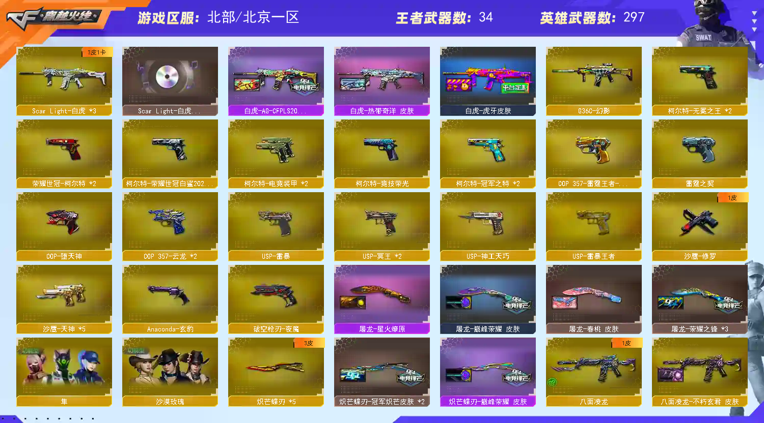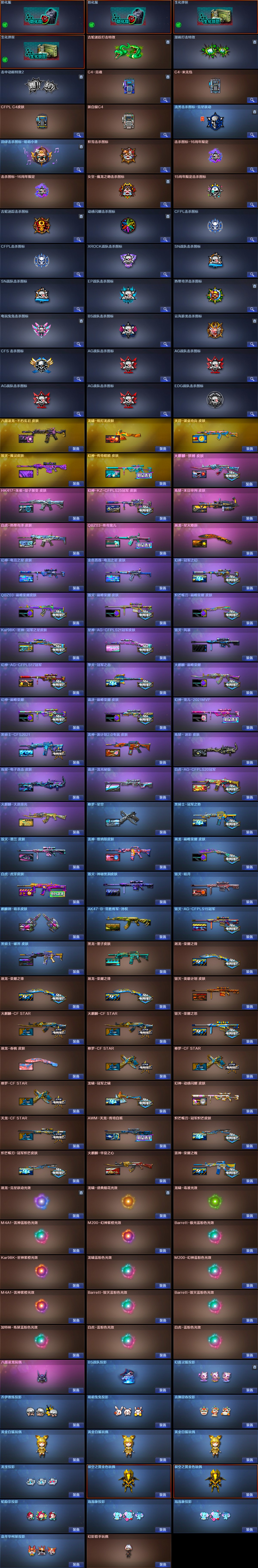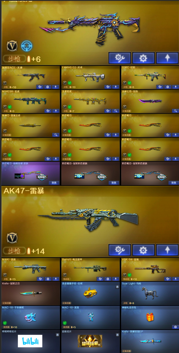 【稀有武器】:传说辉光/传说幽瞳/传说破晓/传说幽冥/M200-幻神/Kar98K-星神/VSK-94-金蚀/八面凌龙/G36C-幻影/ScarLight-白虎(2)/M14EBR-玄武/QBZ03-天罚(2)/M4A1-雷霆/AK47-雷暴/雷霆之契/USP-雷暴/破空枪刃-夜魔/柯尔特-电竞装甲(2)/柯尔特-竞技荣光/USP-神工天巧/天神-动感闪耀/COP357-云龙(2)/柯尔特-荣耀世冠白鲨2023/柯尔特-无冕之王/修罗-古蛇迷踪/荣耀世冠-柯尔特(2)/COP357-雷霆王者-觉醒版/金色蔷薇-古蛇迷踪/QBZ03-云龙/QBZ03-金色蔷薇/AK47-火麒麟/M4A1-黑龙/M4A1-雷神(3)/M4A1-黑骑士(6)/AK47-无影/白虎-电玩蓝兔/Barrett-毁灭(2)/Barrett-极光(2)/AWM-裁决(2)/Barrett-电竞装甲/RPK-盘龙(6)/加特林-炼狱/炼狱-风暴/悦蓝-惊涛骇浪-觉醒版/汤姆逊-烈龙(6)/AA-12-雷霆/炽芒蝶刃(2)/斩神刀-雷暴/尼泊尔-电竞装甲/擎天-竞技荣光/唐刀-神工天巧/云龙扇(2)