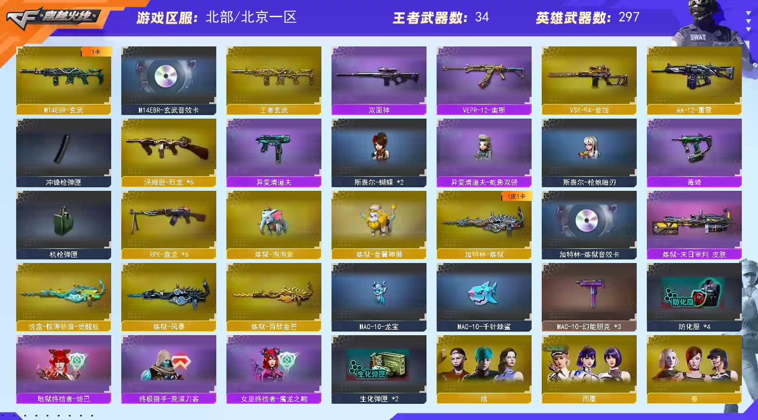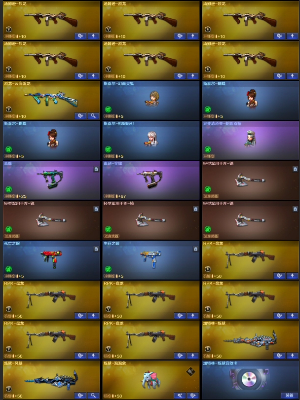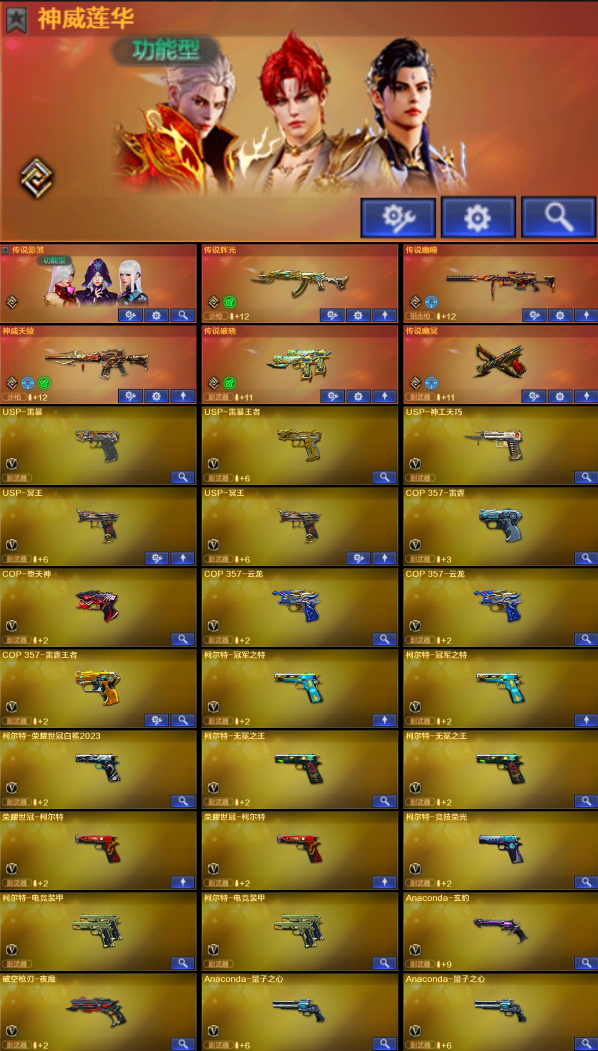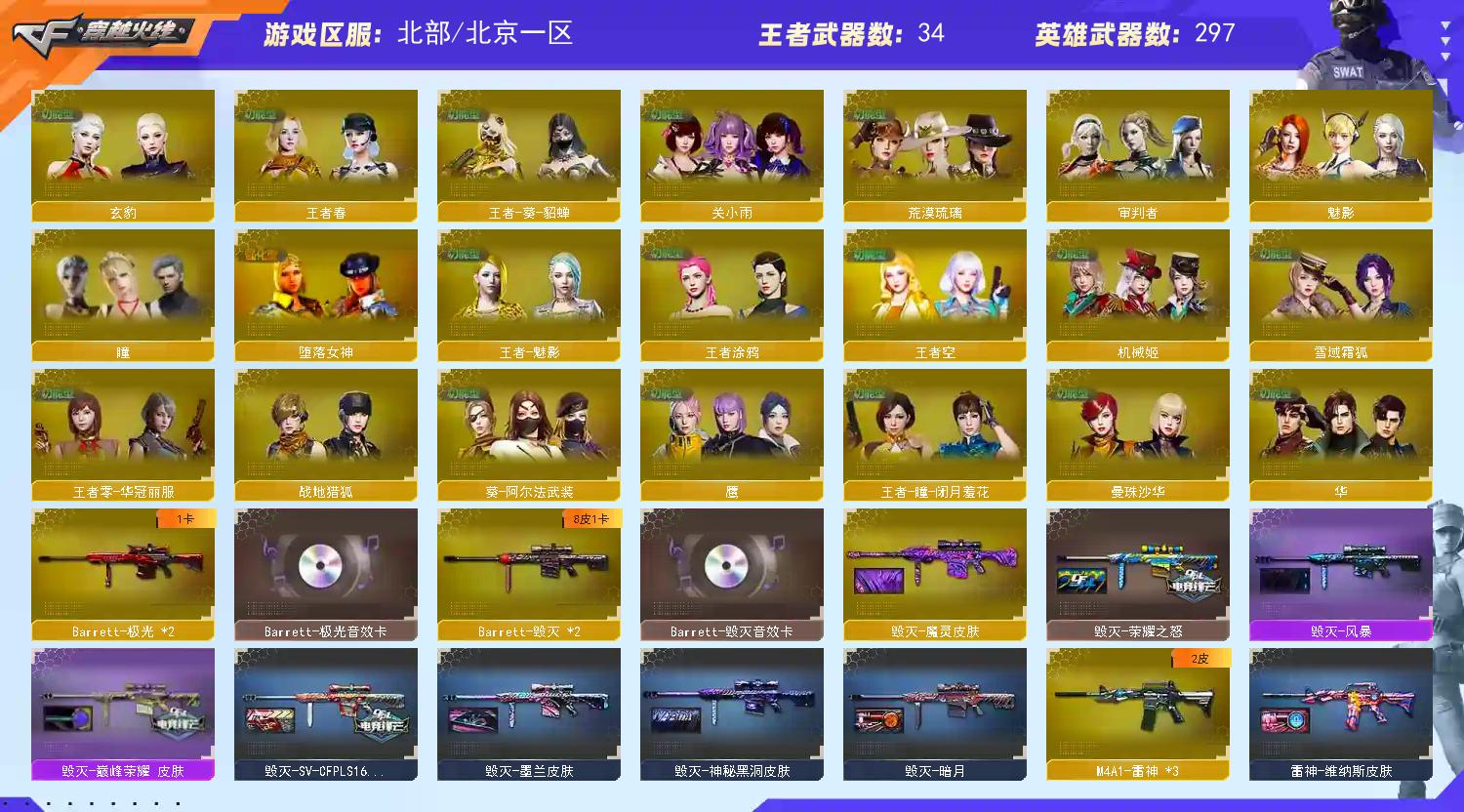 【稀有武器】:传说辉光/传说幽瞳/传说破晓/传说幽冥/M200-幻神/Kar98K-星神/VSK-94-金蚀/八面凌龙/G36C-幻影/ScarLight-白虎(2)/M14EBR-玄武/QBZ03-天罚(2)/M4A1-雷霆/AK47-雷暴/雷霆之契/USP-雷暴/破空枪刃-夜魔/柯尔特-电竞装甲(2)/柯尔特-竞技荣光/USP-神工天巧/天神-动感闪耀/COP357-云龙(2)/柯尔特-荣耀世冠白鲨2023/柯尔特-无冕之王/修罗-古蛇迷踪/荣耀世冠-柯尔特(2)/COP357-雷霆王者-觉醒版/金色蔷薇-古蛇迷踪/QBZ03-云龙/QBZ03-金色蔷薇/AK47-火麒麟/M4A1-黑龙/M4A1-雷神(3)/M4A1-黑骑士(6)/AK47-无影/白虎-电玩蓝兔/Barrett-毁灭(2)/Barrett-极光(2)/AWM-裁决(2)/Barrett-电竞装甲/RPK-盘龙(6)/加特林-炼狱/炼狱-风暴/悦蓝-惊涛骇浪-觉醒版/汤姆逊-烈龙(6)/AA-12-雷霆/炽芒蝶刃(2)/斩神刀-雷暴/尼泊尔-电竞装甲/擎天-竞技荣光/唐刀-神工天巧/云龙扇(2)
