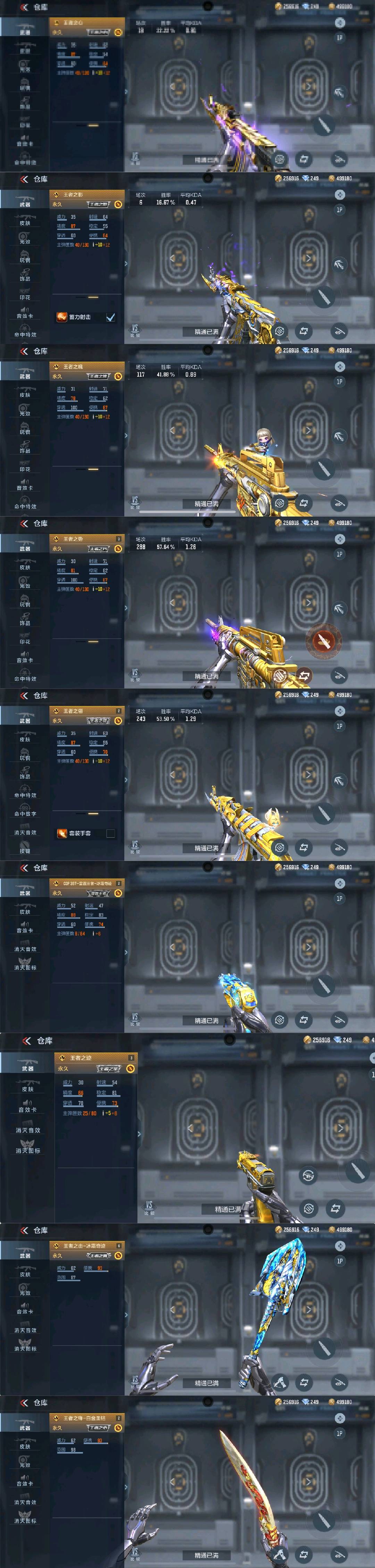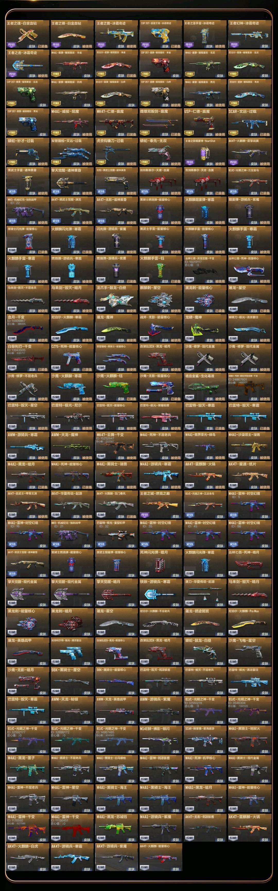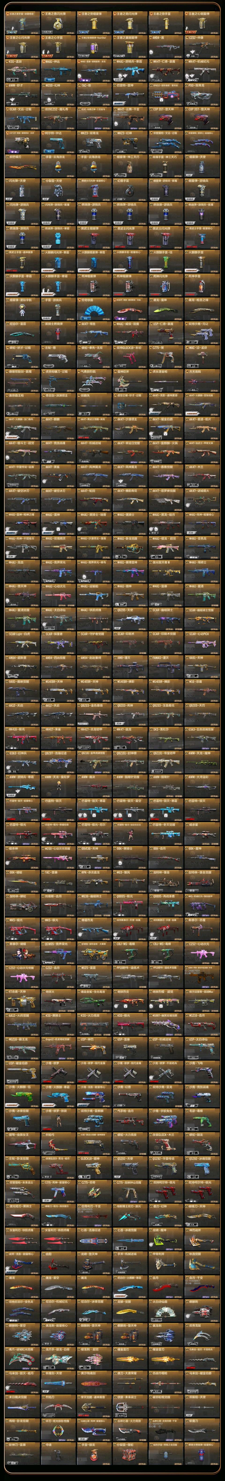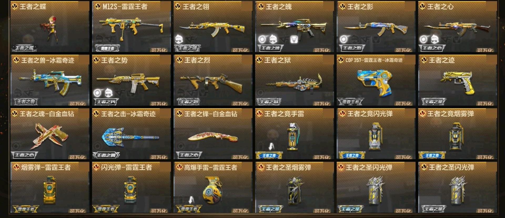 武器-王者之蝶, 武器-M12S-雷霆王者, 武器-王者之翎, 武器-王者之魄, 武器-王者之影, 武器-王者之心, 武器-王者之兽, 武器-王者之势, 武器-王者之烈, 武器-王者之狱, 武器-王者之迹, 武器-王者之魂, 武器-王者之击, 武器-王者之锋, 武器-AN94-盖, 武器-CZS2-仲康, 武器-KSG-孟获, 武器-M4A1-仲达, 武器-M4A1-星象, 武器-M4A1-游骑兵, 武器-MK47-仁德, 武器-MK47-机械纪元, 武器-AWM-妙才, 武器-M200-幻神, 武器-TAC-慈, 武器-巴雷特-雷神, 武器-SPAS12-变形金刚·擎天柱, 武器-P90-双脊龙, 武器-SCAR-文远, 武器-双持CZS2-魔礼寿, 武器-81式-光明之神, 武器-MK47-云舞, 武器-COP357-堕天神*2, 武器-COP357-星象, 武器-COP357-雷霆王者, 武器-柯尔特-仲达, 武器-MK23-双脊龙, 武器-MK23-幻神, 武器-双管猎枪-文远, 武器-双管猎枪-黑骑士, 武器-炽芒蝶刃, 武器-09式狙-天神, 武器-98K-星神, 武器-98K-蜻蜓, 武器-98K-血月, 武器-9A91-天神, 武器-9A91-魔蜥觉醒, 武器-AA12-火药觉醒, 武器-AK12-天启*2, 武器-AK47-华夏传说, 武器-AK47-塔罗牌觉醒, 武器-AK47-常胜, 武器-AK47-幸运日觉醒, 武器-AK47-无影, 武器-AK47-星速