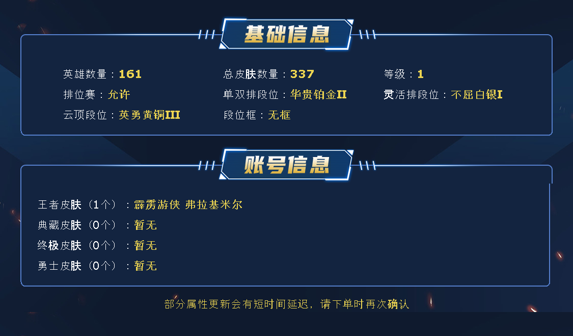 温馨提示:此账号为快速.上号模式登录,不需要输入账号密码,租用后- -键登录即可,如果出现登录异常等无法登录情况,只需要先打开游戏到登录界面,然后在用租号玩一键登录即可。 安全提示:使用外挂恶意刷分、撤单或者恶意投诉差评大将永久拉黑处理,请文明游戏 小子在这祝您游戏愉快,喜欢的点击收藏▼记得给小子个五星好评呦▼