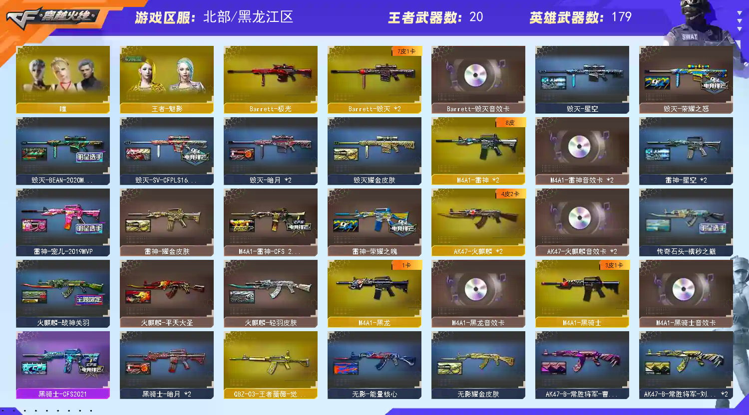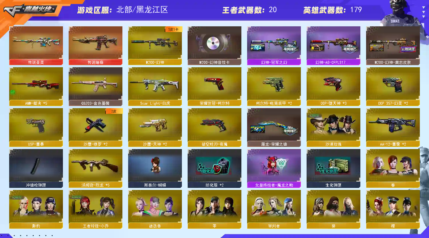 《传说圣灵》《传说暗裔》《m200幻神➕幻神ags17皮肤➕幻神冠军之幻皮肤➕幻神黄忠皮肤➕幻神音效卡》《5裁决》《usp雷暴 3cop堕天神 2柯尔特电竞装甲 2cop幻灵 世冠柯尔特 cop旗袍 1911大黄蜂》《世冠套》《电竞装甲套》《幻灵套》《堕天神套》《雷暴套》《白虎》《朱雀》《青龙》《王者火魄/冰魄》《qbz金色蔷薇》《qbz王者蔷薇》《烈火》《毁灭》《火麒麟》《黑龙》《雷神》《黑骑士》《黑武士》《6烈龙 斯泰尔蝴蝶 死亡之眼》《雷神精英刀锋 火麒麟绝迹 火麒麟灵狐 雷神小红》《寒冰征服者超越max》《金刚伞》《牛牛ak47》《四防沙漠玫瑰 四防影豹 四防王者魅影 四防王者玲珑小乔 四防灵狐者职业经理》《edg炫彩背包 超级背包 a背包套装扩展券》《火麒麟音效卡 黑骑士音效卡 雷神音效卡 黑龙音效卡 毁灭音效卡》