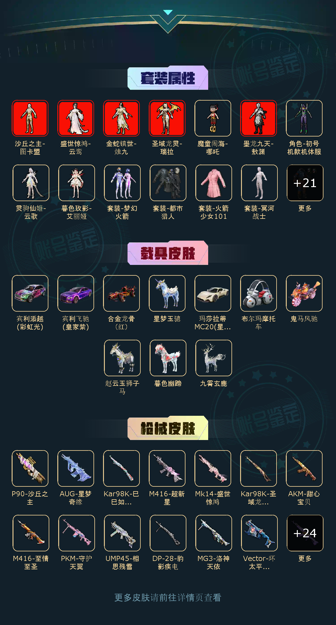 30粉,9载具,279套装,25王牌印记,无敌战神历史最高段,206184热力值 平底锅-林间仙鹿/AKM-甜心宝贝/SCAR-L-童趣迷兔/AUG-星梦奇缘/AUG-星之彼岸/GROZA-香水柠檬/M416-五爪金龙/AKM-魔法神域/M416-墨龙九天/M416-至情至圣/AUG-妙趣可丽/SCAR-L-机甲封神/M416-超新星/蜜獾-辉耀战甲/AKM-梦之光华/SCAR-L-魔童闹海 哪吒/Mk14-盛世惊鸿/Mk14-闲梦青缨/DP-28-暗夜鎏金/M249-彩虹甜喵/PKM-守护天翼/DP-28-圣堂之誓/MG3-洛神天依/DP-28-豹影疾电/UZI-绮梦青鸾/汤姆逊-怪笑疯兔/P90-甜蜜草莓/Vector-环太平洋/UMP45-相思残雪/P90-沙丘之主/烟雾弹-猫咪绅士/破片手榴弹-粉粉猫爪/Kar98K-圣域龙灵/AWM-花间之火/Kar98K-巳巳如意/宾利飞驰(皇家紫)/宾利添越(彩虹光)/鬼马风驰/合金龙骨(红)/玛莎拉蒂MC20(星石白)/暮色幽蹄/星梦玉骢/赵云玉狮子马/照夜玉狮子/布尔玛摩托车/