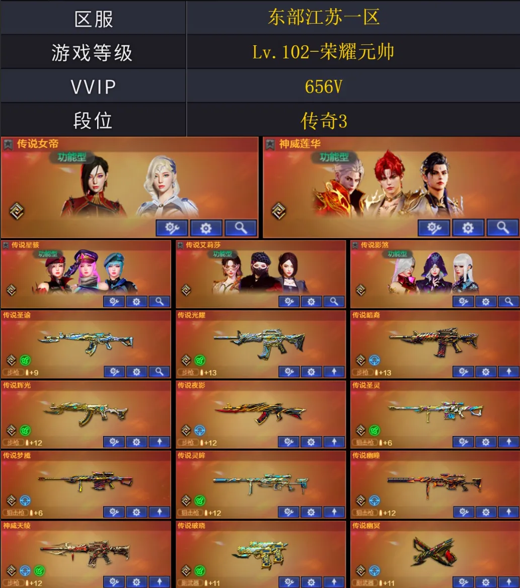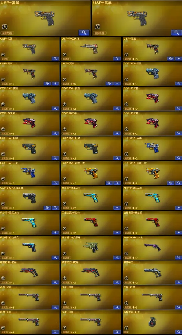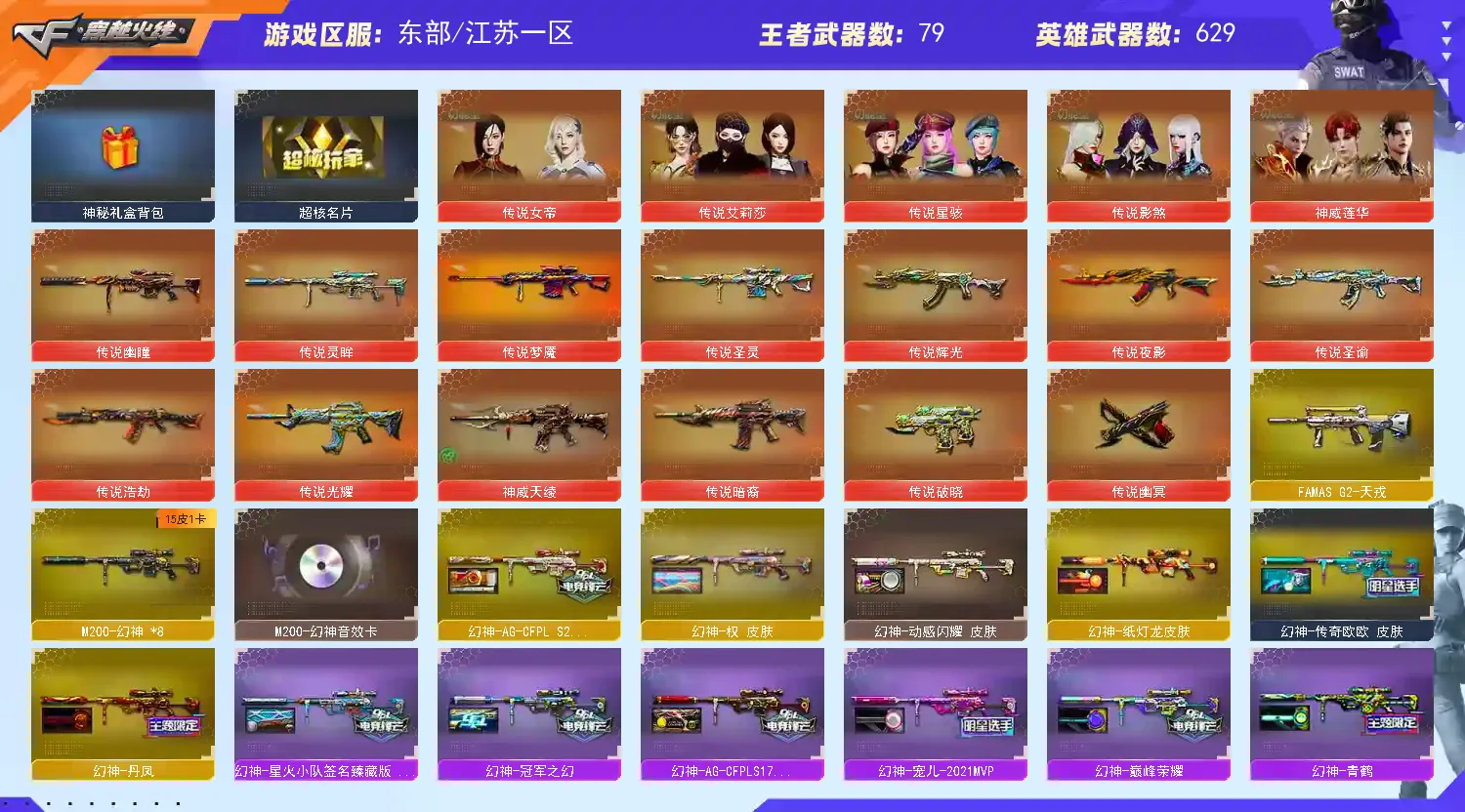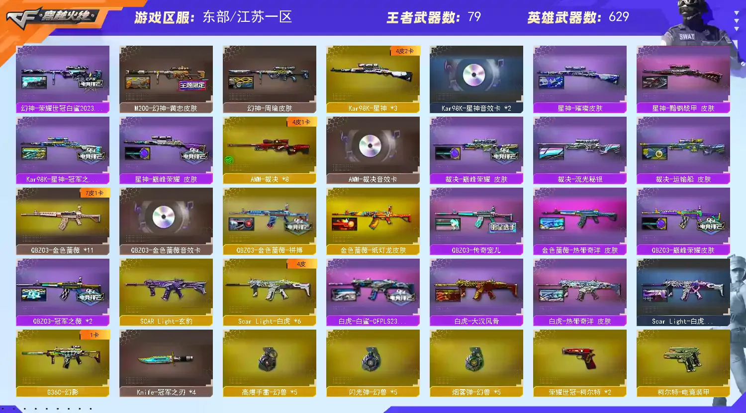 【稀有武器】:传说光耀/传说暗裔/传说辉光/传说夜影/传说圣灵/传说梦魇/传说灵眸/传说幽瞳/传说破晓/传说幽冥/M200-幻神(8)/Kar98K-星神(3)/VSK-94-金蚀/G36C-幻影/ScarLight-白虎(6)/M14EBR-玄武/M4A1-青龙/HK417-朱雀(3)/QBZ03-天罚(3)/M4A1-夜魔/M4A1-幻灵/M4A1-神工天巧/M4A1-雷霆/AK47-雷暴/M4A1-堕天神/雷霆之契(3)/USP-雷暴(3)/COP-堕天神(4)/破空枪刃-夜魔(2)/柯尔特-电竞装甲/COP357-幻灵(2)/柯尔特-竞技荣光/USP-神工天巧/天神-动感闪耀/COP357-云龙(2)/修罗-古蛇迷踪/破空枪刃/沙鹰-幻兽(5)/荣耀世冠-柯尔特(2)/COP357-雷霆王者-觉醒版(2)/柯尔特-冠军之特(3)/金色蔷薇-古蛇迷踪/QBZ03-云龙(2)/QBZ03-金色蔷薇(11)/QBZ95-幻兽/AK47-火麒麟(19)/AK47-麒麟(2)/M4A1-黑龙(10)/M4A1-雷神(15)/M4A1-黑骑士(11)/AK47-无影(6)/AK47-黑武士(9)/荣耀世冠-火麒麟(3)/荣耀世冠-雷神(3)/白虎-电玩蓝兔/Barrett-毁灭(17)/Barrett-极光(11)/AWM-裁决(8)/Barrett-电竞装甲/M200-竞技荣光/RPK-盘龙(8)/加特林-炼狱(15)/炼狱-风暴/汤姆逊-烈龙(6)/AA-12-雷霆(5)/炽芒蝶刃(2)/斩神刀-雷暴(2)/麒麟刺-堕天神(2)/龙啸-堕天神/马来剑-夜魔(2)/尼泊尔-电竞装甲/幻灵之锋/擎天-竞技荣光/唐刀-神工天巧/云龙扇(4)/女皇利刃-幻兽