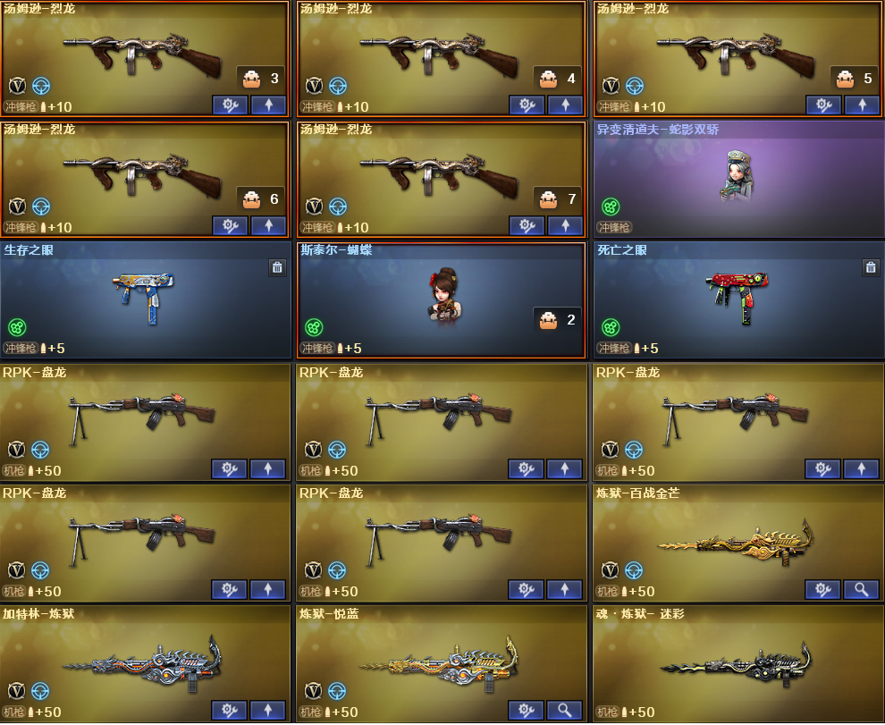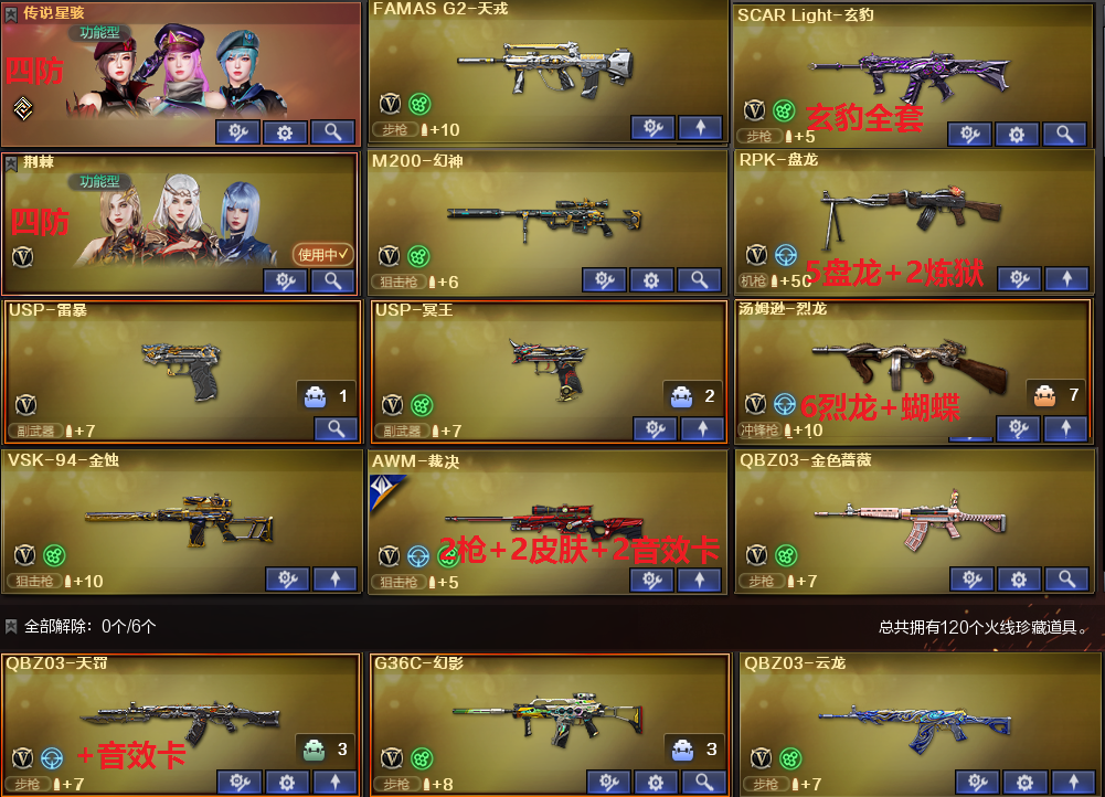 稀有武器:M200幻神、FAMS天戎、VSK金蚀、5盘龙+2炼狱+炼狱百战金芒、5烈龙+异变清道夫-蛇影双骄、G36C幻影、Scarlight玄豹X2、USP雷暴、USP冥王、QBZ天罚、QBZ云龙、QBZ金色蔷薇、火麒麟X4、黑龙、雷神X3、黑骑士X2、无影X2、死神、黑武士锦绣游龙、超新星热带奇洋、死神雪域霜狐、机械迷城穹宇、9A91烈火、黑骑士海王X2、天龙、毁灭X2、极光、裁决X2、A12雷霆、修罗X4、天神X2、Ana玄豹、屠龙X3、龙啸X2、擎天X2、麒麟刺、斩神刀雷暴、龙啸热带奇洋、丛林匕首玄豹、麒麟刺百战金芒、龙啸烈火龙威、MA凌龙、QBZ独角、源毁灭、M4赤狱骑士、M4苍鸣雷神、昌龙、AK再燃火线、黑骑士摸金校尉、黑武士暗月、火麒麟雷神、火麒麟能量核心、雷神冠军福建、烈火喵星特勤、爆炎激光-超越MAX、冰龙粉碎者-白马银枪、机甲撕裂者3、极光毁灭者-超越3、激光毁灭者3、KAC青曜、封神放逐者3、试炼破坏者3X2、神圣爆裂者3、征服者超越、阐释者、巡航者