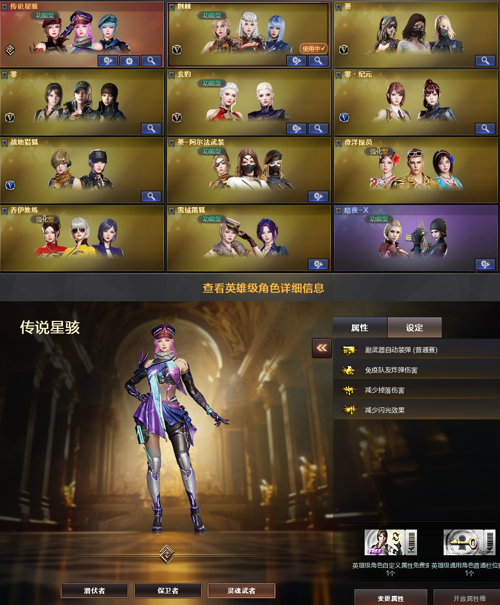 稀有角色:传说星骇(四防:减少闪光效果/免疫队友炸弹伤害/减少掉落伤害/副武器自动装弹)、荆棘(四防:生化背包变更+捕食者之眼+生化觉醒狂暴化+佣兵觉醒无需换弹)、葵、零、玄豹、零纪元、战地猎狐、葵阿尔法武装、奇洋探员、乔伊教练、雪域霜狐、暗夜X、芳心审判者