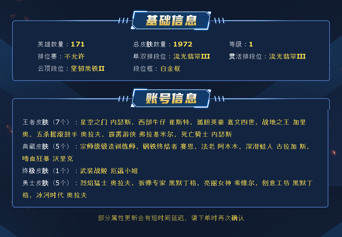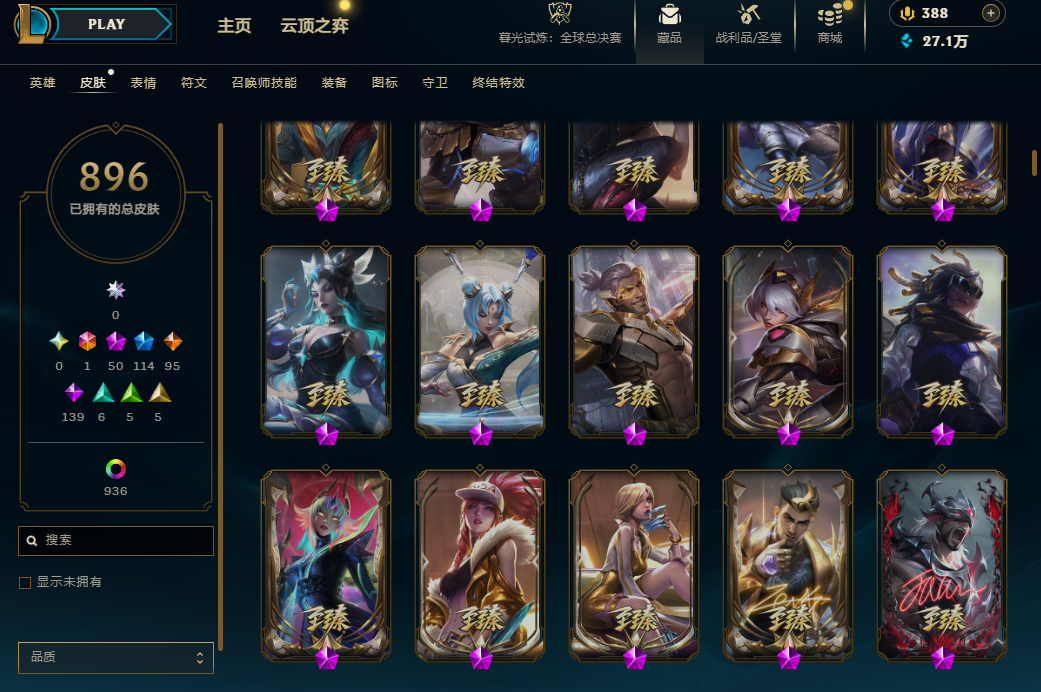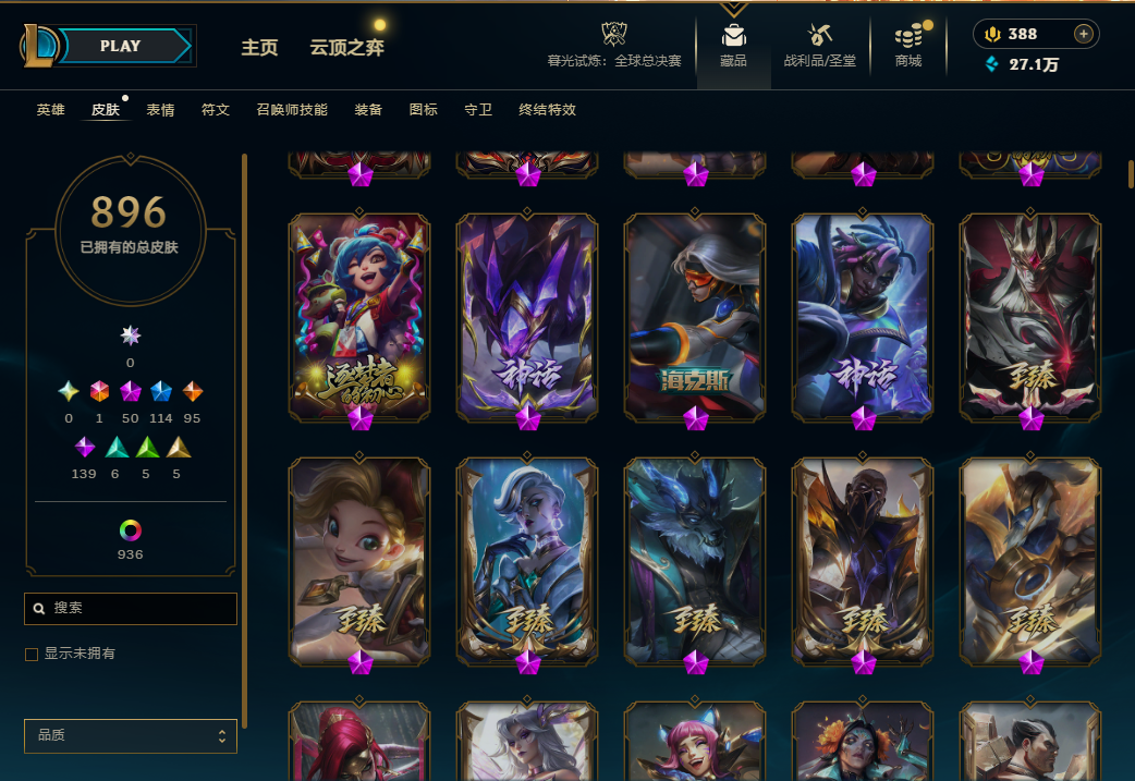 恕瑞玛1832总皮 | 50神话| 一终极皮 | 武装战姬 | 殿堂vn | 殿堂乐芙兰 | 无禁言可排位