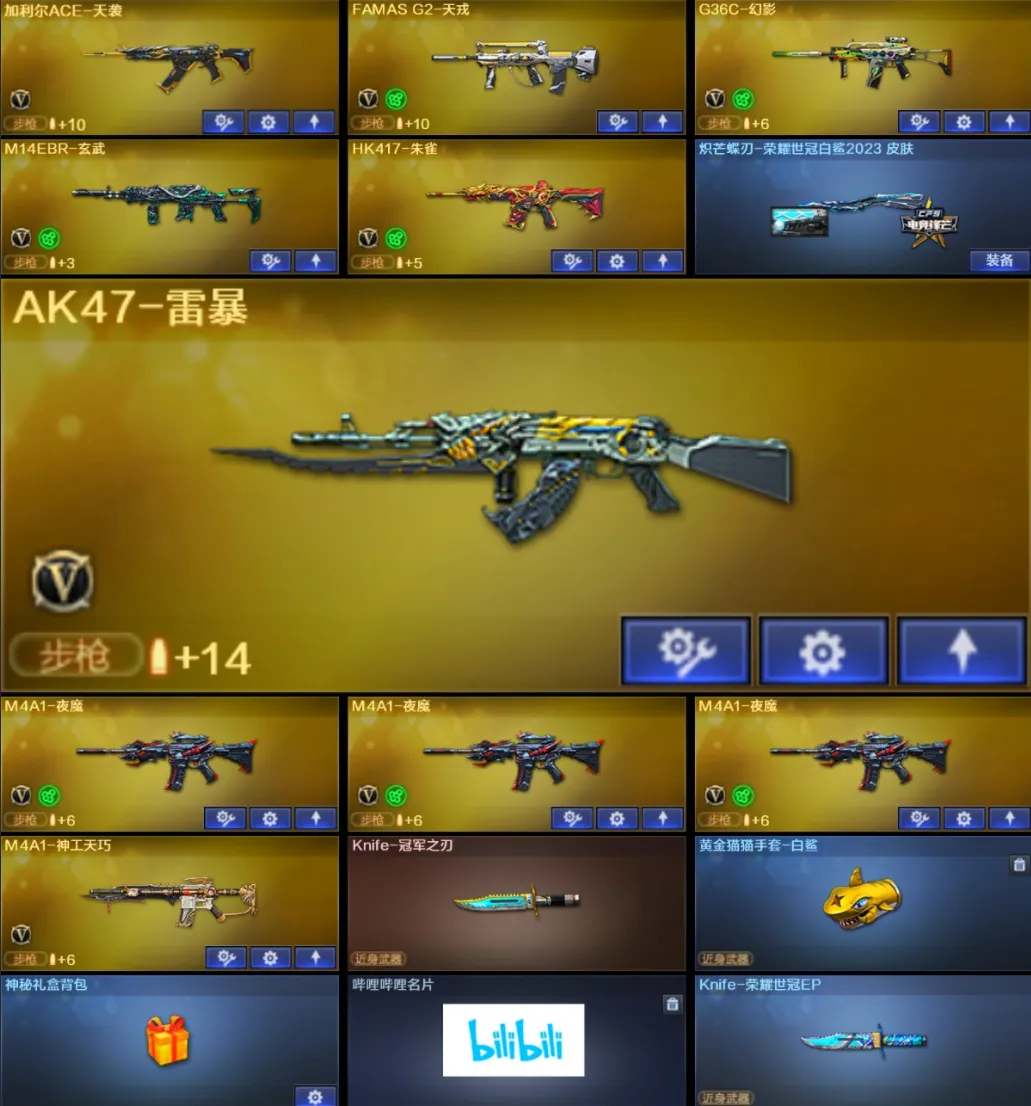 【其他亮点】:斯泰尔-蝴蝶/炼狱-迷你小钢/Knife-冠军之刃/VEPR-12-金魔(2)/贝雷塔687-射手座/黄金猫猫手套-白鲨/金刚伞-电玩红兔/哔哩哔哩名片