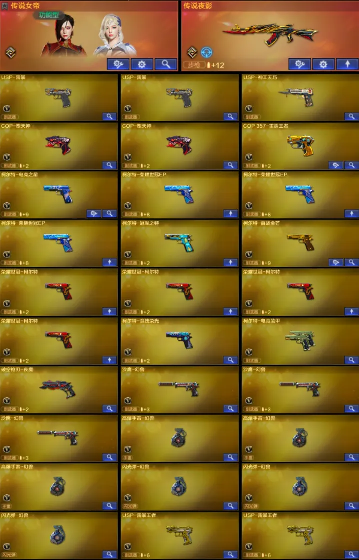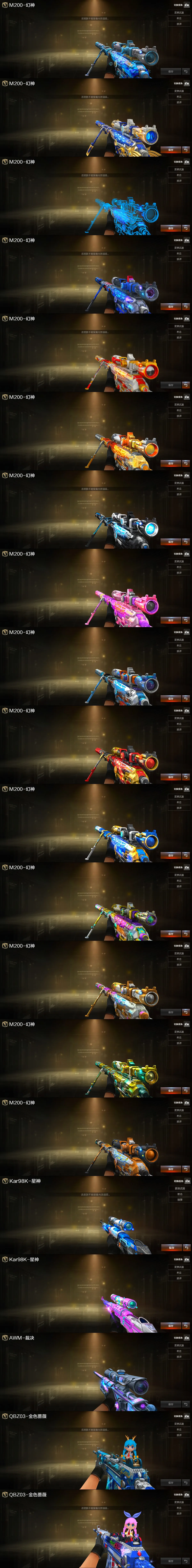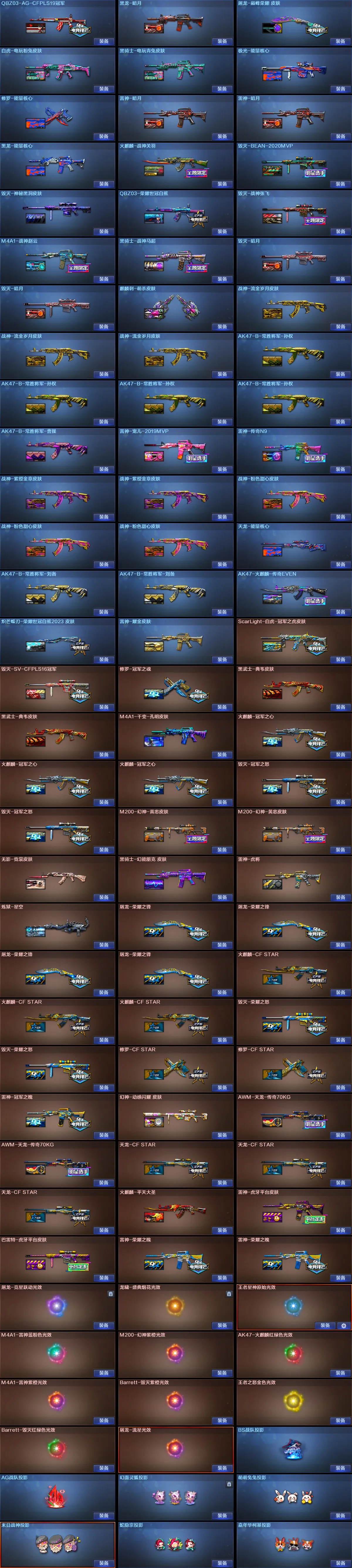 【稀有武器】:传说夜影/M200-幻神(2)/G36C-幻影/ScarLight-白虎(2)/M14EBR-玄武/HK417-朱雀/M4A1-夜魔(3)/M4A1-神工天巧/AK47-雷暴/USP-雷暴(2)/COP-堕天神(2)/破空枪刃-夜魔/柯尔特-电竞装甲/柯尔特-竞技荣光/USP-神工天巧/天神-动感闪耀/修罗-古蛇迷踪/沙鹰-幻兽(3)/荣耀世冠-柯尔特(4)/COP357-雷霆王者-觉醒版/柯尔特-冠军之特/QBZ03-金色蔷薇(3)/QBZ95-幻兽/AK47-火麒麟(6)/AK47-麒麟/M4A1-黑龙(2)/M4A1-雷神(9)/M4A1-黑骑士(5)/AK47-无影/AK47-黑武士/荣耀世冠-火麒麟/荣耀世冠-雷神/白虎-电玩蓝兔/Barrett-毁灭(7)/Barrett-极光/AWM-裁决(4)/M200-竞技荣光/RPK-盘龙(7)/加特林-炼狱(2)/汤姆逊-烈龙(6)/AA-12-雷霆/斩神刀-雷暴/马来剑-夜魔/擎天-竞技荣光/唐刀-神工天巧/女皇利刃-幻兽