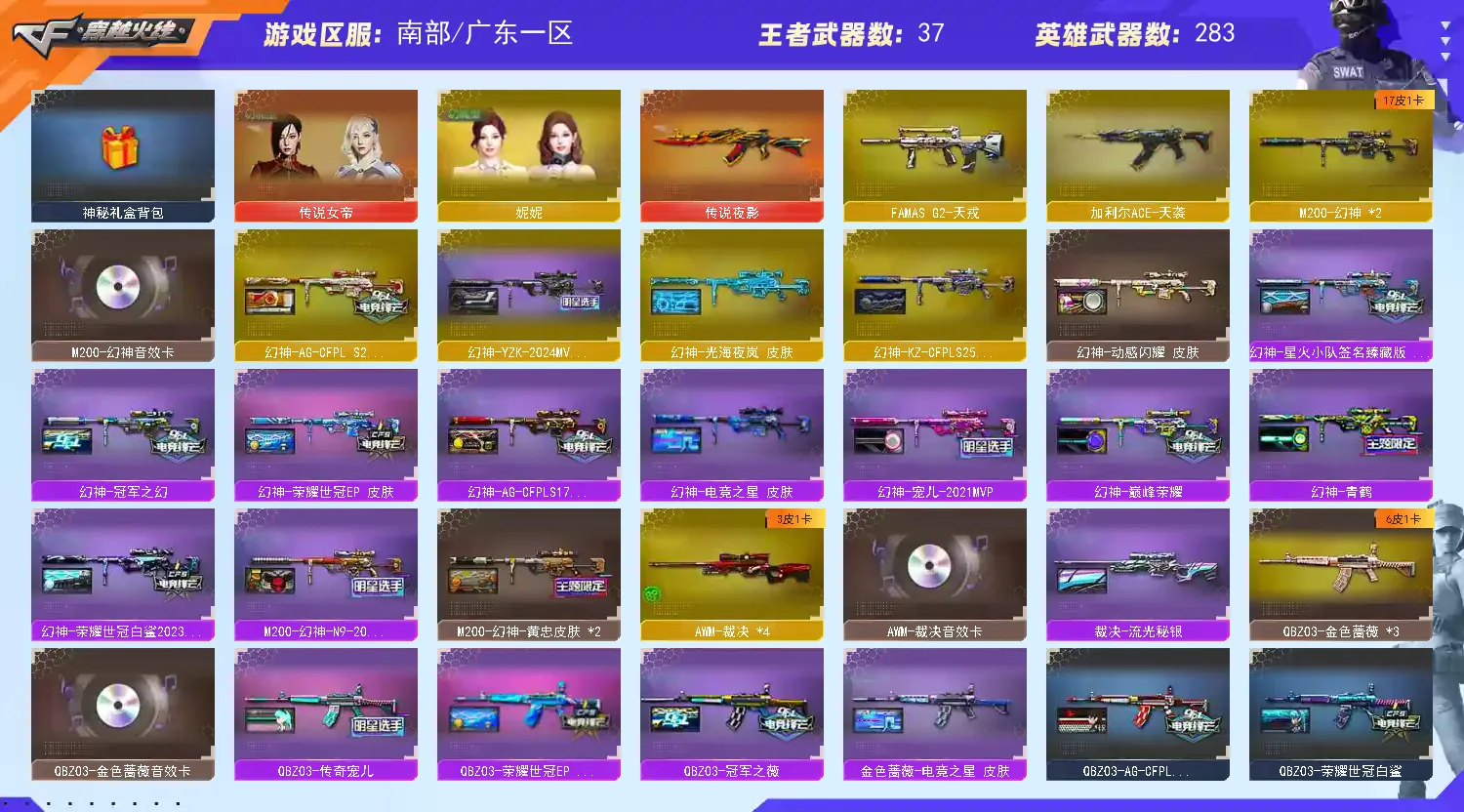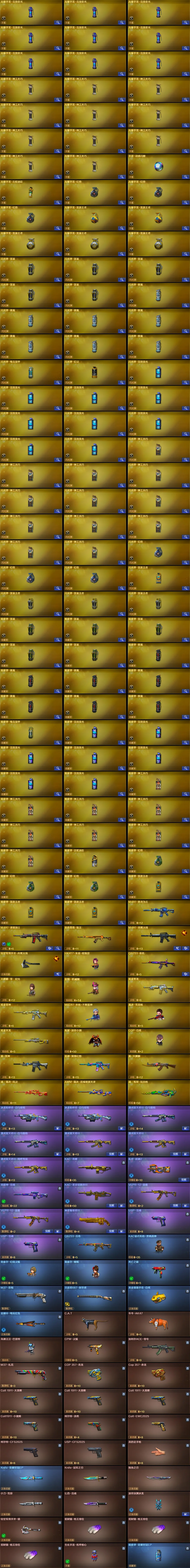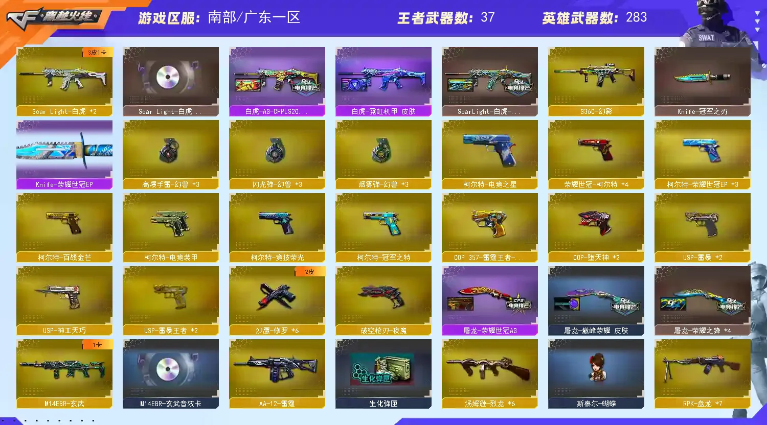 【稀有武器】:传说夜影/M200-幻神(2)/G36C-幻影/ScarLight-白虎(2)/M14EBR-玄武/HK417-朱雀/M4A1-夜魔(3)/M4A1-神工天巧/AK47-雷暴/USP-雷暴(2)/COP-堕天神(2)/破空枪刃-夜魔/柯尔特-电竞装甲/柯尔特-竞技荣光/USP-神工天巧/天神-动感闪耀/修罗-古蛇迷踪/沙鹰-幻兽(3)/荣耀世冠-柯尔特(4)/COP357-雷霆王者-觉醒版/柯尔特-冠军之特/QBZ03-金色蔷薇(3)/QBZ95-幻兽/AK47-火麒麟(6)/AK47-麒麟/M4A1-黑龙(2)/M4A1-雷神(9)/M4A1-黑骑士(5)/AK47-无影/AK47-黑武士/荣耀世冠-火麒麟/荣耀世冠-雷神/白虎-电玩蓝兔/Barrett-毁灭(7)/Barrett-极光/AWM-裁决(4)/M200-竞技荣光/RPK-盘龙(7)/加特林-炼狱(2)/汤姆逊-烈龙(6)/AA-12-雷霆/斩神刀-雷暴/马来剑-夜魔/擎天-竞技荣光/唐刀-神工天巧/女皇利刃-幻兽