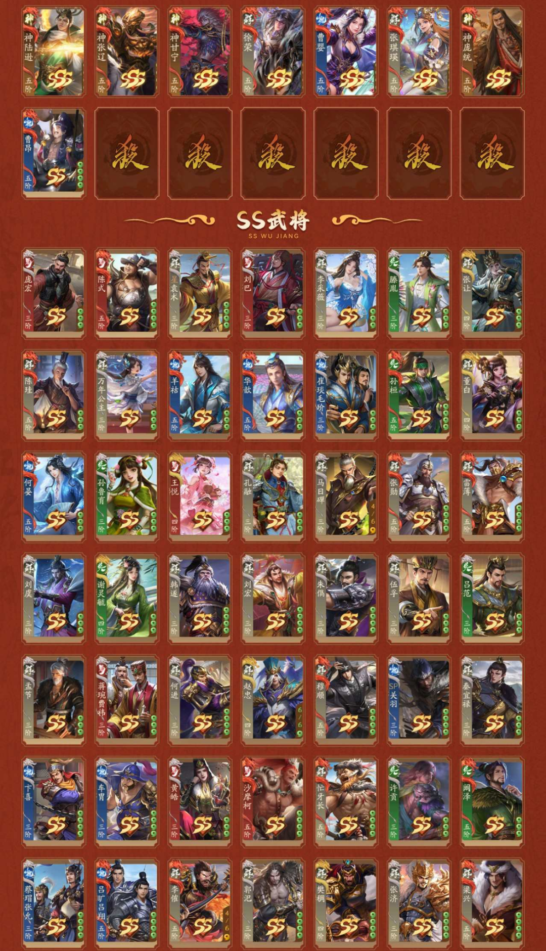 7神武,1谋,1乐,27阴间,2星河, [阴间] :神张飞(静),神张角(静),神姜维,神马超(静),乐蔡文姬,庞宏,袁胤,张旋,曹金玉(动),关索,赵襄(动),星曹仁,许劭(动),吕玲绮,黄舞蝶,滕公主,庞会,管宁,留赞,柏灵筠,郭照,曹宪,陈式,谋黄盖,蒲元,钟毓,张琪瑛(静);[神武]:神张飞(静),神张角(静),神姜维,神马超(静),神庞统;[谋]:谋黄盖;[乐]:乐蔡文姬; [星河] :星曹仁,星袁术,[SSS] :神张飞(静),神张角(静),神姜维,神马超(静),关索,赵襄(动),许劭(动),吕玲绮,黄舞蝶,滕公主,管宁,柏灵筠,郭照,谋黄盖,钟毓,张奋,关宁,骆统,王昶,阮籍,张徭,全惠解,张昌蒲(动),管亥,王荣,文鸯(静),兀突骨,夏侯霸(动),王双(动),雷铜,诸葛恪,杨修(动),诸葛果(静),灵雎(静),辛宪英,孙皓,士燮,王允,蒋干,刘琦,赵昂,来莺儿,黄权,张宝,管辂,葛玄,杜夔,吴范,高览,大乔小乔,SP马超,SP赵云(动),牛辅,公孙度,左慈(动),神吕蒙,神周瑜(动),神诸葛亮(动),神曹操(动),神吕布,神赵云(动),神司马懿,