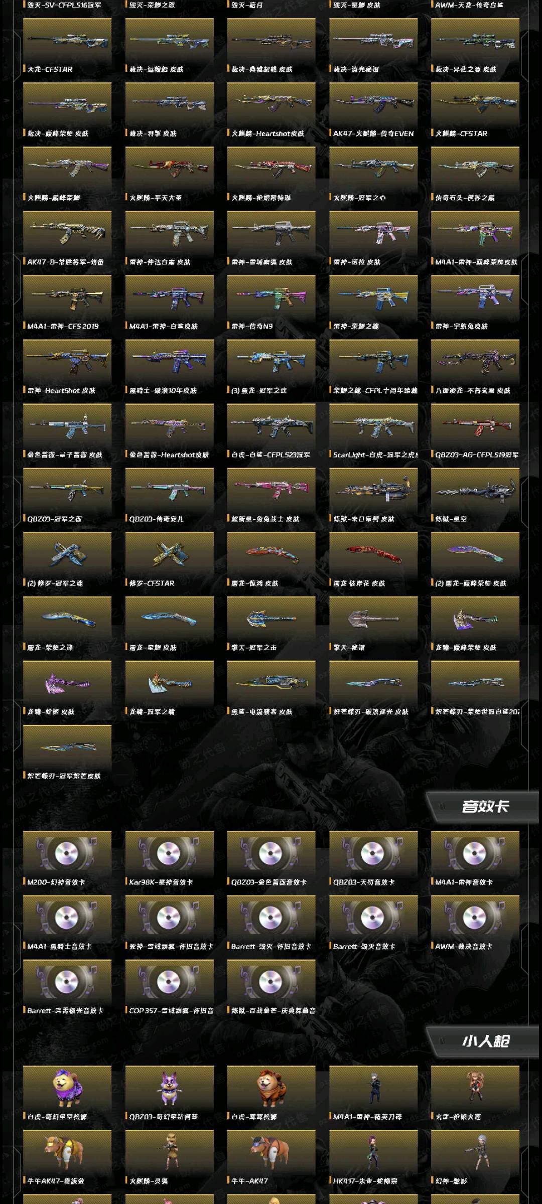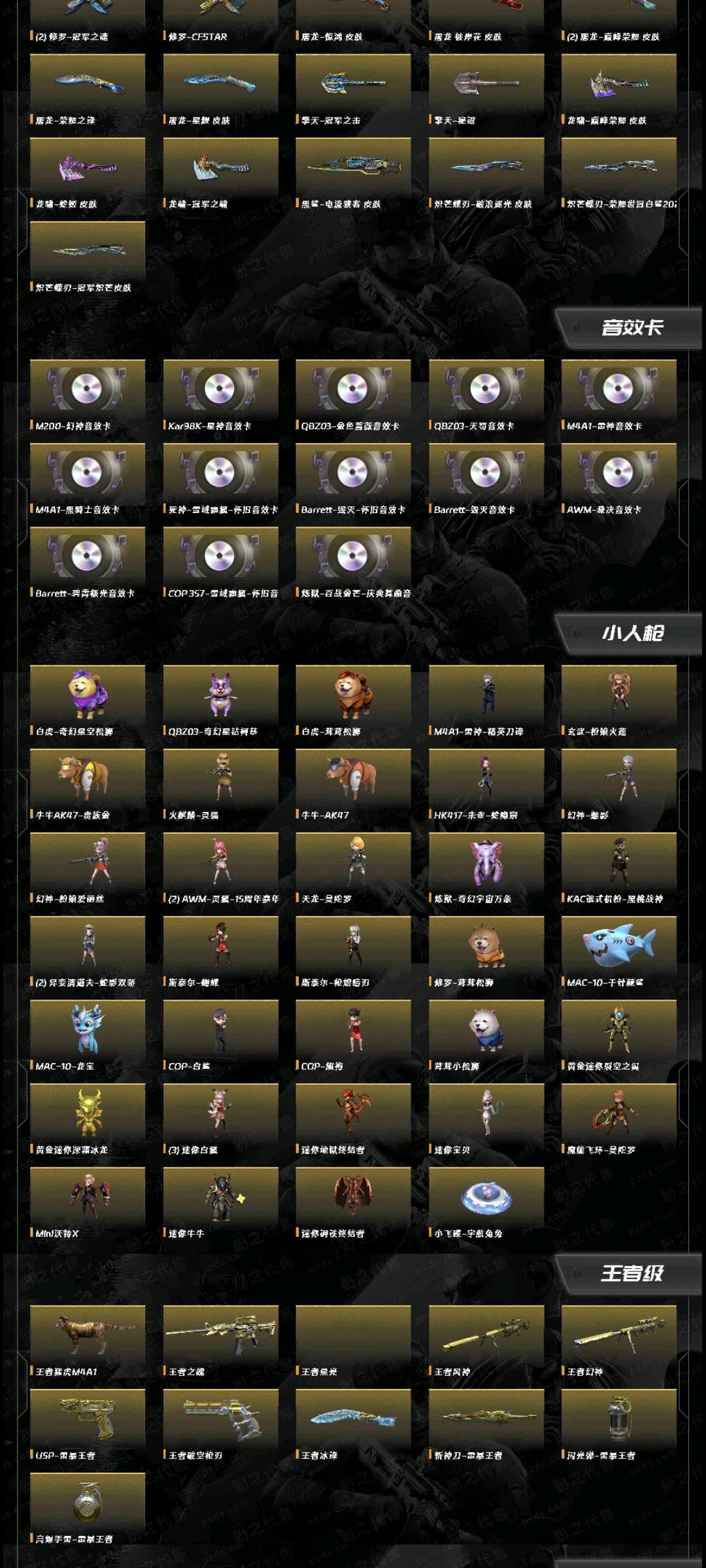 VIP5 132V,十一把高质量副武器 全部小人枪 15王者,传说圣谕/传说辉光(2)/传说夜影/传说幽瞳/传说幽冥(2)/幻神Heartshot /幻神电流骇客 /幻神星火小队/幻神AGCFPL S24冠军 /幻神欧欧 /幻神世冠白鲨/幻神荣耀世冠白鲨2023 /幻神巅峰荣耀/幻神星耀 /星神巅峰荣耀 /传说星骇 电竞教官-云悠悠/月兔特工/关小雨/枪娘樱/_晴雅/M200-幻神(8)/M200-竞技荣光(2)/Barrett-毁灭/Barrett-极光/Kar98K-星神/玄豹套装/M200-幻神音效卡/Kar98K-星神音效卡/QBZ03-金色蔷薇音效卡/QBZ03-天罚音效卡/M4A1-雷神音效卡/M4A1-黑骑士音效卡/死神-雪域霜狐-怀旧音效卡/Barrett-毁灭-怀旧音效卡/Barrett-毁灭音效卡/AWM-裁决音效卡/Barrett-碧霄极光音效卡/COP 357-雪域霜狐-怀旧音效卡/炼狱-百战金芒-庆典舞曲音效卡