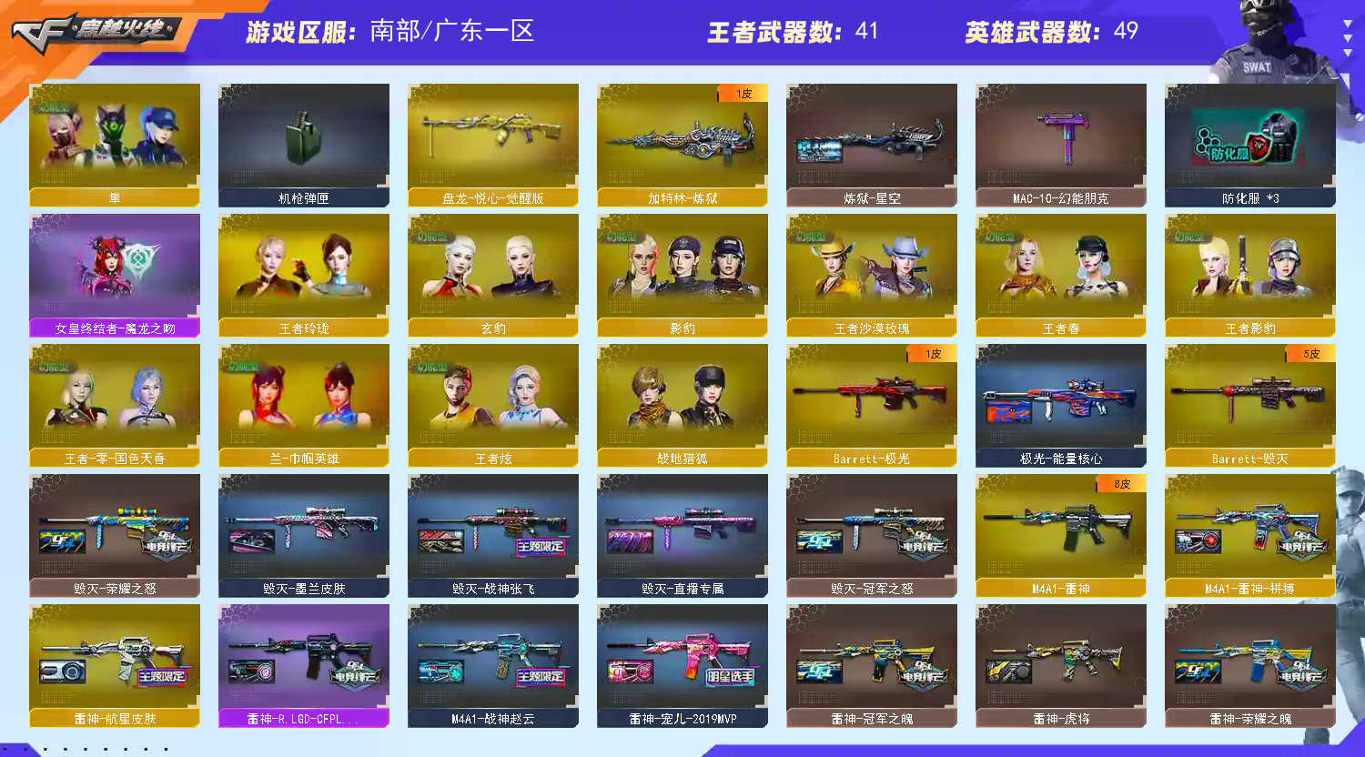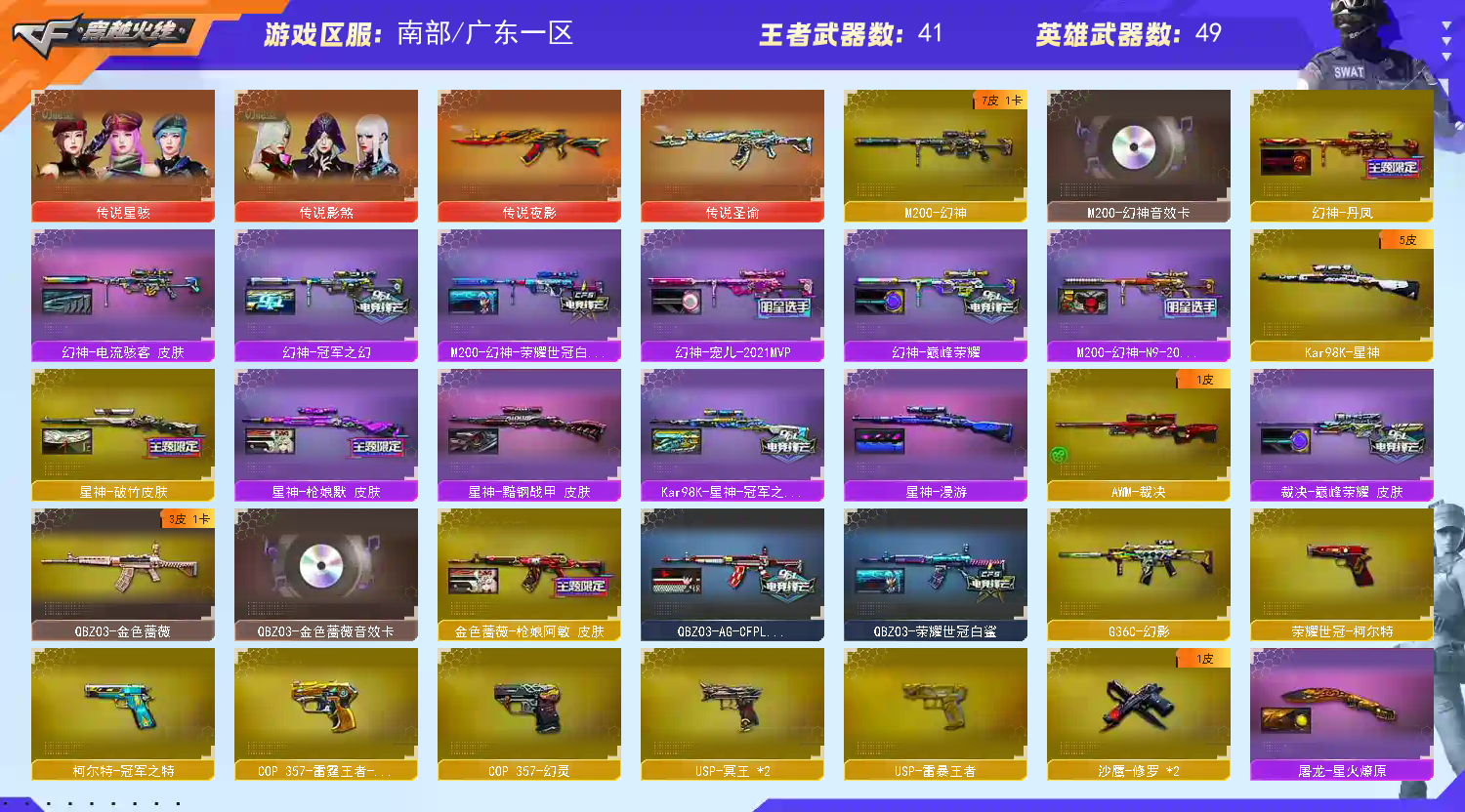 【亮点解析 双传说角色 幻神7皮带卡 武器齐全 冠军套 】【四防传说星骇 四防传说影煞】【m200幻神+音效卡+丹凤+宠儿+巅峰荣耀+n9皮肤+冠军之幻+荣耀世冠白鲨+电流骇客+冠军之特+冠军之刃】【98k星神+破竹+冠军之星+枪娘】【王者风神 王者星霆 】【传说夜影 传说圣谕 】【g36c幻影】【王者白虎】【qbz金色蔷薇+卡+枪娘+荣耀世冠白鲨+ag19冠军】【火麒麟+巅峰荣耀】【黑龙】【雷神+宠儿+冠军之魄+荣耀之魄+拼搏+航星】【黑骑士+卡】【毁灭+冠军之怒+荣耀之怒+虎牙】【极光】【裁决 +巅峰荣耀】【武器:王者之心 荣耀世冠火麒麟 荣耀世冠雷神 白虎之魄 雷霆王者 炼狱 】【9手枪:修罗 幻灵 usp冥王*2 荣耀世冠柯尔特 雷霆王者 冠军之特 usp雷暴王者】【9刀具:屠龙 麒麟刺 幻灵之峰 王者之锋 王者之击 荣耀世冠龙啸 雷霆王者之锋 王者玉锋 王者冰锋】【9雷套:雷暴雷 幻灵雷*2 雷霆王者雷*3 雷暴王者雷*3】【小人枪:星神炽天使】【音效卡:幻神音效卡 黑骑士音效卡 金色蔷薇音效卡 】【四防角色:隼 王者春 王者零国色天香 王者沙漠玫瑰 王者影豹 王者炫 职业经理 女主播】