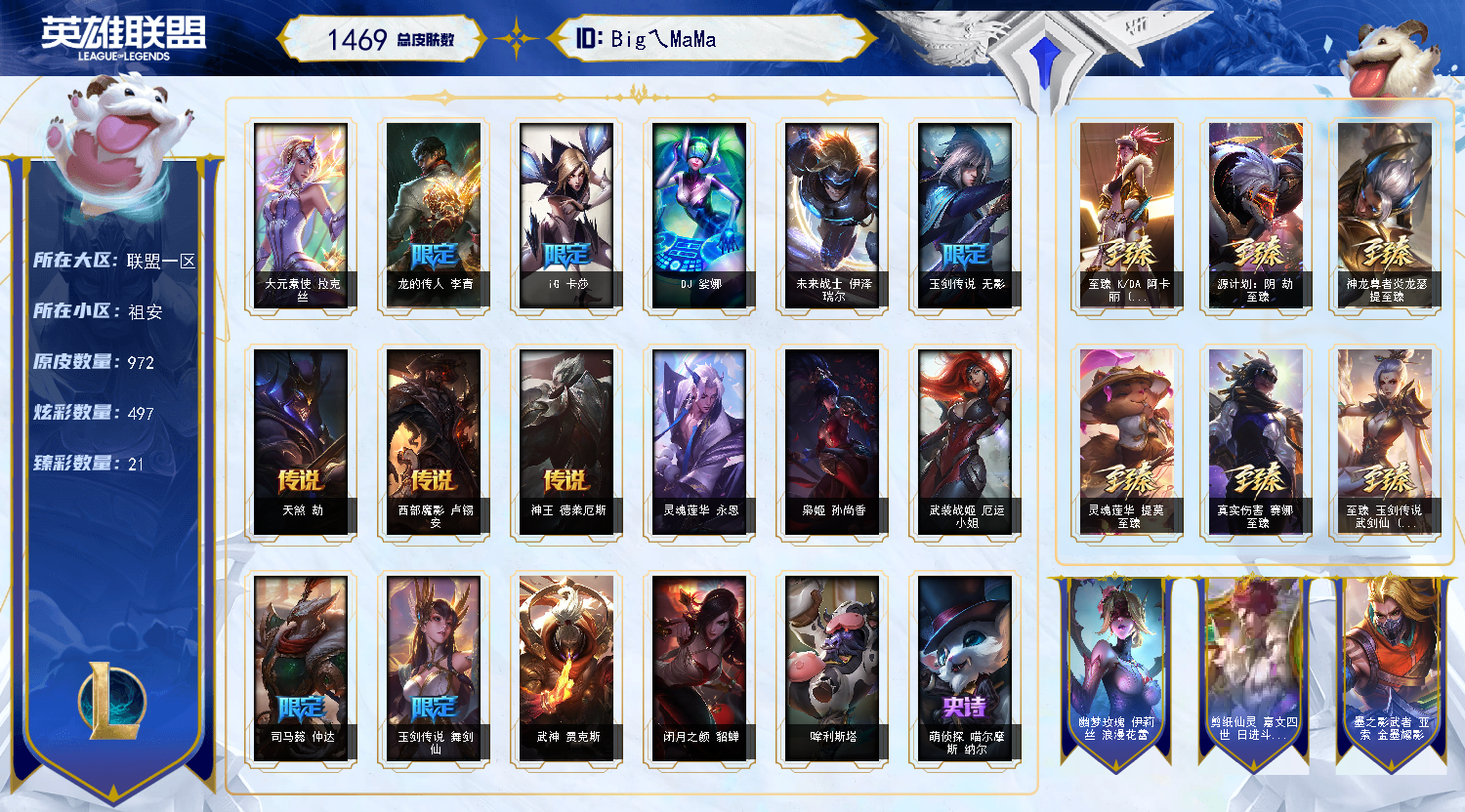 龙的传人李青/灵魂守卫乌迪尔/大元素使拉克丝/武装战姬厄运小姐/摄魂使者薇恩/2013 SKT T1冠军套/2015 SKT T1冠军套/2016 SKT T1冠军套/SSW冠军套/SSG冠军系列FNC冠军套/暗杀星冠军套/