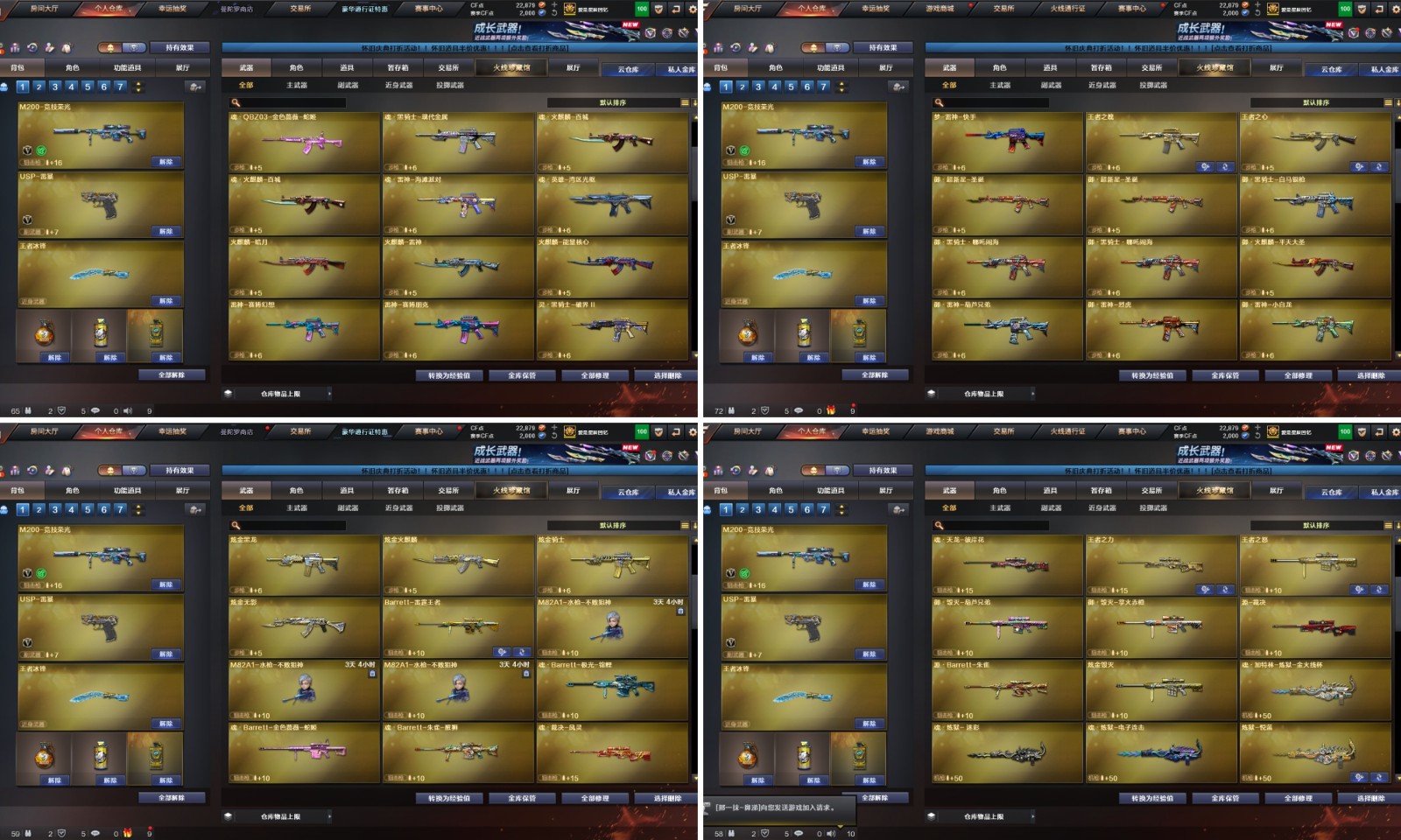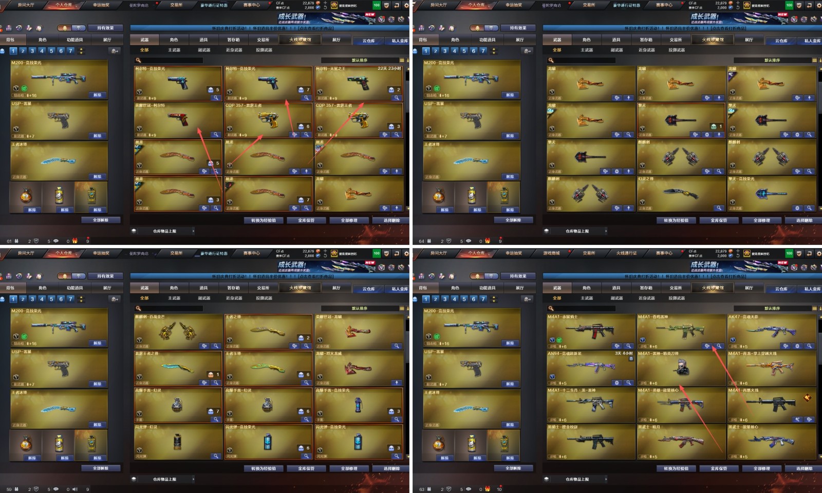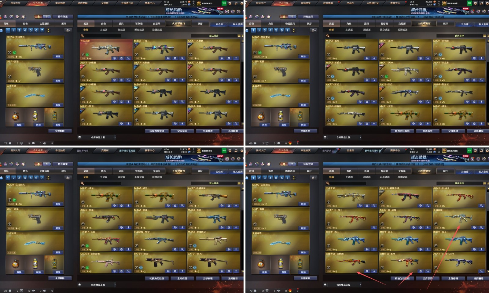 【其他重要武器】炫金火麒麟/炫金骑士/炫金黑龙/炫金无影/炫金毁灭/M4A1-再燃火线/黑骑士-摸金校尉/M4A1-十二生肖·龙-雷神/M4A1-英雄-能量核心/黑武士-能量核心(2)/火麒麟-能量核心/火麒麟-暗月/激光毁灭者I/冰龙粉碎者-白马银枪/激光毁灭者III-白马银枪/海浪AK47-浏览器(2)/AK47-SS-9周年/黄金AK-47(2)/联想锋行黄金AK(3)/QBZ03-烛龙(2)/AK47-盛典-CFS 2022/M14EBR-炎龙/QBZ03-锋芒破茧/红龙AK47(2)/AK47-丹龙/AK103-神秘黑洞/QBZ03-麟龙/Scarlight-炫彩/AK47-十二生肖-蛇(2)/雷神-赛博幻想/AK47-大帝林肯/AK47-B-十周年/AK-47-二次元/M4CQBR-AP-孔明/AK47-绚樱/AK-12-CFS2017纪念版/梦-雷神-快手/M4A1枪王排位II/QBZ03-吕布/M4A1-S-十周年/9A-91-圣诞/百城AK47/AK47-万圣节2021/AK47-娜塔莎/AK47-轮回/雷神-赛博朋克/AK-103-红色悦动/深海AK47-管家/Scar-Light-赤血龙魂/AK47枪王排位II/M4A1-紫狱/HK417-红龙/9A91-赤血龙魂/AK47-圣诞节[2019]/AK47-枪娘/M4A1-电音/AK47-万圣节2018/M4A1C-死亡之翼/AK47-齐天大圣/AK47-破空冰刃/9A-91翡翠/M4A1-十年火线/AK47-雷蛇/M4A1-PINK/M4A1-破空冰刃/AK47-青龙/AK47-十年火线/M4A1-青龙./M4A1-秘银赤龙/AK12-枪王排位/凤凰之魂/M4A1-战龙/56式步枪-梨花/9A91-蓝色骑士/AK47-肯德基/9A91-2017万圣节/神罚(2)/AWM-银月/AWM-盛典-CFS 2022/AWM-圣诞2013/M200-庆典-CFS 2021/AWM-小故障/98K-炫彩/M200-牡丹/Barrett-麟龙/AWM-S/M82A1-飞龙在天/黄金AWM/AWM-A枪王排位II/雷蛇AWM/百城AWM/AWM-蓝水晶/AWM-深海猎手/Barrett-御龙/Barrett-孔明/AWM-摸金校尉/Barrett-战龙/AWM-A-圣诞2021/98K-火线13周年/Barrett-怒火大圣/AWM-CFS 2020/AWM-卡通/AWM-红色悦动/Barrett-翔龙/AWM-万圣节刀锋/巴雷特-情人节2020/AWM-T/AWM-枪娘/98K-烛龙/AWM-涂鸦/M82A1-红龙/AWM-2018圣诞/AWM-7周年/AWM-圣诞/98K-蓝色骑士/M200-涂鸦/蓝色魅影/AWM-Pink/AWM-A/AWM-A-彩虹/破天九龙/末日裁决者/巨龙咆哮Ⅲ/M240B-卡通/KAC-耀龙/MG3-翔龙/MG4-蓝色骑士/死亡之眼-电子连击/EVOIII-机甲核心/斯泰尔-巧克力(2)/EVOIII-萌杀(2)/死亡之眼-庆典-CFS 2021/斯泰尔-CFS2017纪念版/斯太尔-能量核心/P90-炫彩/EVO III-赤血龙魂/雷蛇冲锋枪/死亡之眼/Spas-12-幻能朋克/神圣爆裂者III-蛇姬/Spas-12-黑金(2)/SPAS-12-雷电核心/修罗-年鹏/MAC-10-幻能朋克/幻影沙鹰-枪王排位(2)/Colt1911-彩蝶/愤怒公牛左轮-枪王排位(2)/真的是手枪/沙漠之鹰-盛典-CFS 2022/Anaconda-麟龙(2)/COP 357-平天大圣(2)/沙鹰-枪王排位(2)/COP357-十二生肖·羊/新USP-枪王排位奖励(3)/COP-金蝉子-枪王排位(2)/凤凰之火/COP357-神秘黑洞/COP-机甲刑天/毛瑟-庆典-CFS 2021/MAC-10-涂鸦(2)/柯尔特-百城/COP357-朋克/COP-青帝/USP-黑大圣/新USP-怒火大圣/迷彩沙鹰-70KG/Cop357-赤龙/幻影Anaconda-枪王排位/沙鹰-能量核心/COP 357--绚樱(2)/Anaconda-炽焰核心/Anaconda-雷电核心/COP 357-青龙/沙鹰-雷蛇/沙鹰-青龙/凤凰之灵/沙鹰-万圣节2018/柯尔特双枪-2017万圣节/轻型军用手斧-再燃火线/虹光丛林匕首-枪王排位(3)/尼泊尔军刀-战龙/猫猫手套/斩神刀-御龙/幻影双斧-枪王排位/尼泊尔-庆典-CFS 2021/不灭之拳/虹光女皇利刃-枪王排位/黄金猫猫手套-白鲨/军用手斧-能量核心/斩魔刀-怒火大圣/尼泊尔-CFS 2020/幻影扳手-枪王排位/丛林匕首-卧龙/鹰爪-枪王排位/军用铁锹-飞龙在天/丛林匕首-枪王排位/军用铁锹-赤龙/啸天/收割者-枪王排位/无畏之矛/迷你生化手雷(2)/生化手雷-机甲核心(2)/生化手雷-小钢(5)/疾爆手雷-河马/惨叫鸡手雷-惨叫迹(2)/闪光弹-枪王排位(6)/胜利奖杯烟雾弹-枪王排位(3)/胜利奖杯闪光弹-枪王排位(2)/幽灵宝宝手雷/黄金刀锋手雷(2)/高爆手雷-大乔/闪光弹-貂蝉/惨叫鸡高爆手雷/强化版迅捷虫手雷/手雷-能量核心(2)/胜利奖杯手雷-枪王排位/闪光弹-小乔/掌火手雷