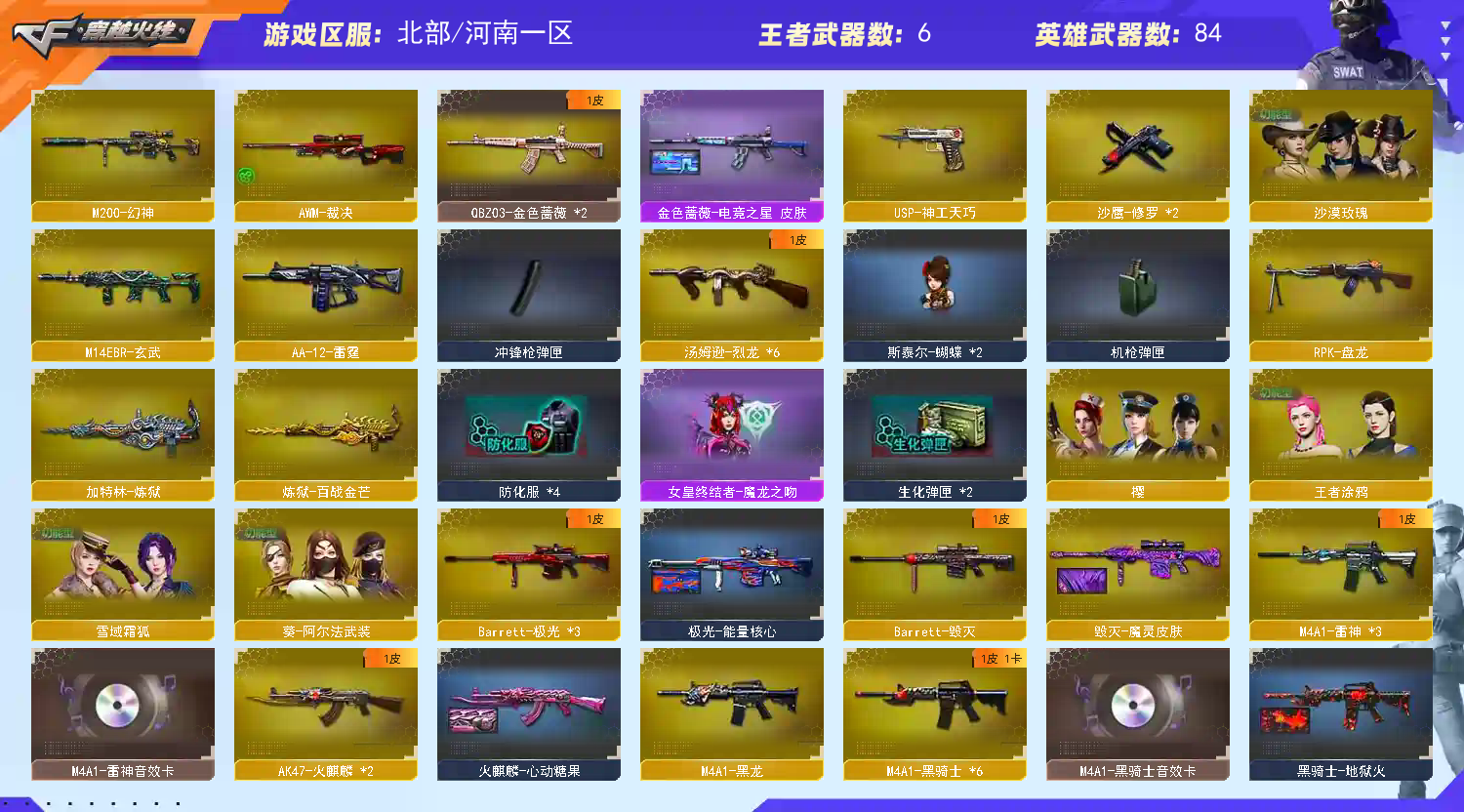 稀有武器:M200幻神、烈龙X6(末日皮肤)+斯泰尔蝴蝶、QBZ金色蔷薇X2、HK朱雀、青龙、玄武、M4神工天巧、火麒麟X2(雷神皮肤、心动糖果皮肤)、雷神X3、黑龙、黑骑士X6(地狱火皮肤)、武圣、无影神兵利器、死神雪域霜狐、机械迷城穹宇、烈火动感闪耀、黑骑士海王X3、白虎电玩蓝兔、天龙(能量核心皮肤)、毁灭(魔灵皮肤)、极光X3、裁决、Barrett朱雀、Barrett电竞装甲、暗月传说X4、盘龙、炼狱、王者之翼觉醒、王者白虎觉醒、王者之击觉醒、炼狱百战金芒、A12雷霆、修罗X2(CFstar皮肤)、Glock武圣、USP神工天巧、天神动感闪耀、屠龙、龙啸、擎天、麒麟刺、尼泊尔雷霆、尼泊尔电竞装甲、唐刀神工天巧、屠龙动感闪耀、龙啸云海游龙、麒麟刺百战金芒、腐蚀激光超越MAX、毁灭征服者超越6、激光毁灭者超越2、激光毁灭者超越3、试炼破坏者3、征服者超越1X2