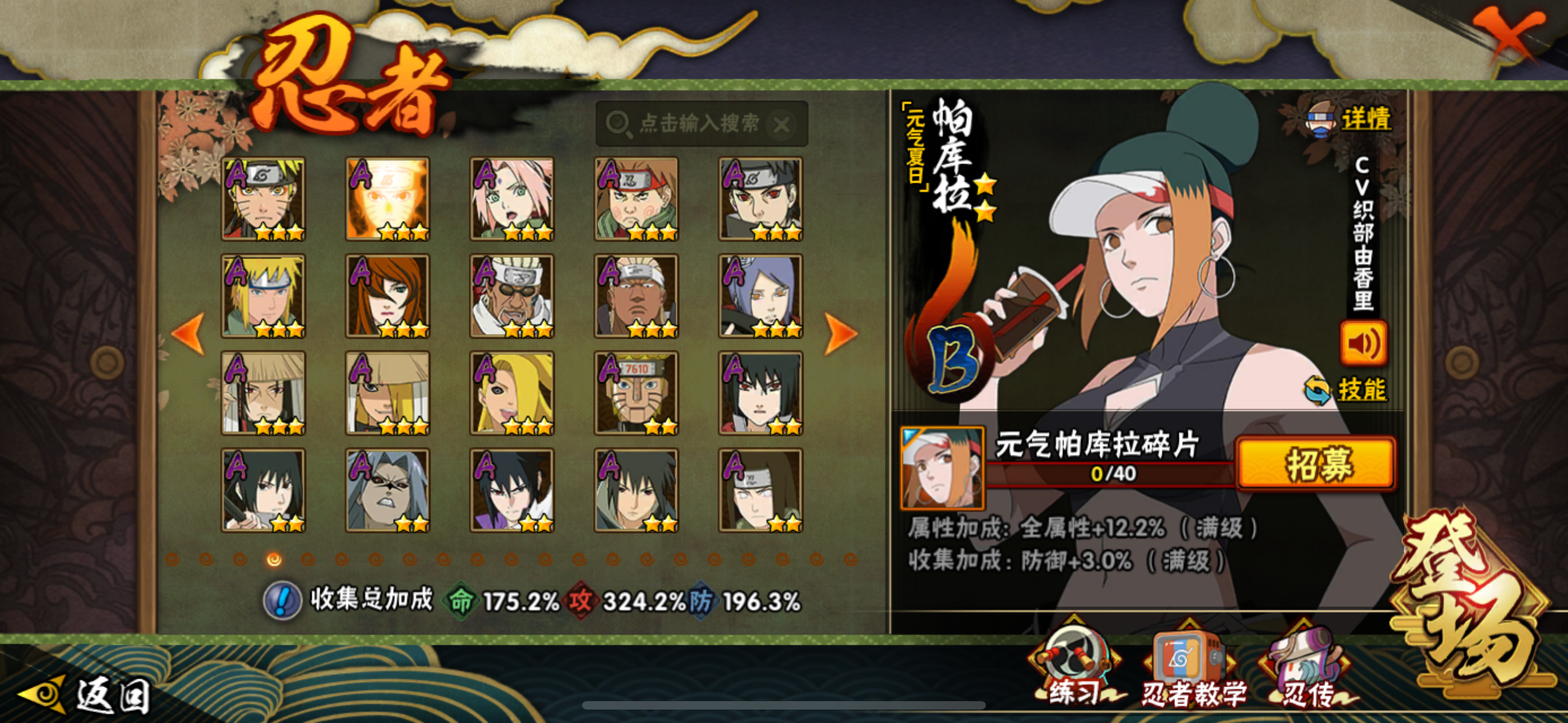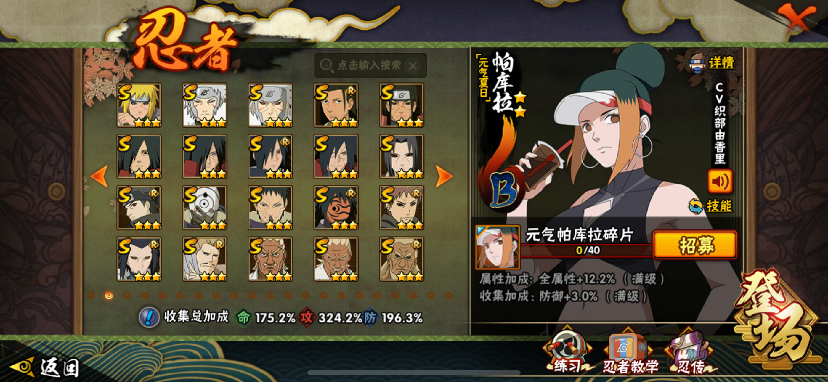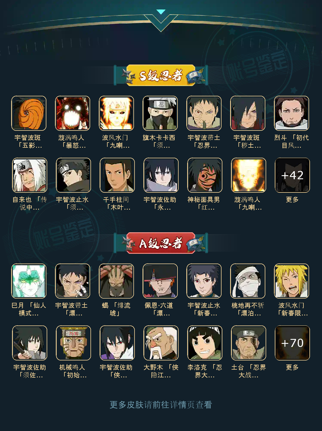 宇智波止水「新春限定」/桃地再不斩「漂泊武士」/蝎 「绯流琥」/佩恩·六道 「漂泊浪客」/波风水门「新春限定」/巳月 「仙人模式」/宇智波带土 「漂泊浪客」/烈斗 「初代目风影」/神秘面具男 「红夜之刃」/宇智波斑 「秽土转生·解」/自来也 「传说中的三忍」/波风水门「秽土转生」/千手柱间 「木叶创立」/宇智波止水 「须佐能乎」/漩涡鸣人 「九喇嘛连结」/漩涡鸣人 「暴怒·第六尾」/宇智波斑 「五影会谈」/宇智波斑「白面具」/宇智波带土「忍界大战」/三代目风影 「秽土转生」/宇智波佐助 「永恒万花筒」/佩恩·天道「超」/旗木卡卡西 「须佐能乎」/波风水门 「九喇嘛连结」
