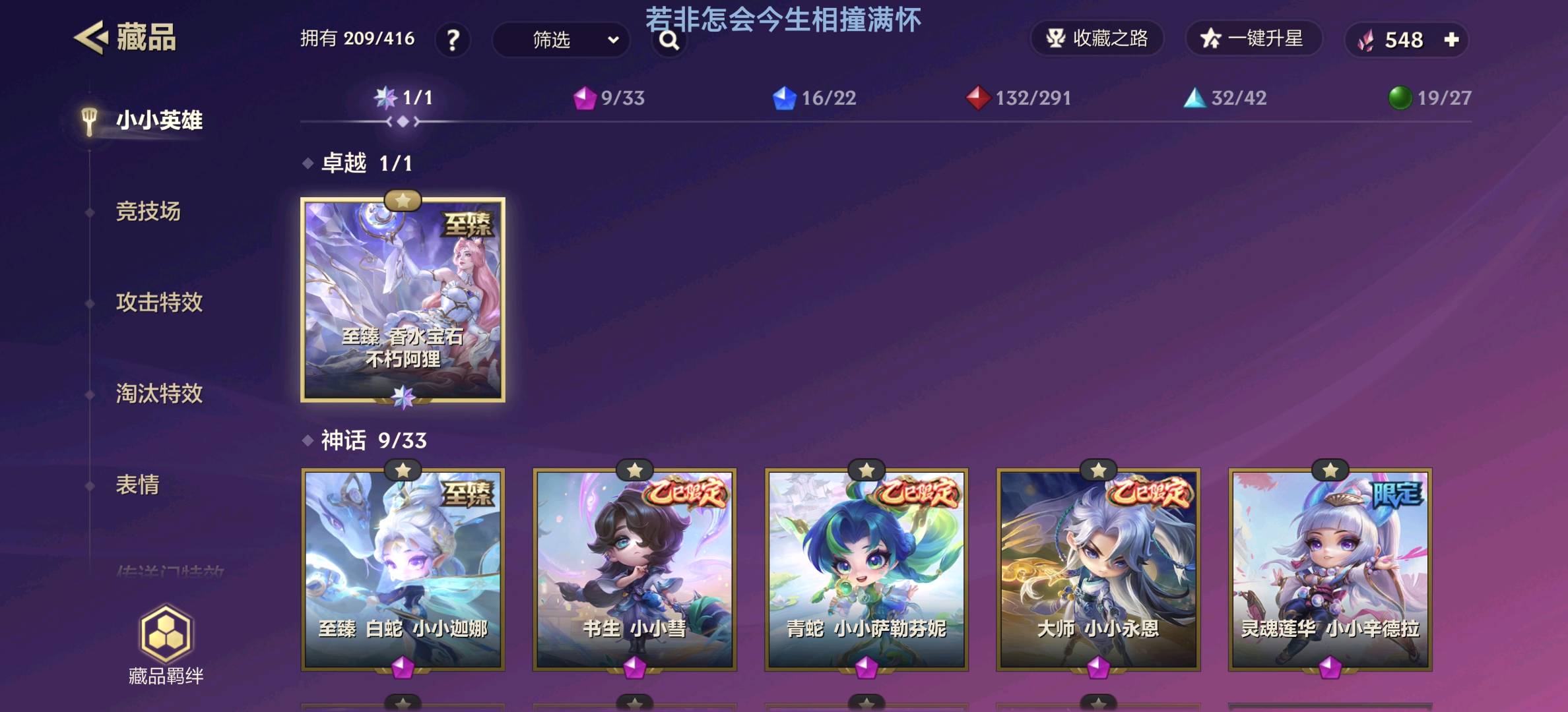 209小小英雄/1卓越/9神话/至臻香水宝石不朽阿狸/至臻白蛇小小迦娜/27攻击特效/10棋盘