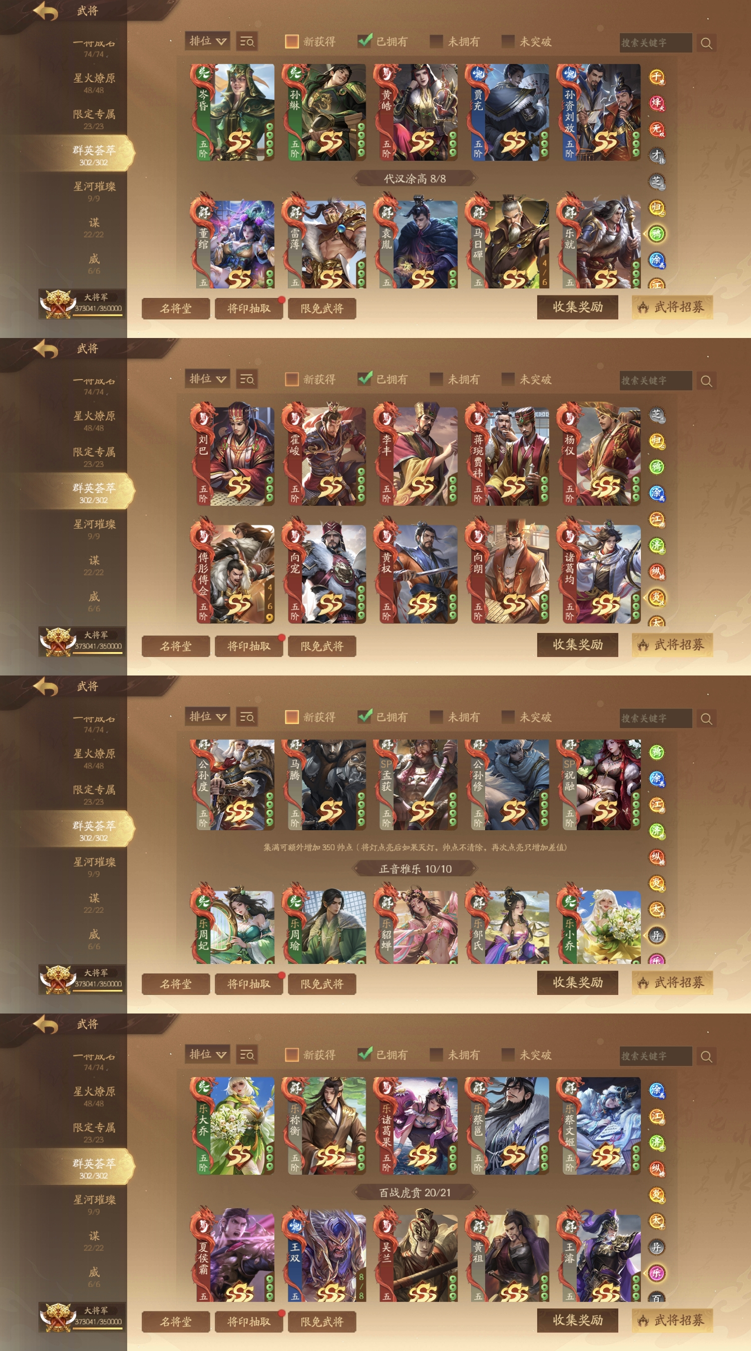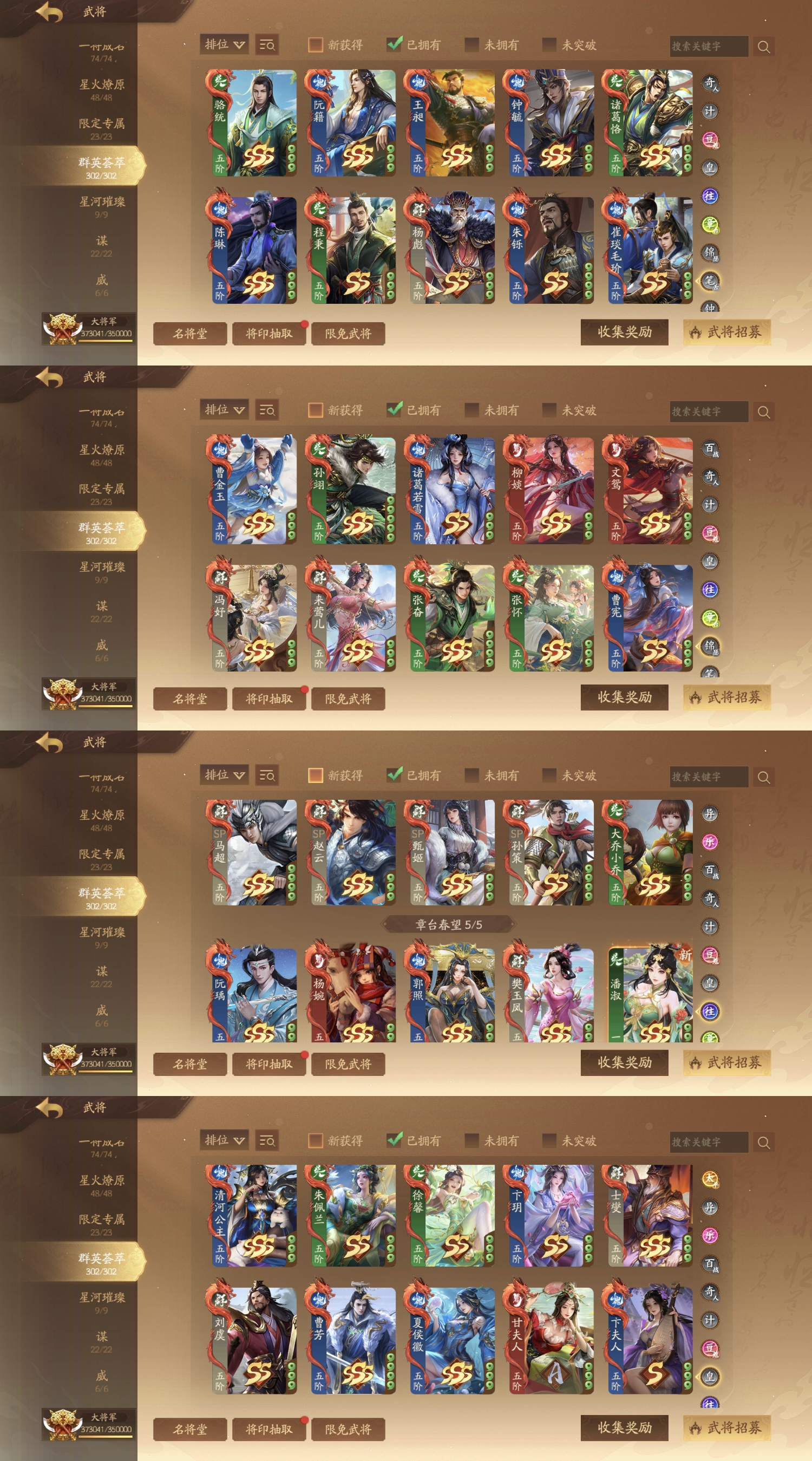 武诸葛(千古)、武陆逊(千古)、威曹操、威马超、威张辽、威吕布(传)、威孙权(传)、威曹丕、神姜维、神马超(动)、神张飞、神张角(动)、神邓艾(动)、神庞统(动)、神黄忠(传)、神华佗(动)、鲍三娘(动)关索(动)、曹纯、张琪瑛(动)、曹婴(动)、徐荣(至臻动)、赵襄(至臻动)孙翎鸾、周夷(动)、卢弈(动)、曹轶、谋周瑜(至臻动)、谋司马懿(至臻动)、谋郭嘉(至臻动)、谋贾诩、谋荀彧、谋司马师、谋曹爽、谋蒋济、谋王凌、谋关谋沮授、平、谋诸葛瑾、谋典韦、谋张绣、谋陈琳、谋董承、谋刘协、谋曹洪、谋黄盖、谋程昱、谋骆统、许绍、关宁、胡金定、南华老仙(动)、张璇、夏侯玄、张媱、吕玲绮(动)、黄舞蝶、滕公主、庞宏、庞会、袁胤(传)、管宁、夏侯均、sp祝融、乐周妃、乐蔡文姬(动)、乐周瑜、乐小乔(动)、乐大乔、乐蔡邕、乐诸葛果、乐邹氏、乐貂蝉、乐祢衡、周宣(动)、笮融(动)、刘晔、徐妏、莫琼树(动)、诸葛果(动)、曹媛、薛灵**(动)、柏灵筠、崔令仪、清河公主(动)、徐馨(动)、曹芳(动)、夏侯微、sp甄姬、郭照、曹金玉、柳婒、文鸳、张怀、诸葛梦雪(动)、曹宪、钟毓、任婉、诸葛京(动)、董贵人、滕芳兰、二刘、许靖(动)、周不疑、张瑾云(动)、星袁绍(动)、星董卓、星法正、星荀彧、星曹仁、星张春华、星孙坚、星太史慈、星孙尚香、郭缇素、张奂、田筹。将星商店清空。