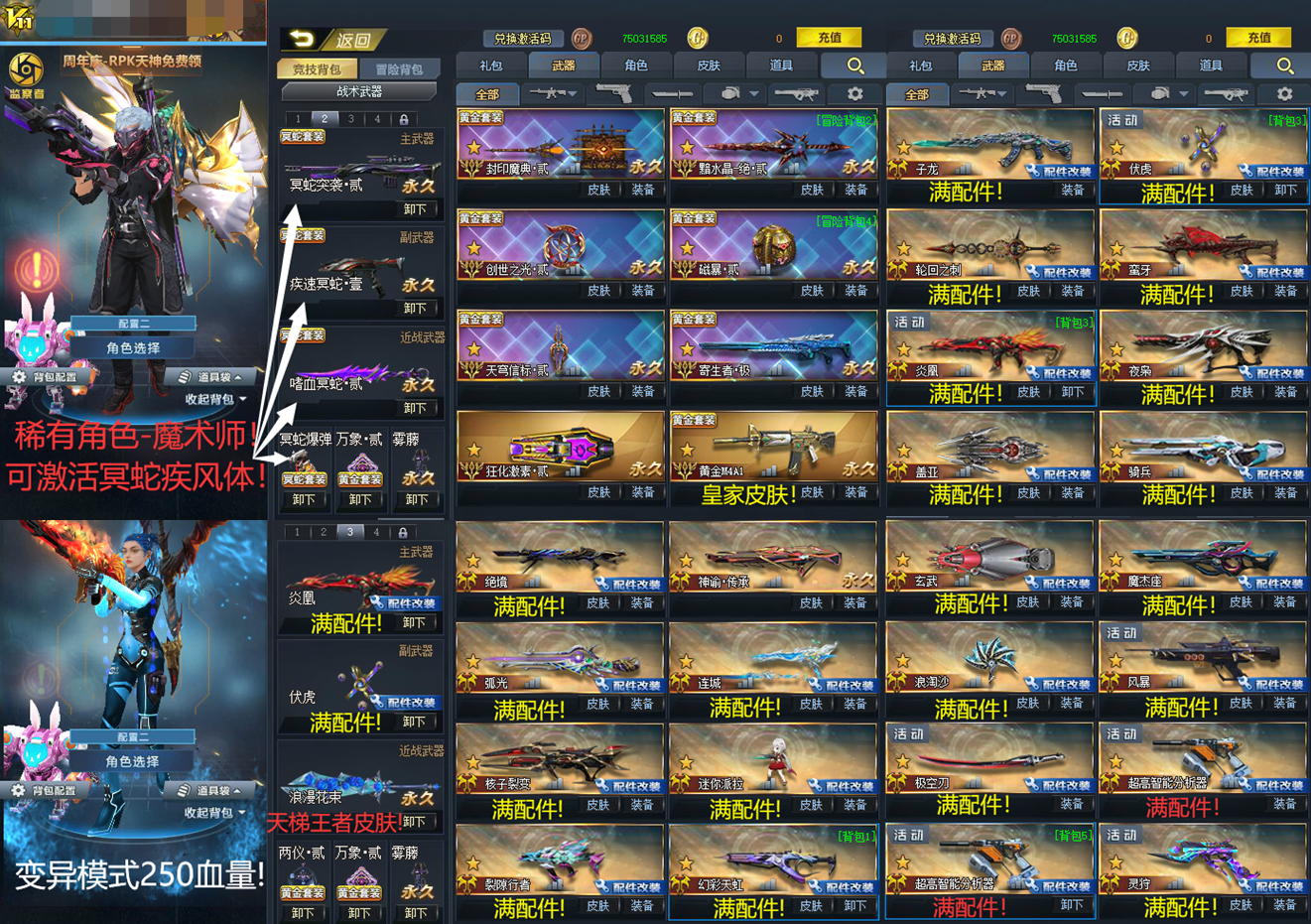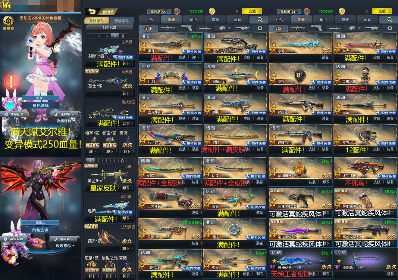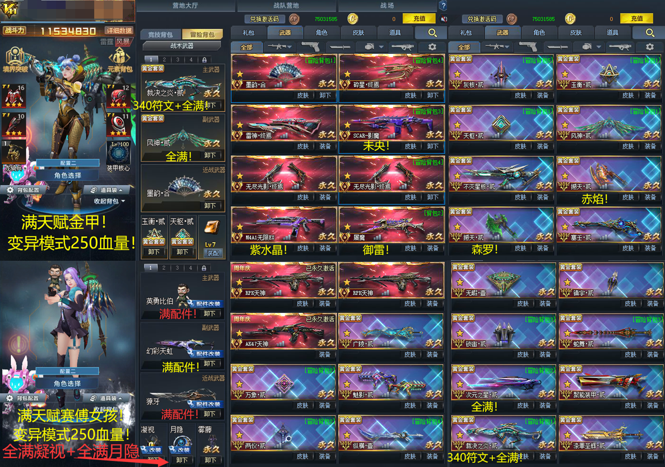 满配件英雄级武器:绝境!弧光!连城!核子裂变!迷你派拉!裂隙行者!幻彩天虹!子龙!伏虎!轮回之刺!蛮牙!炎凰!盖亚!夜枭!骑兵!玄武!摩羯座!浪淘沙!风暴!极空刃!2把全满超高智能分析器!灵狩!全满皮肤幻锋!原石之怒!翎羽!剑鱼行动!含光乘影!瞬影!戏法幻刃!天火使者!伯言!无极极!月隐!创伤星环!玄天!冰河!猎犬!凝视!英勇比伯!致远星!破空!寂静白龙!12原石之力!12虚空连弩!