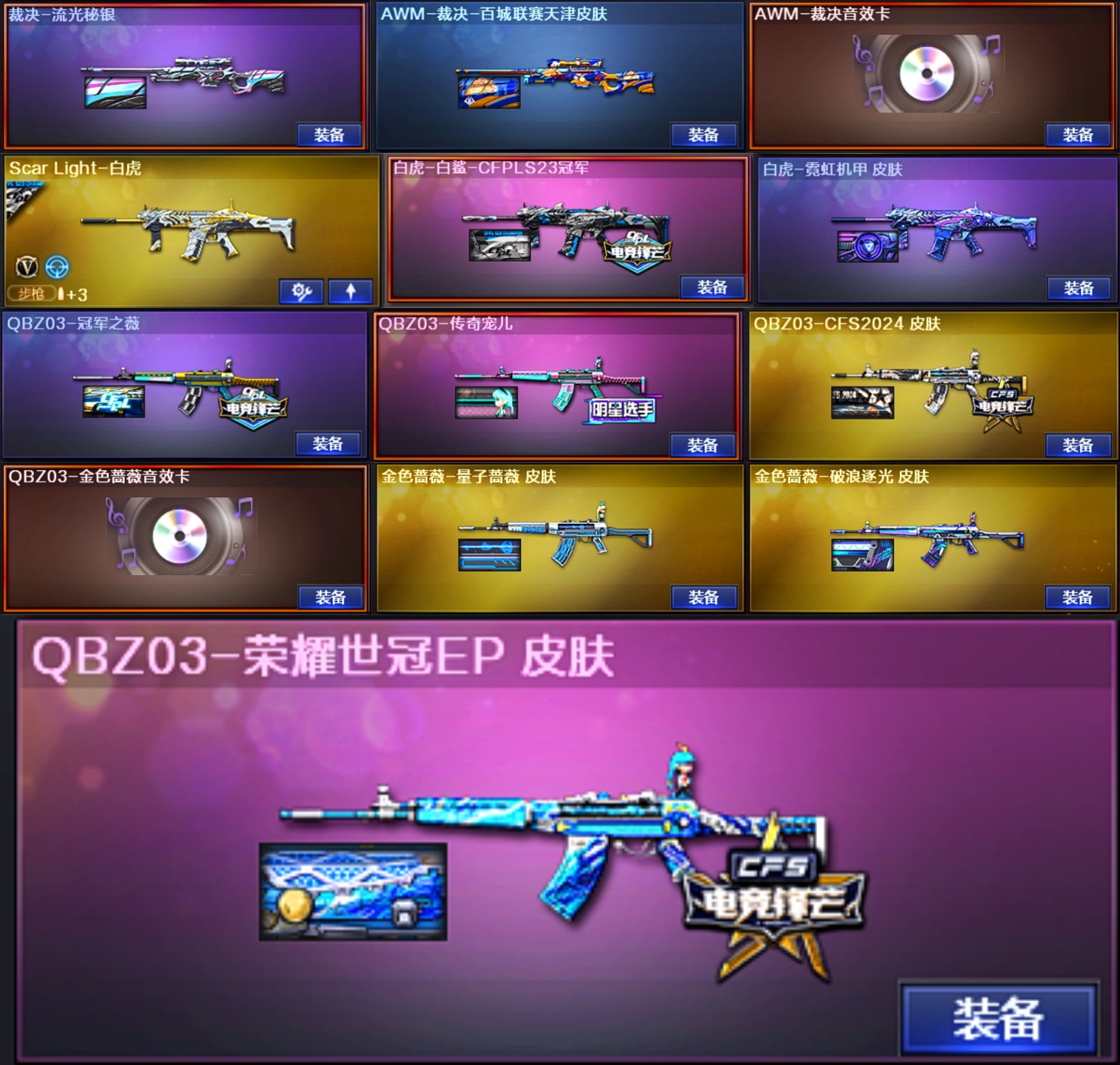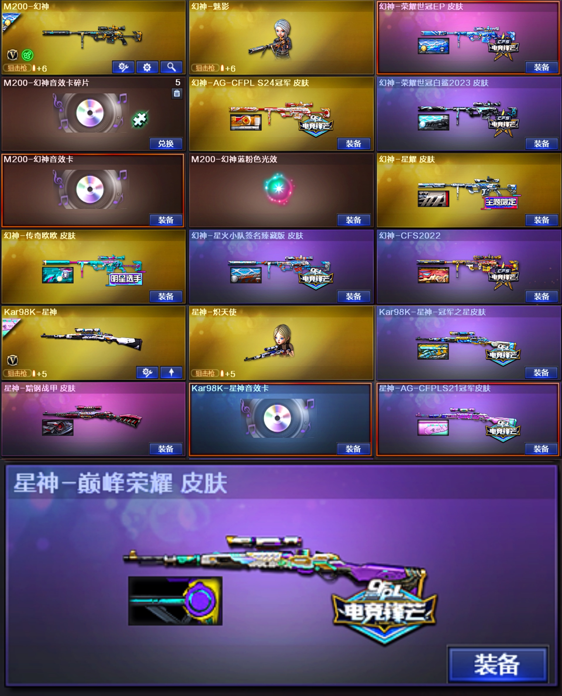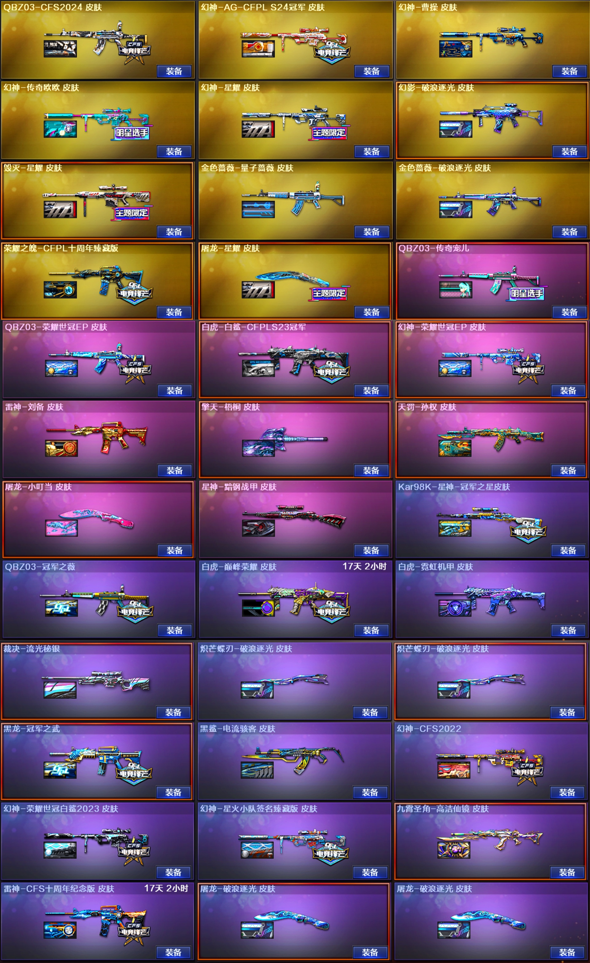 【皮肤】:传奇石头-横秒之巅/幻神-CFS2022/幻神-星火小队签名臻藏版皮肤/火麒麟-心动糖果/毁灭-暗月/毁灭-荣耀之怒/毁灭-SV-CFPLS16冠军/黑龙-冠军之武/黑骑士-冠军之势/Kar98K-星神-冠军之星皮肤/雷神-荣耀之魄/雷神-传奇N9/QBZ03-冠军之薇/QBZ03-传奇宠儿/天神-暗月/屠龙-荣耀之锋/幻神-星耀皮肤/幻神-荣耀世冠白鲨2023皮肤/幻神-曹操皮肤/幻神-传奇欧欧皮肤/幻神-AG-CFPLS24冠军皮肤/幻神-荣耀世冠EP皮肤/白虎-白鲨-CFPLS23冠军/金色蔷薇-量子蔷薇皮肤/QBZ03-CFS2024皮肤/金色蔷薇-破浪逐光皮肤/QBZ03-荣耀世冠EP皮肤/裁决-流光秘银/Kar98K-星神-AG-CFPLS21冠军皮肤/星神-巅峰荣耀皮肤/星神-黯钢战甲皮肤/雷神-暗月/荣耀之魄-CFPL十周年臻藏版/雷神-刘备皮肤/M4A1-再燃火线/毁灭-星耀皮肤/天启-暗月/天罚-孙权皮肤/幻影-破浪逐光皮肤/九霄圣角-高洁仙镜皮肤/炼狱-奇幻宇宙万象/屠龙-星耀皮肤/屠龙-小叮当皮肤/屠龙-破浪逐光皮肤(2)/屠龙-巅峰荣耀皮肤/轻型军用手斧-再燃火线/擎天-梧桐皮肤/炽芒蝶刃-冠军炽芒皮肤/炽芒蝶刃-荣耀世冠白鲨2023皮肤/炽芒蝶刃-破浪逐光皮肤(2)
