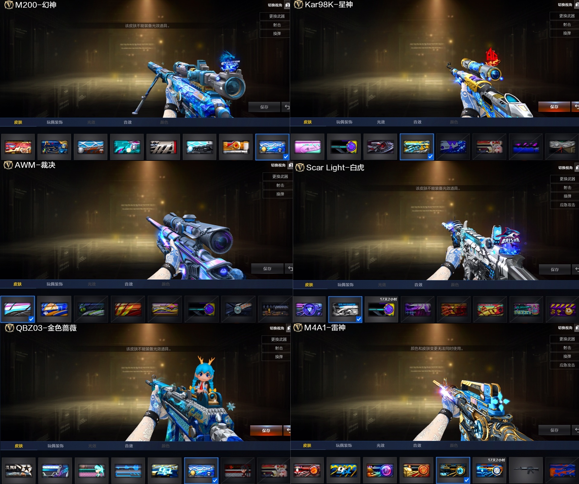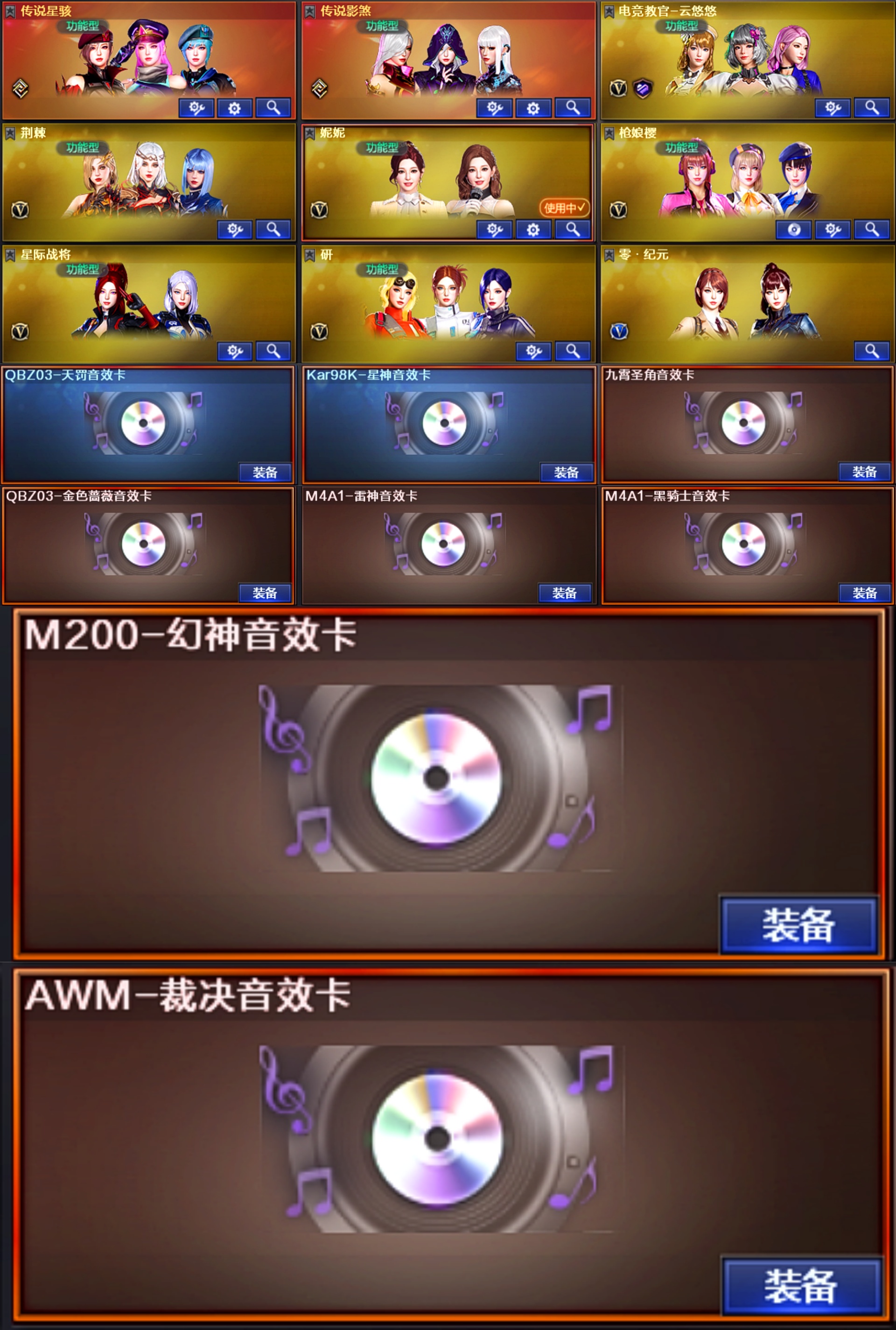 【音效卡】:AWM-裁决音效卡/M200-幻神音效卡/M4A1-黑骑士音效卡/QBZ03-金色蔷薇音效卡/M4A1-雷神音效卡/Kar98K-星神音效卡/枪娘语音包-阿敏/QBZ03-天罚音效卡/九霄圣角音效卡/麒麟刺-百战金芒-盛典舞曲音效卡/炼狱-百战金芒-庆典舞曲音效卡/死神-雪域霜狐-怀旧音效卡/Barrett-毁灭-怀旧音效卡/AWM-昌龙-怀旧音效卡/AK47-火麒麟-怀旧音效卡