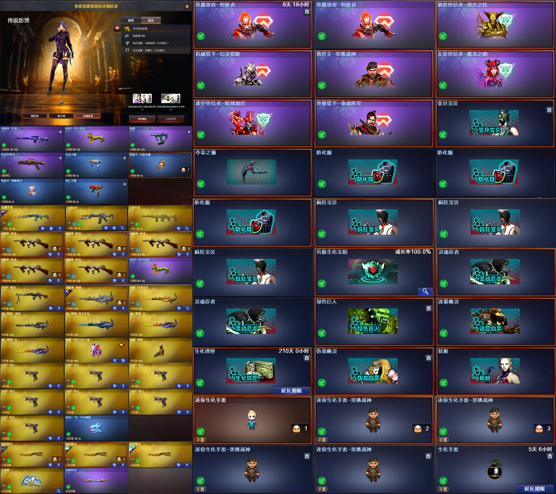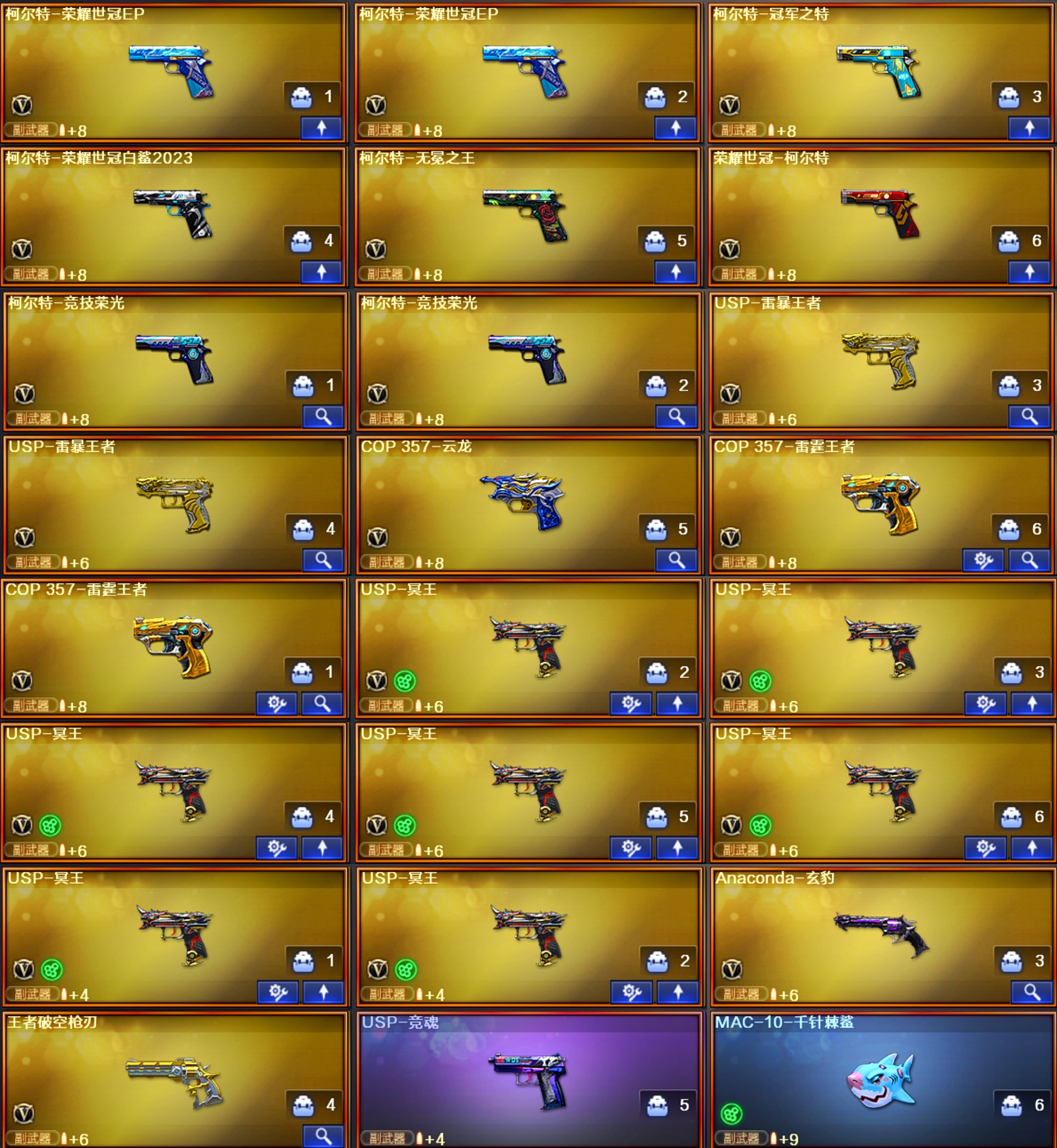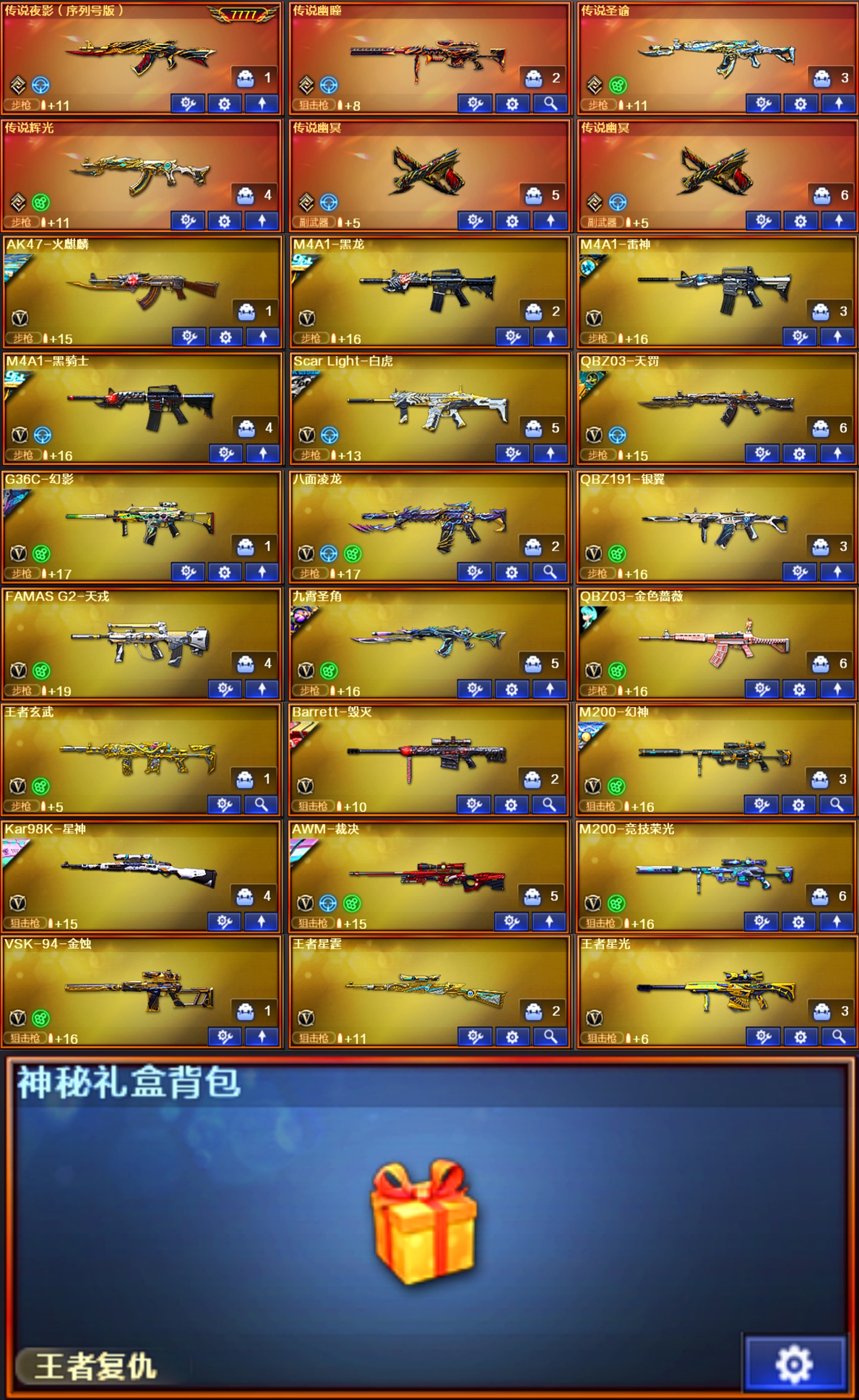 【英雄级武器】:AK47-火麒麟/AK47-无影/AK47-黑武士/AN94-超新星/AWM-裁决/AA-12-雷霆(2)/Barrett-毁灭(2)/炽芒蝶刃(3)/加特林-炼狱/Kar98K-星神/柯尔特-冠军之特/柯尔特-竞技荣光(2)/龙啸(2)/M4A1-黑龙/M4A1-雷神(2)/M4A1-黑骑士/M4A1-死神/M4A1-玫瑰精灵/M200-幻神/M200-竞技荣光/QBZ03-天罚(2)/擎天(3)/擎天-竞技荣光/荣耀世冠-雷神/RPK-盘龙/荣耀世冠-柯尔特/荣耀世冠-龙啸/沙鹰-修罗(2)/沙鹰-天神(2)/汤姆逊-烈龙(5)/屠龙(4)/VSK-94-金蚀/ScarLight-白虎/无影-神兵利器/G36C-幻影/QBZ03-云龙/黑武士-锦绣游龙/八面凌龙/金色蔷薇-古蛇迷踪/FAMASG2-天戎/死神-雪域霜狐/九霄圣角/QBZ03-金色蔷薇/黑骑士-海王/M4A1-雷霆王者-觉醒版/炼狱-百战金芒/COP357-雷霆王者-觉醒版(2)/柯尔特-荣耀世冠白鲨2023/柯尔特-无冕之王/COP357-云龙/USP-冥王(7)/王者破空枪刃-觉醒版/修罗-古蛇迷踪/麒麟刺-百战金芒/丛林匕首-玄豹/高爆手雷-竞技荣光(7)/高爆手雷-云龙(2)/高爆手雷-古蛇迷踪/高爆手雷-玄豹/闪光弹-竞技荣光(7)/闪光弹-云龙(2)/闪光弹-玄豹(2)/闪光弹-雷霆王者-觉醒版(4)/烟雾弹-竞技荣光(6)/烟雾弹-云龙(2)/烟雾弹-古蛇迷踪/烟雾弹-玄豹(7)/烟雾弹-雷霆王者-觉醒版(3)/M4A1-赤狱骑士/M4A1-苍鸣雷神/Barrett-碧霄极光