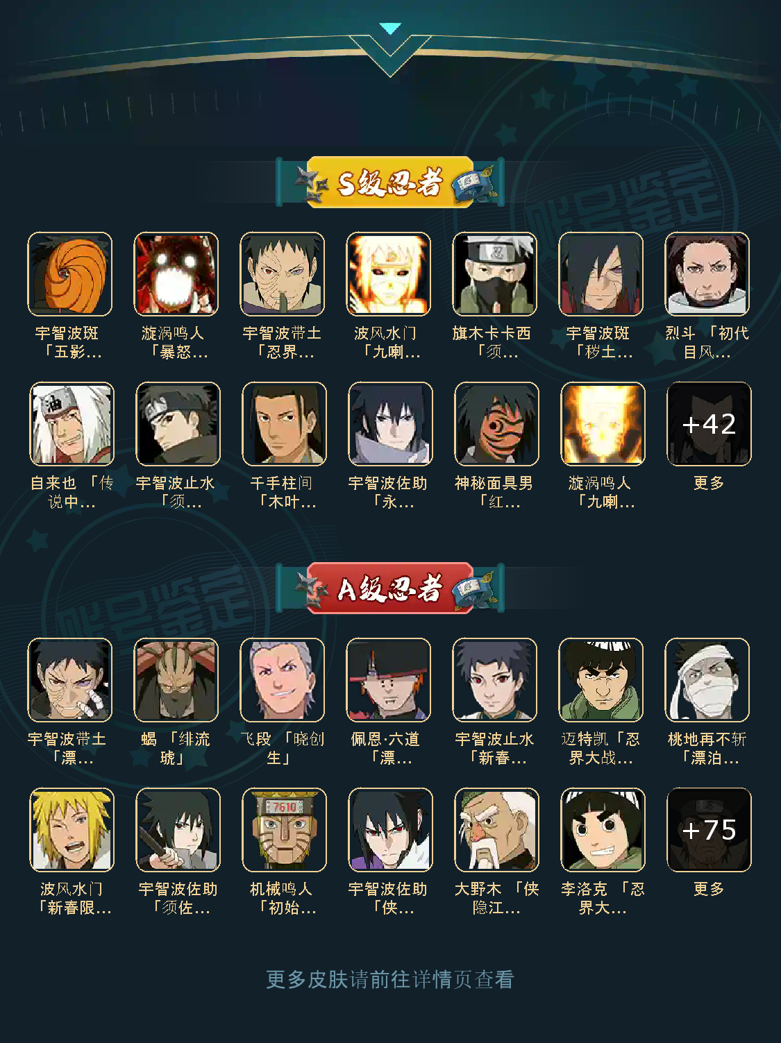仙人自来也 纲手 波风水门 百战水门 猿飞日斩 千手柱间 宇智波斑 宇智波鼬 舞之自来也 大蛇丸 百战大蛇 秽土四代 秽土三代 秽土长门 仙人兜 黄猿九喇嘛鸣人 紫狗永恒佐助 樱婊忍战樱 秽土鼬 普通自来也 百豪纲手 死门凯 二代扉间 秽土二代 秽土初代 秽土柱间 白面具 须佐卡卡西 小胡子鬼灯幻月 雷影 土影 无 佩恩 百战佩恩 青年柱间 创立初代 秽土斑 青年斑 解斑 须佐止水 虎皮 破面带土 红夜带土 罗砂 秽土三代风影 忍战雷影 三代雷影 金角银角 秽土半藏 忍战大野木 小土豆 天道超 大筒木桃式 大筒木金式 钢铁之躯凯 桀骜之刃阿斯玛 狂野之鲨鬼鲛 飞段 黑飞段 百豪樱 忍战李 大卡卡西 五代水影照美冥 宇智波鼬 仙鸣 九尾查克拉鸣人 鹰佐 奇拉比 青年艾 半蛇兜 晓蛇 新春鼬 面麻 须佐佐助 疾风咒印佐助 忍战宁次 忍战天天 最终章雏田 幻容卡卡西 神卡 忍战卡卡西 泳装卡卡西 忍战凯 青春哥 惊门凯 爱情哥 新春止水 新春水门 青年水门 青水 新春我爱罗 泳装照美冥 侠隐照美冥 侠隐纲手 侠隐兜 漂泊再不斩 漂泊佩恩 漂泊二代 漂泊小南 漂泊佩恩 三船 青年三船 青年长门 泳装南 新春南 黑绝 新春大蛇丸 晓创生角度 晓创生蝎 晓创生飞段 泳装鼬 鲛肌融合鬼鲛 新春迪达拉 秽土迪达拉 恶灵之影飞段 暴怒带土 忍战黄土 卑留呼 桃博 黑土